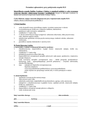 Formularz zgłoszeniowy przy podejrzeniu zespołu SLO Identyfikacja zespołu Smitha, Lemlego i Opitza w populacji polskiej w celu wczesnego wykrycia choroby, efektywnego leczenia i profilaktyki (Projekt Nr PBZ-KBN-122/P05/01-10: Badania nad cz sto ci wyst powania zespołu Smitha, Lemlego i Opitza) Cechy kliniczne, maj ce znaczenie diagnostyczne przy rozpoznawaniu zespołu SLO: (objawy obecne u dziecka prosz podkre li !) I. Posta łagodna: 1. 2. 3. 4. 5. 6. cechy dysmorfii twarzy niewielkiego stopnia, wyra niej zaznaczone w okresie wczesnodzieci cym: krótki nos z zadartym czubkiem, mało uchwie, pojedyncze wady rozwojowe, małogłowie, syndaktylia 2 i 3 palca stóp, w okresie niemowl cym mog wyst powa : zaburzenia od ywiania, słaby przyrost masy ciała, obni one napi cie mi ni, umiarkowane opó nienie rozwoju psycho-motorycznego, trudno ci szkolne, zaburzenia zachowania, prawidłowe st enie cholesterolu w surowicy krwi II. Posta klasyczna i ci ka: a. noworodek z wadami wrodzonymi lub martwo urodzony 1. charakterystyczny, nieprawidłowy wygl d twarzy: zmarszczki nak tne, krótki nos, mało uchwie, 2. syndaktylia 2 i 3 palca stóp, 3. polidaktylia pozaosiowa dłoni i/lub stóp, 4. nieprawidłowo ci zewn trznych narz dów płciowych: małe pr cie, spodziectwo, wn trostwo, narz dy obojnacze, 5. wady rozwojowe narz dów wewn trznych: serce – defekt przegrody przedsionkowokomorowej, nerki - agenezja/hipoplazja, przewód pokarmowy – zw enie od wiernika, choroba Hirschprunga, 6. inne: - małogłowie/ hipotrofia wewn trzmaciczna - hipotonia mi niowa - rozszczep podniebienia/ pod luzówkowy rozszczep podniebienia - niskie st enie nie sprz onego estriolu (uE3) w te cie potrójnym w trakcie ci y b. niemowl /dziecko 1. opó nienie rozwoju psycho-motorycznego, 2. słaby przyrost masy ciała, 3. zaburzenia zachowania: nadpobudliwo psychoruchowa, agresja, cechy autystyczne, 4. małogłowie z charakterystycznyn wygl dem twarzy: opadanie powiek, zmarszczki nak tne, krótki nos, mał uchwie, 5. syndaktylia 2 i 3 palca stóp, 6. nieprawidłowe zewn trzne narz dy płciowe u chłopców, 7. wady wrodzone jak wy ej Imi i nazwisko chorego..........................................................................data urodzenia........................ płe ......................................kariotyp......................................................................................................... Imi i nazwisko lekarza............................................................................................................................ tel/fax..........................……........................................e-mail..................................................................... Adres o rodka kieruj cego...................................................................................................................... .................................................................................................................................................................... Data.................................. O wiadczam, e wyra am zgod na umieszczenie w formularzu zgłoszeniowym przy podejrzeniu zespołu Smitha, Lemlego i Opitza danych osobowych dziecka oraz na przetwarzanie i przechowywanie tych danych w Bazie Danych Polskiego Rejestru Wrodzonych Wad Rozwojowych. Jednocze nie o wiadczam, e zapoznałem/am si z nast puj cymi informacjami: dane te słu do bada nad epidemiologi i etiologi zespołu Smitha, Lemlego i Opitza na terenie Polski i s obj te tajemnic lekarsk ; administratorem danych jest Katedra i Zakład Genetyki Medycznej AM w Poznaniu ul. Grunwaldzka 55 paw. 15, 60-352 Pozna ; rodzice dziecka maj prawo do wgl du, poprawiania i uzupełniania danych osobowych. (Ustawa z dnia 29 sierpnia 1997 r. o ochronie danych osobowych). .......................................................................... Podpis rodzica