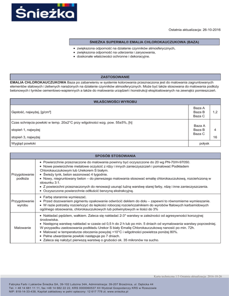 Ostatnia aktualizacja: 26-10-2016 ŚNIEŻKA SUPERMAL® EMALIA CHLOROKAUCZUKOWA (BAZA) zwiększona odporność na działanie czynników atmosferycznych, ŚNIEŻKA_SUPERMAL®_EMALIA_CHLOROKAUCZUKOWA_(BAZA) zwiększona odporność na uderzenia i zarysowania, doskonałe właściwości ochronne i dekoracyjne. ZASTOSOWANIE EMALIA CHLOROKAUCZUKOWA Baza po zabarwieniu w systemie kolorowania przeznaczona jest do malowania zagruntowanych elementów stalowych i żeliwnych narażonych na działanie czynników atmosferycznych. Może być także stosowana do malowania podłoży betonowych i tynków cementowowapiennych a także do malowania urządzeń i konstrukcji eksploatowanych na zewnątrz pomieszczeń. WŁAŚCIWOŚCI WYROBU Gęstość, najwyżej, [g/cm³] Baza A Baza B Baza C 1,2 Baza A Baza B Baza C 4 Czas schnięcia powłoki w temp. 20±2°C przy wilgotności wzg. pow. 55±5%, [h] stopień 1, najwyżej stopień 3, najwyżej 16 Wygląd powłoki połysk SPOSÓB STOSOWANIA Przygotowanie podłoża Powierzchnie przeznaczone do malowania powinny być oczyszczone do 20 wg PN70/H97050. Nowe powierzchnie metalowe oczyścić z rdzy i innych zanieczyszczeń i pomalować Podkładem Chlorokauczukowym lub Urekorem S białym. Świeży tynk, beton sezonować 4 tygodnie. Nowy, niegruntowany beton – do pierwszego malowania stosować emalię chlorokauczukową, rozcieńczoną w stosunku 3:1. Z powierzchni przeznaczonych do renowacji usunąć luźną warstwę starej farby, rdzę i inne zanieczyszczenia. Oczyszczone powierzchnie odtłuścić benzyną ekstrakcyjną. Przygotowanie wyrobu Farbę starannie wymieszać. Przed dozowaniem pigmentu opakowanie odwrócić deklem do dołu – zapewni to równomierne wymieszanie. W razie potrzeby rozcieńczyć do lepkości roboczej rozcieńczalnikiem do wyrobów ftalowych karbamidowych ogólnego stosowania, chlorokauczukowych lub poliwinylowych w ilości do 3% Malowanie Nakładać pędzlem, wałkiem. Zaleca się nakładać 23* warstwy w zależności od agresywności korozyjnej środowiska. Następną warstwę nakładać w czasie od 0,5 h do 2 h lub po min. 5 dniach od wymalowania warstwy poprzedniej. W przypadku zastosowania podkładu Urekor S biały Emalię Chlorokauczukową nanosić po min. 72h. Malować w temperaturze otoczenia powyżej +10°C i wilgotności powietrza poniżej 80%. Pełne utwardzenie powłoki następuje po 7 dniach. Zaleca się nałożyć pierwszą warstwę o grubości ok. 35 mikronów na sucho. Karta techniczna 1/3 Ostatnia aktualizacja: 2016-10-26 Fabryka Farb i Lakierów Śnieżka SA, 39102 Lubzina 34A, Administracja: 39207 Brzeźnica, ul. Dębicka 44 Tel. + 48 14 681 11 11, fax +48 14 682 22 22, KRS 0000060537 XII Wydział Gospodarczy KRS w Rzeszowie NIP: 8181433438, Kapitał zakładowy w pełni opłacony: 12 617 778 zł, www.sniezka.pl Wysychanie powłoki emalii uzależnione jest od czynników zewnętrznych takich jak: temperatura, wilgotność, cyrkulacja powietrza, a także od grubości warstwy i koloru. Przed nałożeniem drugiej warstwy metodą drugą (tj. dopiero po min. 5 dniach) każdorazowo należy wykonać wymalowanie próbne, tj. sprawdzić na małej powierzchni możliwość nałożenia tej warstwy. Jeżeli w ciągu 15 minut od Uwagi wykonania próbnego wymalowania nie wystąpią wady powłoki w postaci pomarszczeń, malowanie można kontynuować. ŚNIEŻKA_SUPERMAL®_EMALIA_CHLOROKAUCZUKOWA_(BAZA) Nakładanie kolejnych warstw w niewłaściwym czasie spowoduje pomarszczenie powłoki. *w przypadku niektórych kolorów może wystąpić konieczność wymalowania kolejnych warstw Pomieszczenia w którym zastosowano wyrób lub elementy malowane wyrobem należy wietrzyć do zaniku zapachu i po tym okresie nadają się do użytkowania. PARAMETRY MALOWANIA DLA POSZCZEGÓLNYCH METOD PARAMETRY MALOWANIA METODY MALOWANIA Pędzel, wałek lepkość farby dodatek rozcieńczalnika średnica dyszy pistoletu ciśnienie natrysku [s] [%] [mm] [MPa] postać handlowa do 3 - - zalecana ilość warstw 2-3 OKRES PRZYDATNOŚCI OKRES PRZYDATNOŚCI: 12 miesięcy od daty produkcji puszki metalowe: Baza A: 940 ml; 2,82 L; 9,4 L OPAKOWANIA: Baza B: 900 ml; 2,7 L; 9 L Baza C: 900 ml; 2,7 L; 9 L WYDAJNOŚĆ: do 12 m²/L przy jednokrotnym malowaniu DOSTĘPNE KOLORY: system kolorowania RAL OPAKOWANIA 900ml, 2,7L, 9L WYDAJNOŚĆ do 12m²/l przy jednokrotnym malowaniu KOLORYSTYKA ok. 180 kolorów wg notacji RAL LZO Limit zawartości LZO dla tego produktu:(kat. A/i/FR/; 500g/l(2010). Produkt zawiera max. 500g/l NORMY, BADANIA I ATESTY PNC81910:2002, rodzaj III A nawierzchniowe ogólnego stosowania PNC81910:2002, rodzaj III A nawierzchniowe ogólnego stosowania WSKAZÓWKI BHP I PPOŻ BEZPIECZEŃSTWO: Zawiera: ksylen. Zawiera oksym butan2onu, produkt reakcji bisfenolu A z epichlorohydryną (MW < 700). Może powodować wystąpienie reakcji alergicznej. Łatwopalna ciecz i pary. Działa drażniąco na oczy. Działa drażniąco na skórę. Może powodować uszkodzenie narządów poprzez długotrwałe lub narażenie powtarzane. W razie konieczności zasięgnięcia porady lekarza Karta techniczna 2/3 Ostatnia aktualizacja: 2016-10-26 Fabryka Farb i Lakierów Śnieżka SA, 39102 Lubzina 34A, Administracja: 39207 Brzeźnica, ul. Dębicka 44 Tel. + 48 14 681 11 11, fax +48 14 682 22 22, KRS 0000060537 XII Wydział Gospodarczy KRS w Rzeszowie NIP: 8181433438, Kapitał zakładowy w pełni opłacony: 12 617 778 zł, www.sniezka.pl należy pokazać pojemnik lub etykietę. Chronić przed dziećmi. Stosować rękawice ochronne/odzież ochronną/ochronę oczu/ochronę twarzy. W PRZYPADKU KONTATKU ZE SKÓRĄ (lub z włosami): Natychmiast zdjąć całą zanieczyszczoną odzież. Spłukać skórę pod strumieniem wody/prysznicem. W PRZYPADKU DOSTANIA SIĘ DO OCZU: Ostrożnie płukać wodą przez kilka minut. Wyjąć soczewki kontaktowe, jeżeli są i można je łatwo usunąć. Nadal płukać. Zawartość/pojemnik usuwać do zbiorników do segregacji odpadów obecnych w swojej gminie. Temperatura prz