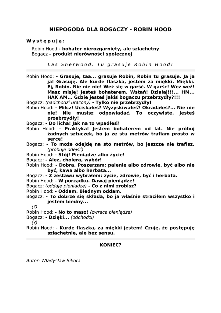 NIEPOGODA DLA BOGACZY - ROBIN HOOD Występują: Robin Hood - bohater nierozgarnięty, ale szlachetny Bogacz - produkt nierówności społecznej Las Sherwood. Tu grasuje Robin Hood! Robin Hood: - Grasuje, taa... grasuje Robin, Robin tu grasuje. Ja ja ja! Grasuję. Ale kurde flaszka, jestem za miękki. Miękki. Ej, Robin. Nie nie nie! Weź się w garść. W garść! Weź weź! Masz misję! Jesteś bohaterem. Wstań! Działaj!!!... HM... HAK AM... Gdzie jesteś jakiś bogaczu przebrzydły?!!! Bogacz: (nadchodzi urażony) - Tylko nie przebrzydły! Robin Hood: - Milcz! Uciskałeś? Wyzyskiwałeś? Okradałeś?... Nie nie nie! Nie musisz odpowiadać. To oczywiste. Jesteś przebrzydły! Bogacz: - Do licha! Jak na to wpadłeś? Robin Hood: - Praktyka! Jestem bohaterem od lat. Nie próbuj żadnych sztuczek, bo ja ze stu metrów trafiam prosto w serce! Bogacz: - To może odejdę na sto metrów, bo jeszcze nie trafisz. (próbuje odejść) Robin Hood: - Stój! Pieniądze albo życie! Bogacz: - Ależ, cholera, wybór! Robin Hood: - Dobra. Poszerzam: palenie albo zdrowie, być albo nie być, kawa albo herbata... Bogacz: - Z zestawu wybrałem: życie, zdrowie, być i herbata. Robin Hood: - W porządku. Dawaj pieniądze! Bogacz: (oddaje pieniądze) - Co z nimi zrobisz? Robin Hood: - Oddam. Biednym oddam. Bogacz: - To dobrze się składa, bo ja właśnie straciłem wszystko i jestem biedny... (?) Robin Hood: - No to masz! (zwraca pieniądze) Bogacz: - Dzięki... (odchodzi) (?) Robin Hood: - Kurde flaszka, za miękki jestem! Czuję, że postępuję szlachetnie, ale bez sensu. KONIEC? Autor: Władysław Sikora
