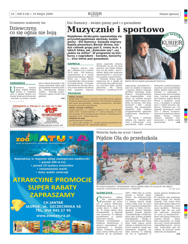 POWIATOWY KURIER NR 9 (9) • 19 MAJA 2009 Dziewczyny, co się ognia nie boją Dni Damnicy - święto gminy pod i z gwiazdami Muzycznie i sportowo OD NAS Z Y M Wyjątkowo atrakcyjnie zapowiadają się przyszłotygodniowe obchody święta gminy - Dni Damnicy. Gwiazdą imprezy będzie piosenkarz Bartek Wrona, kiedyś członek grupy Just 5, znany m.in. z takich hitów, jak „Kolorowe sny”, czy „Jedna na milion”. W programie są konkursy z nagrodami - karaoke, koncerty i... kino letnie pod gwiazdami. POWIATOWY KURIER P A S ŁU P S K I TR M Uczennice uratowały las Nasze sprawy S ŁU P S K I P 10 O N AT E DAMNICA Fot. Archiwum mamy naprawdę ciekawy. Staraliśmy się go tak przyImpreza potrwa trzy gotować, aby każdy znalazł dni i odbędzie się w dniach tam coś dla siebie - starsi i 29-31 maja. - Dni Damnicy młodsi. Będą więc konkursy organizowane są w naszej sprawnościowe i muzyczne gminie od niedawna, dopiero oraz stoiska z gastronomią. trzeci raz - mówi Paweł Obchody święta gminy Bartek Wrona będzie gwiazdą Dni Damnicy. Lewandowski z biura promo- rozpoczną się w piątek od cji Urzędu Gminy. - To święto uroczystej sesji, podczas któmieszkańców, chcemy, aby w rej wręczone będą medale bokserski, na których pojawi zapraszamy mieszkańców i tym czasie dobrze się bawili, „Zasłużony dla Gminy się jedna z gwiazd polskiego gości na stadion w Damnicy stąd program imprezy Damnica”. - O godzinie 20.30 - zaprasza Michał Folusiak, boksu, będzie także turniej karaoke z nagrodami i dyrektor Gminnego Domu PROGRAM zabawa taneczna do białego Kultury. - Przygotowaliśmy tam niespodziankę - kino rana. Gościem specjalnym Piątek, 29 maja letnie, na wielkim ekranie Dni Damnicy będzie Bartek Zespół Szkół w Damnicy: uroczysta sesja Rady Gminy, nadanie obejrzeć będzie można dwa Wrona z zespołem, znany tytułów zasłużony dla gminy Damnica; 20.30 stadion w Damnicy: fi lmy: hit kinowy „Nie kłam m.in. z występów w zespole kino letnie pod gwiazdami - komedia romantyczna: „Nie kłam kochanie” i fi lm - niespo- Just 5 i takich utworów, jak: kochanie” oraz fi lm niespodzianka dziankę. Aby przyjemność „Maria”, „Kolorowe sny”, czy Sobota, 30 maja w Damnicy oglądania była większa, piosenki promującej serial stadion sportowy: 13 - otwarcie imprezy, 13.13 - spartakiada przygotowaliśmy specjalne TVP 2 „Barwy szczęścia”. szkół; 15.00 - turniej bokserski; 17 - turniej rodzinny; 19 - konnagłośnienie, oświetlenie i Podczas trzydniowej zabawy kurs karaoke; 20.30 występ gwiazdy wieczoru - Bartek Wrona z krzesła. będzie można wygrać zespołem; 22-01 - zabawa taneczna ciekawe nagrody oraz W sobotę i niedzielę Niedziela 31 maja odbędą się imprezy spor- skorzystać z oferty małej stadion sportowy w Damnicy ach towe i rekreacyjne - m.in. gastronomii. 12 - mecze piłki nożnej; 14 - zawody sportowo-pożarnicze; 16 spartakiada szkół, turniej - zawody strong man; 19 - zakończenie imprezy SIEMIANICE U czennice trzeciej klasy Szkoły Podstawowej w Siemianicach w gminie Słupsk uratowały lasek przed pożarem - wezwały na pomoc strażaR E K L A M A R E K L A M A ków. Izabela Żeromska i Ola Łęcka zauważyły ogień, gdy przejeżdżały rowerem przez las. Zareagowały bardzo szybko - wezwały pomoc. Gaszenie ognia trwało trzy godziny. kol Maluchy będą się uczyć i bawić Pójdzie Ola do przedszkola W ramach programu „Przedszkolak” dzieci jeździły także na wycieczki. Na zdjęciu maluchy z Cecenowa na wycieczce w Czołpinie. Fot. Mat. gminy GŁÓWCZYCE C zternaście oddziałów przedszkolnych powstanie od września w gminie Główczyce. Bezpłatnie będą się w nich uczyły dzieci w wieku 3-5 lat. To druga edycja akcji „Przedszkolak”, w poprzedniej utworzono 33 oddziały przedszkolne w gminie Główczyce i Wicko. Program „Przedszkolak” Edukacja elementarna w miejscu zamieszkania” jest finansowany z Europejskiego Funduszu Społecznego. Gmina Główczyce realizowała go na przełomie 2007 i 2008 roku na swoim terenie i terenie gminy Wicko. - Na realizację tego programu otrzymaliśmy 1,5 miliona złotych, dzięki czemu udało nam się otworzyć 33 punkty przedszkolne dla dzieci w wieku 3-5 lat opowiada Dorota Sibińska, dyrektor Zespołu Szkolno – Przedszkolnego w Żelkowie, która była autorką projektu „Przedszkolak”. - Wzięło w nim udział ponad 360 dzieci, które miały zajęcia przedszkolne w szkołach lub świetlicach wiejskich. Dzięki tym pieniądzom mogliśmy nie tylko otworzyć te oddziały, ale też je wyposażyć w sprzęt, pomoce dydaktyczne i zabawki. Po sukcesie tego programu gmina kolejny raz złożyła wniosek. Tym razem otrzymała około milion złotych na dwa lata działalności czternastu punktów. - Pierwsza edycja była dla nas wielkim sukcesem, uznaliśmy, że warto ją kontynuować mówi wójt gminy Główczyce Czesław Kosiak. - Dzieci były zadowolone, bo mogły się uczyć i bawić pod opieką wykwalifikowanych nauczycieli. Zadowoleni byli też rodzice, bo przecież nauka odbywała się bezpłatnie. ach