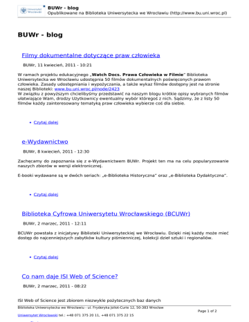 BUWr - blog Opublikowane na Biblioteka Uniwersytecka we Wrocławiu (http://www.bu.uni.wroc.pl) BUWr - blog Filmy dokumentalne dotyczące praw człowieka BUWr, 11 kwiecień, 2011 - 10:21 W ramach projektu edukacyjnego „Watch Docs. Prawa Człowieka w Filmie” Biblioteka Uniwersytecka we Wrocławiu udostępnia 50 filmów dokumentalnych poświęconych prawom człowieka. Zasady udostępniania i wypożyczania, a także wykaz filmów dostępny jest na stronie naszej Biblioteki: www.bu.uni.wroc.pl/node/2423 W związku z powyższym chcielibyśmy przedstawić na naszym blogu krótkie opisy wybranych filmów ułatwiające Wam, drodzy Użytkownicy ewentualny wybór któregoś z nich. Sądzimy, że z listy 50 filmów każdy zainteresowany tematyką praw człowieka wybierze coś dla siebie. Czytaj dalej e-Wydawnictwo BUWr, 8 kwiecień, 2011 - 12:30 Zachęcamy do zapoznania się z e-Wydawnictwem BUWr. Projekt ten ma na celu popularyzowanie naszych zbiorów w wersji elektronicznej. E-booki wydawane są w dwóch seriach: „e-Biblioteka Historyczna” oraz „e-Biblioteka Dydaktyczna”. Czytaj dalej Biblioteka Cyfrowa Uniwersytetu Wrocławskiego (BCUWr) BUWr, 2 marzec, 2011 - 12:11 BCUWr powstała z inicjatywy Biblioteki Uniwersyteckiej we Wrocławiu. Dzięki niej każdy może mieć dostęp do najcenniejszych zabytków kultury piśmienniczej, kolekcji dzieł sztuki i regionaliów. Czytaj dalej Co nam daje ISI Web of Science? BUWr, 2 marzec, 2011 - 08:22 ISI Web of Science jest zbiorem niezwykle pożytecznych baz danych Biblioteka Uniwersytecka we Wrocławiu - ul. Fryderyka Joliot-Curie 12, 50-383 Wrocław Uniwersytet Wrocławski tel.: +48 071 375 20 11, +48 071 375 22 15 Page 1 of 2 BUWr - blog Opublikowane na Biblioteka Uniwersytecka we Wrocławiu (http://www.bu.uni.wroc.pl) Czytaj dalej Personalizacja witryny BUWr BUWr, 1 marzec, 2011 - 09:32 Chcielibyśmy zachęcić czytelników Biblioteki Uniwersyteckiej we Wrocławiu do skorzystania z możliwości personalizacji witryny naszej Biblioteki. Oferujemy taką możliwość wszystkim użytkownikom posiadającym aktywne konto czytelnicze w bazie BUWr. Czytaj dalej Witamy! BUWr, 1 marzec, 2011 - 09:30 Witamy na blogu Biblioteki Uniwersyteckiej we Wrocławiu. Czytaj dalej Adres źródła: http://www.bu.uni.wroc.pl/blogi/buwr Biblioteka Uniwersytecka we Wrocławiu - ul. Fryderyka Joliot-Curie 12, 50-383 Wrocław Uniwersytet Wrocławski tel.: +48 071 375 20 11, +48 071 375 22 15 Page 2 of 2