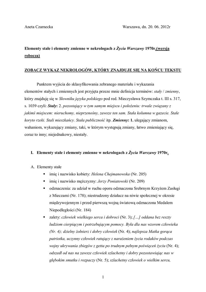 Aneta Czarnecka Warszawa, dn. 20. 06. 2012r Elementy stałe i elementy zmienne w nekrologach z Życia Warszawy 1970r.(wersja robocza) ZOBACZ WYKAZ NEKROLOGÓW, KTÓRY ZNAJDUJE SIĘ NA KOŃCU TEKSTU Punktem wyjścia do sklasyfikowania zebranego materiału i wykazania elementów stałych i zmiennych jest przyjęta przeze mnie definicja terminów: stały / zmienny, który znajduję się w Słowniku języka polskiego pod red. Mieczysława Szymczaka t. III s. 317, s. 1039 czyli: Stały: 2. pozostający w tym samym miejscu i położeniu: trwale związany z jakimś miejscem: nieruchomy, nieprzenośny, zawsze ten sam. Stała kolumna w gazecie. Stałe koryto rzeki. Stali mieszkańcy. Stała publiczność itp. Zmienny: 1. ulegający zmianom, wahaniom, wykazujący zmiany, taki, w którym występują zmiany, łatwo zmieniający się, coraz to inny; niejednakowy, niestały. I. Elementy stałe i elementy zmienne w nekrologach z Życia Warszawy 1970r. A. Elementy stałe imię i nazwisko kobiety: Helena Chejmanowska (Nr. 205) imię i nazwisko mężczyzny: Jerzy Poniatowski (Nr. 209) odznaczenia: za udział w ruchu oporu odznaczona Srebrnym Krzyżem Zasługi z Mieczami (Nr. 178); niestrudzony działacz na niwie społecznej w okresie międzywojennym i przed pierwszą wojną światową odznaczona Medalem Niepodległości (Nr. 184) zalety: człowiek wielkiego serca i dobroci (Nr. 3); […] oddana bez reszty ludziom cierpiącym i potrzebującym pomocy. Była dla nas wzorem człowieka (Nr. 4); dzielny żołnierz i dobry człowiek (Nr. 4); najlepsza Matka gorąca patriotka, uczynny człowiek ratujący z narażeniem życia rodaków podczas wojny ukrywania zbiegów z getta po trudnym pełnym poświęceń życiu (Nr. 4); odszedł od nas na zawsze człowiek szlachetny i dobry pozostawiając nas w głębokim smutku i rozpaczy (Nr. 5); szlachetny człowiek o wielkim sercu, 1 utalentowany twórca, niestrudzony popularyzator polskiej muzyki ludowej (Nr. 7) odszedł od nas ukochany Mąż, Ojciec i Dziadek człowiek wielkiego serca, rozumu i nieskazitelnego charakteru (Nr. 9); odszedł człowiek wielkiego serca i dobroci (Nr. 12); odszedł człowiek wielkiego serca i dobroci (Nr. 12), w Zmarłym tracimy najlepszego, serdecznego kolegę, którego prawość, ofiarność i siła ducha była nam wzorem (Nr. 100), wspaniały Człowiek i nieugięty żołnierz w walce o wolność Polski (Nr. 132), gorąca patriotka-Polka najlepsza Matka i Babcia (Nr. 131), toponimy stanowią istotną część nekrologu bowiem informują o miejscu: urodzenia: ur. w 1890 w Chrzanówce na Podolu (Nr. 2), ur. 29.V.1868r w Tobolsku (Nr. 5), ur. w Chrystynówce na Podolu (Nr.9), ur. w Jakimowcach na Wołyniu (Nr. 5), ur. 12. XII. 1895r w Medyngianach na Żmudzi (Nr. 9), ur. 21.12.1899r w Grotowicach pow. rawski, urodzony w Pianowie ziemi pułtuskiej (Nr. 22), ur. dn. 29.7.1902r w Brześciu n/Bugiem, ur. 15 stycznia 1884r we wsi Matczyn pow. lubelski, urodzona w Raszynie ziemi płockiej (Nr. 60), urodzona w Szumsku na Wileńszczyźnie (Nr. 65), ur. w Aczyńsku-Rosja (Nr. 74/75), urodzona 8.XI.1905r w Pawłówce na Ukrainie (Nr. 86), urodzony w roku 1889 w Samorodku na Ukrainie (Nr. 88), ur. 12.VIII.1895r w Poszlakach w Zbaraskim na Podolu, miejsca zamieszkania: z Bogusławic Ziemi Opatowskiej (Nr. 26), z Czarnolasu ziemi kijowskiej (Nr. 35), miejsca śmierci: zmarła nagle w Aninie (Nr. 12), pochowany w grobie rodzinnym w Grabinie pow. Łask (Nr. 12), zmarła w Gdańsku-Oliwie (Nr. 13), zmarł nagle w Los Angeles […] spocznie w ziemi Ojczystej w grobie rodzinnym w Lekowie, zmarł nagle w Krynicy Zdroju (Nr. 26), zmarł nagle w sanatorium Lądek Zdrój (Nr. 49), zmarł nagle w Ostrowie k/Kielc (Nr. 56), przynależność do AK, pełniona funkcja wojskowa, udział w Powstaniu Warszawskim i pobyt w obozach koncentracyjnych: b. więzień obozów niemieckich, żołnierz AK (Nr. 1); b. żołnierz AK, uczestnik Powstania Warszawskiego (Nr.3), oficer rezerwy, uczestnik walk o Niepodległość Polski (Nr. 2)…………………………………………………………………….. w większości badanych anonsów nadawcy wyrażali stan emocjonalny w przyjętym zwrocie: pogrążeni w głębokim smutku (Nr. 3) B. Elementy zmienne 2 identyfikacja kobiet: a) podanie imienia i nazwiska rodowego z przyimkiem z np.: z Bacciarellich Zdzisława Dunin-Borkowska (Nr. 60), Zofia Galewska z domu Schmidt (Nr. 12) Władysława z Pobóg-Górskich oraz podwójnego i potrójnego imienia zmarłej: Leokadia, Anna Przybyszewska z domu Adamska (Nr. 12), Maria Antonina Chudek z domu Nerr (Nr. 1), Halina Wacława Mikucka z domu Mokawska (Nr. 2), Danuta, Sławomira, Janina Skarżewska z domu Szczubiał (Nr. 55), Janina, Regina, Antonina Zienkiewiczowa zd. Rychter (Nr. 132); podwójnego nazwiska zmarłej: Irena GrywińskaAdwentowiczowa (Nr. 1), Zofia Piotrkowska z domu Łachowicka-Czechowicz (Nr. 4), Maria Dukatowa-Miłakowska z domu Gawlikowska (Nr. 66); b) przywołanie imienia i nazwiska męża, które kończyło się sufiksem -owa lub – owej oraz przydomka np.: Jadwiga z Sienkiewiczów Tadeuszowa Korniłowiczowa (Nr. 1), z Boczkowskich Wanda Emilowa Macielińska (Nr. 118), Władysława z Pobóg-Górskich Karolowa Wójcicka (Nr. 59), a także potrójnego imienia zmarłej: Maria Halina Zofia ze Szenkierów Andrzejowa Kochanowska (Nr. 13); c) przywołanie łacińskiej formuły primo voto, secundo voto: z Achmatowiczów Maria Romańska I voto Sutkiewicz II voto Strumiłło (Nr. 2), Helena Pawłowska z Wysokich I voto Bendarzewska (Nr. 61), Maria z Sachow Eugeniuszowa Dąmbska I voto Wawrzyniakowa (Nr. 65), Helena Dorgiman I voto Weichman z domu Białynia Rzepecka (Nr. 122), Zofia z Jastrzębiec Żakowska Szreniawa-Szypowska (Nr. 131), Zofia Stefania Ossowiecka ze Skibińskich I voto Gustawowa Świdowa (Nr. 149), Helena z Gdomskich I voto Baronowska II voto Łopacińska (Nr. 166), d) rzadko podawane panieńskie nazwisko zmarłej zakończone sufiksem –ówna: Ewa Wronówna stan