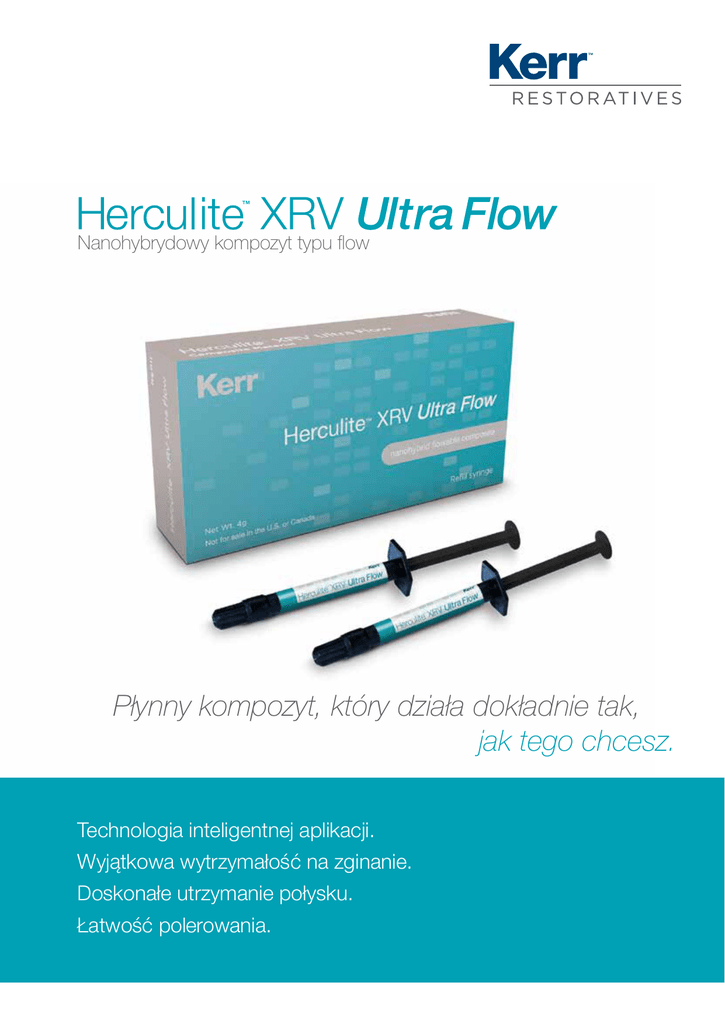 Nanohybrydowy kompozyt typu flow Płynny kompozyt, który działa dokładnie tak, jak tego chcesz. Technologia inteligentnej aplikacji. Wyjątkowa wytrzymałość na zginanie. Doskonałe utrzymanie połysku. Łatwość polerowania. Najdoskonalszy płynny kompozyt. Najdoskonalsze dopasowanie. Technologia inteligentnej aplikacji Posiadanie lepkości, która umożliwia zapływanie do wszystkich wewnętrznych szczelin oraz zagłębień i, jednocześnie, zachowanie kształtu, może wydawać się niemożliwe w odniesieniu do płynnych kompozytów. Herculite XRV Ultra Flow zawiera specjalny modyfikator reologiczny, który zmniejsza napięcie powierzchniowe materiału pod wpływem nacisku, gwarantując jego zapływanie w ubytku. Ten sam modyfikator powoduje zwiększenie napięcia powierzchniowego kompozytu po aplikacji, zapewniając mu utrzymanie nadanego kształtu do momentu utwardzenia światłem lampy. Podkład base/liner Zdjęcia dzięki uprzejmości dr. Boba Lowe’a. Perfekcyjny duet Marka Herculite stosowana jest z powodzeniem od dziesięcioleci. Teraz materiał Herculite XRV Ultra Flow łączy wieloletnie doświadczenie marki Herculite z nowym, innowacyjnym płynnym kompozytem. Właściwości tego produktu są doskonale dopasowane do estetyki i odporności materiału Herculite XRV Ultra. Linia produktów z rodziny Herculite HRV Ultra oferuje to, co najlepsze: wytrzymałość i doskonałą estetykę, zapewniając trwałe i piękne wypełnienia. Ubytek klasy V Zdjęcia dzięki uprzejmości dr. Marca Geissbergera. Płynny kompozyt o doskonałej wydajności Wyjątkowa wytrzymałość na zginanie Wytrzymałość na zginanie (MPa) 127 130 124 125 121 120 113 110 e lit u rc He V XR ow U k te Fil e m re up w Flo tra Ul S s nu am Di d on w Flo t he t Es X 3.87 w Flo 3 PH w Flo ric T t Te 2.5 w e lit Ve 3.49 3.42 2.79 Flo o Ev 3.71 3.25 3.0 115 115 Fl Skurcz objętościowy (%) 4.0 3.5 120 a ltr Mały skurcz u rc He V XR a ltr ow Fl U k te Fil e m re up tra Ul S w Flo n Ve us am Di d on w Flo Es t t he X w Flo 3 PH w Flo T w Flo ric t Te o Ev Herculite XRV Ultra Flow, podobnie jak pokrewny produkt Herculite XRV Ultra, posiada doskonałe właściwości mechaniczne. Najważniejsi eksperci utrzymują, że skurcz jest kluczową cechą płynnych kompozytów. Duża zawartość wypełniacza w Herculite XRV Ultra sprawia, że skurcz polimeryzacyjny Herculite XRV Ultra jest minimalny. Ponad 300% kontrast rtg Utrzymanie połysku Herculite XRV Ultra Flow Herculite XRV Ultra Flow 325 Filtek Supreme Ultra Flow Filtek Supreme Ultra Flow 250 Tetric EvoFlow 350 300 TPH3 Flow Esthet X Flow 300 Esthet X Flow 250 300 350 Dzięki dużej nieprzepuszczalności dla promieniowania rtg Herculite XRV Ultra Flow jest dobrze widoczny na zdjęciach radiologicznych. Źródło: dane wewnętrzne firmy Kerr. 75 Tetric EvoFlow TPH3 Flow 200 78 50 51 46 Połysk = S/D* 1 50 100 * Kontrastowy połysk = spektakularne odbicie światła pod kątem 60°/odbicie rozproszone Choć początkowy połysk ma kluczowe znaczenie, to utrzymanie go jest jeszcze ważniejsze. Jest wskaźnikiem tego, jak długo wypełnienie zachowa parametry estetyczne. Herculite XRV Ultra Flow zachowuje połysk na przestrzeni czasu lepiej od wielu innych, wiodących materiałów. Herculite XRV Ultra Flow - strzykawki, uzupełnienie Płynny kompozyt, który działa dokładnie tak jak tego chcesz. Zawartość: 2 strzykawki (po 2 g), 20 końcówek aplikacyjnych, instrukcja obrazkowa, instrukcja użycia. Nr kat. Opis 35407 A1 35408 A2 35409 A3 35410 A3.5 Nr kat. Opis 35411 A4 35417 XL2 35412 B1 35418 Uniwersalny kolor opakerowy 35413 B2 35414 C2 Akcesoria 35415 D2 Nr kat. Opis 35416 XL1 33370 Końcówki aplikacyjne (50 szt.) Herculite XRV Ultra Aesthetic Kit Zestaw Ultra Aesthetic Kit Herculite XRV Ultra oferuje lekarzom wachlarz produktów umożliwiających uzyskanie spektakularnych rezultatów estetycznych w odcinku przednim i bocznym. W zestawie znajduje się przewodnik opisujący krok po kroku techniki stratyfikacji dwuwarstwowej i wielowarstwowej w odcinku przednim i bocznym. Narzędzie to umożliwia dentystom osiąganie spektakularnych rezultatów przy pomocy Herculite XRV Ultra oraz uzyskiwanie wypełnień do złudzenia przypominających naturalne tkanki zębów, zgodnie z kluczem Vita. Idealny partner dla kompozytu Herculite XRV Ultra Flow**. Nr kat. Opis 35485 Herculite XRV Ultra Aesthetic Kit Unidose Zawartość: 6 opakowań Unidose® (10 x 0,2 g) z materiałem w odcieniach Enamel (A2, A3, A3,5), Dentine (A2, A3) oraz Medium Incisal; 2 butelki z Kolor Plus (White i Blue); Finishing and Polishing Kit*. Nr kat. Opis 35486 Herculite XRV Ultra Aesthetic Kit Syringe Zawartość: 6 x 4 g strzykawek z materiałem w odcieniach Enamel (A2, A3, A3,5), Dentine (A2, A3) oraz Medium Incisal; 2 butelki z Kolor Plus (White i Blue); Finishing and Polishing Kit*. *Zawartość Finishing and Polishing Kit: 5 x OptiDisc coarse-medium, fine oraz extra-fine; 1 x Occlubrush; 1 x OptiShine; 2 gumki Opti1Step (dysk i duży płomyk); 2 wiertła z węglików; 2 wiertła z nasypem diamentowym. ** kompozyt Herculite XRV Ultra Flow nie wchodzi w skład zestawu do odbudowy estetycznej. www.Kerr.pl Kerr Polska - ul. Londyńska 27, 03-921 Warszawa tel.: 225976906, fax: 225976907, [email protected]