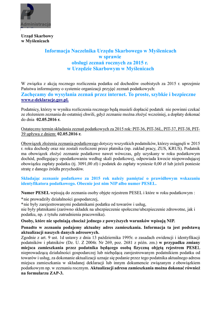 Urząd Skarbowy w Myślenicach Informacja Naczelnika Urzędu Skarbowego w Myślenicach w sprawie obsługi zeznań rocznych za 2015 r. w Urzędzie Skarbowym w Myślenicach W związku z akcją rocznego rozliczenia podatku od dochodów osobistych za 2015 r. uprzejmie Państwa informujemy o systemie organizacji przyjęć zeznań podatkowych: Zachęcamy do wysyłania zeznań przez internet. To proste, szybkie i bezpieczne www.e-deklaracje.gov.pl. Podatnicy, którzy w wyniku rozliczenia rocznego będą musieli dopłacić podatek nie powinni czekać ze złożeniem zeznania do ostatniej chwili, gdyż zeznanie można złożyć wcześniej, a dopłaty dokonać do dnia 02.05.2016 r. Ostateczny termin składania zeznań podatkowych za 2015 rok: PIT-36, PIT-36L, PIT-37, PIT-38, PIT39 upływa z dniem: 02.05.2016 r. Obowiązek złożenia zeznania podatkowego dotyczy wszystkich podatników, którzy osiągnęli w 2015 r. roku dochody oraz nie zostali rozliczeni przez płatnika (np. zakład pracy, ZUS, KRUS). Podatnik ma obowiązek złożyć zeznanie podatkowe nawet wówczas, gdy uzyskany w roku podatkowym dochód, podlegający opodatkowaniu według skali podatkowej, odpowiada kwocie niepowodującej obowiązku zapłaty podatku (tj. 3091,00 zł) i podatek do zapłaty wyniesie 0,00 zł lub jeżeli poniesie stratę z danego źródła przychodów. Składając zeznanie podatkowe za 2015 rok należy pamiętać o prawidłowym wskazaniu identyfikatora podatkowego. Obecnie jest nim NIP albo numer PESEL. Numer PESEL wpisują do zeznania osoby objęte rejestrem PESEL i które w roku podatkowym : * nie prowadziły działalności gospodarczej, * nie były zarejestrowanymi podatnikami podatku od towarów i usług, nie były płatnikami (zarówno składek na ubezpieczenie społeczne/ubezpieczenie zdrowotne, jak i podatku, np. z tytułu zatrudnienia pracownika). Osoby, które nie spełniają chociaż jednego z powyższych warunków wpisują NIP. Ponadto w zeznaniu podajemy aktualny adres zamieszkania. Informacja ta jest podstawą aktualizacji naszych danych adresowych. Zgodnie z art. 9 ust. 1d ustawy z dnia 13 października 1995r. o zasadach ewidencji i identyfikacji podatników i płatników (Dz. U. Z 2004r. Nr 269, poz. 2681 z późn. zm.) w przypadku zmiany miejsca zamieszkania przez podatnika będącego osobą fizyczną objętą rejestrem PESEL nieprowadzącą działalności gospodarczej lub niebędącą zarejestrowanym podatnikiem podatku od towarów i usług, za dokonanie aktualizacji uznaje się podanie przez tego podatnika aktualnego adresu miejsca zamieszkania w składanej deklaracji lub innym dokumencie związanym z obowiązkiem podatkowym np. w zeznaniu rocznym. Aktualizacji adresu zamieszkania można dokonać również na formularzu ZAP-3. Druki zeznań rocznych można pobrać ze strony internetowej Ministerstwa Finansów pod adresem www.finanse.mf.gov.pl,.Zarówno takie formularze jak również formularze kserowane, są honorowane w urzędach skarbowych. Należy przy tym pamiętać, aby rozliczyć się na formularzu aktualnym dla danego roku podatkowego. Najlepiej rozliczyć się przez Internet za pomocą aplikacji e-Deklaracje Desktop lub formularzy interaktywnych znajdujących się na stronie www.e-deklaracje.gov.pl. Wszystkie niezbędne informacje na temat rozliczenia podatku dochodowego od osób fizycznych znajdziesz na stronie www.portalpodatkowy.mf.gov.pl Skorzystaj z deklaracji wstępnie wypełnionej (PFR). OBSŁUGA ZEZNAŃ W URZĘDZIE SKARBOWYM W MYŚLENICACH Zeznania podatkowe: PIT-36, PIT-36L,PIT-37,PIT-38 i PIT-39 oraz korekty przedmiotowych zeznań można złożyć: – drogą elektroniczną z podpisem kwalifikowanym lub bez podpisu kwalifikowanego, – za pośrednictwem poczty (koszt przesyłki zeznania ponosi podatnik) Zeznania można przesłać odpłatnie listem poleconym na adres: Naczelnik Urzędu Skarbowego ul. H. Cegielskiego 2 32-400 Myślenice Na kopercie należy umieścić również imię i nazwisko oraz dokładny adres nadawcy. – w siedzibie urzędu na Sali Obsługi Bezpośredniej , ZACHĘCA SIĘ DO PRZESYŁANIA FORMULARZY ZEZNAŃ PODATKOWYCH DROGĄ ELEKTRONICZNĄ, umożliwi to wcześniejszy zwrot nadpłaty podatku. Interaktywny formularz za pomocą, którego będzie można wypełnić i wysłać zeznanie roczne należy pobrać ze strony www.edeklaracje.mf.gov.pl - na stronie tej umieszczona została również instrukcja. Wpłaty podatku wynikającego z zeznania za 2015 rok można dokonać: • przelewem bankowym Adres i numer konta Urzędu Skarbowego w Myślenicach: Urząd Skarbowy ul. H. Cegielskiego 2 32-400 Myślenice nr konta:44 1010 1270 0004 7522 2300 0000 NBP Oddział Okręgowy w Krakowie przekazem pocztowym- wpisując podany wyżej nr konta, z tytułu blankietu należy podać tytuł wpłaty „Rozliczenie podatku dochodowego za 2015 rok np. PIT-36, PIT-37...” w kasie Urzędu Skarbowego – w przypadku podatników nie prowadzących działalności gospodarczej. W tytule wpłaty oprócz danych podatnika należy wpisać: „Rozliczenie podatku dochodowego za 2015 rok np. PIT-36, PIT-37...” Termin wpłaty: – podatku wynikającego z zeznania podatkowego PIT-28 za 2015 r. upływa dnia 01.02.2016r. Podatku wynikającego z zeznania podatkowego PIT-36, PIT-37, PIT-38 i PIT-39 upływa dnia 02 maja 2016 r. Formy zwrotu nadpłaty podatku za 2015 r.: Podatnik może wnioskować o dokonanie zwrotu wykazanej w zeznaniu nadpłaty w następującej formie: • przelewem bankowym na rachunek zgłoszony do urzędu UWAGA: Warunkiem zwrotu nadpłaty na rachunek bankowy jest zgłoszenie osobistego rachunku bankowego wyłącznie na formularzu: * ZAP-3 – jeżeli jesteśmy objęci rejestrem PESEL * NIP-7 albo CEIDG-1- jeżeli nie jesteśmy objęci rejestrem PESEL lub naszym identyfikatorem podatkowym jest NIP. Jeżeli numer rachunku bankowego wskazany w latach wcześniejszych jest nadal aktualny nie ma potrzeby aktualizowania danych o numerze konta. Zwrot na rachunek bankowy jest najszybszą form