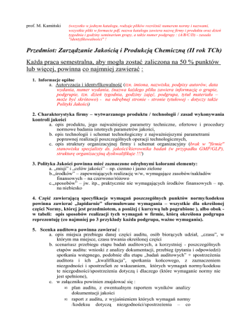 prof. M. Kamiński (wszystko w jednym katalogu, rodzaje plików rozróżnić numerem normy i nazwami, wszystkie pliki w formacie pdf, nazwa katalogu zawiera nazwę firmy i produktu oraz dzień tygodnia i godziny seminarium grupy, a także numer podgrupy : (A/B/C/D) - zasada "identyfikowalności" ! Przedmiot: Zarządzanie Jakością i Produkcją Chemiczną (II rok TCh) Każda praca semestralna, aby mogła zostać zaliczona na 50 % punktów lub więcej, powinna co najmniej zawierać : 1. Informacje ogólne a. Autoryzacja i identyfikowalność (tzn. imiona, nazwiska, podpisy autorów, data wydania, numer wydania, (nazwa każdego pliku zawiera informację o grupie, podgrupie, tzn. dzień tygodnia, godziny zajęć, podgrupa, tytuł materiału – może być skrótowo) - na odrębnej stronie - stronie tytułowej - dotyczy także Polityki Jakości) 2. Charakterystyka firmy – wytwarzanego produktu / technologii / zasad wykonywania kontroli jakości a. opis produktu, jego najważniejsze parametry techniczne, ofertowe i procedury normowe badania istotnych parametrów jakości, b. opis technologii i schemat technologiczny z najważniejszymi parametrami poprawnej realizacji poszczególnych operacji technologicznych, c. opis struktury organizacyjnej firmy i schemat organizacyjny (brak w "firmie" stanowiska specjalisty ds. jakości/kierownika badań (w przypadku GMP/GLP), strukturę organizacyjną dyskwalifikuje !!!) 3. Polityka Jakości powinna mieć zaznaczone odrębnymi kolorami elementy: a. „misji” i „celów jakości” – np. ciemno i jasno zielone b.„środków” – zapewniających realizację w/w, wymagające zasobów/nakładów finansowych – na czerwono/różowo c.„sposobów” – jw. itp., praktycznie nie wymagających środków finansowych – np. na niebiesko 4. Część zawierającą specyfikacje wymagań poszczególnych punktów normy/kodeksu powinna zawierać „lapidarnie” sformułowane wymagania – wszystkie dla określonej części Normy, której jest przedmiotem, a poniżej ( kursywą lub pogrubione ), albo obok w tabeli: opis sposobów realizacji tych wymagań w firmie, którą określona podgrupa reprezentuję (co najmniej po 3 przykłady każda podgrupa, ważne wymagania). 5. Scenka auditowa powinna zawierać : a. opis miejsca przebiegu danej części auditu, osób biorących udział, „czasu”, w którym ma miejsce, czasu trwania określonej części b. scenariusz przebiegu etapu badań auditowych, a korzystniej - poszczególnych etapów auditu: wnioski z analizy dokumentacji, przebieg (pytania i odpowiedzi) spotkania wstępnego, podobnie dla etapu „badań auditowych” + spostrzeżenia auditora i ich „kwalifikacja”, spotkania końcowego, z zaznaczeniem niezgodności i spostrzeŜeń ze wskazaniem, których wymagań normy/kodeksu te niezgodności/spostrzeżenia dotyczą i dlaczego (które wymaganie normy nie jest spełnione), c. w załączniku powinien znajdować się : • plan auditu, z ewentualnym raportem wyników analizy dokumentacji jakości • raport z auditu, z wyjaśnieniem których wymagań normy /kodeksu dotyczą niezgodności/spostrzeżenia – co • najmniej po 3 przykłady niezgodności i spostrzeżeń potwierdzających działanie propozycja poleceń korygujących/naprawczych, terminu ich wykonania, osoby odpowiedzialne za wykonanie, terminów sprawdzenia skuteczności działań, opis sposobu sprawdzenia skuteczności działań, opis sposobu sprawdzenia skuteczności i osoby odpowiedzialnej za to sprawdzenie 6. Przykłady: „procedury”, „instrukcji”, „zapisu” muszą spełniać wszystkie wymagania odpowiedniej normy/kodeksu jakości, tzn. musza zawierać numer wyróżniający (procedura, instrukcja), datę wydania /utworzenia korekt nowelizacji (wszystkie), autorów (wpisać wszystkie przygotowujące osoby), sprawdzającego i zatwierdzającego (procedura, instrukcja), zmiany wprowadzone dotychczas , ew: jaki dokument zastępują. 7. Do „materiałów” nieobowiązkowych, ale zapewniających dodatkowe punkty należą : 7.1 7.2 7.3 Plan jakości firmy, zawierający wykaz zidentyfikowanych procesów, wzajemne powiązania między procesami, przyjęte w formie zasady i sposoby ciągłego doskonalenia, „narzędzie statystyczne” wykorzystywane dla badania stopnia zadowolenia klienta/odbiorcy produktu oraz do kontroli jakości w celu badania „stabilności” procesów technologicznych; Plan posiedzenia „najwyŜszego kierownictwa” ( co będzie omawiane i co stanowi „materiał” pomocniczy w obradach) oraz raport z „Okresowego Przeglądu Kierownictwa” w zakresie jakości; Przykład procedury lub instrukcji dotyczącej analizy ryzyka awarii/wypadku przy pracy oraz przykład zapisu z wyboru znaczących aspektów w zakresie zarządzania środowiskiem w firmie, zgodnie z ISO 14001.