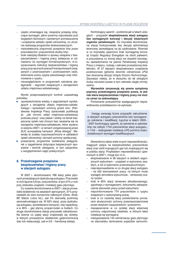 WYNIKI KONTROLI UJĘTYCH W PLANIE ROCZNYM – – – – często zmieniające się, niespójne przepisy dotyczące wymagań, jakim powinny odpowiadać pod względem fachowym i sanitarnym pomieszczenia i urządzenia zakładu opieki zdrowotnej, co utrudnia realizację programów dostosowawczych; niedostateczna znajomość przepisów bhp przez pracodawców i pracowników służby bhp; brak należytej dbałości o sprawy związane z bezpieczeństwem i higieną pracy zwłaszcza w odniesieniu do wymagań formalnoprawnych, m.in. opracowania instrukcji bezpieczeństwa i higieny pracy przy ręcznych pracach transportowych związanych z przenoszeniem i podnoszeniem osób, dokonania oceny ryzyka zawodowego oraz informowania o ryzyku; nieuwzględnianie w programach szkolenia pielęgniarek – zagrożeń związanych z obciążeniem układu mięśniowo-szkieletowego. Wyniki przeprowadzonych kontroli uzasadniają potrzebę: y upowszechniania wiedzy o zagrożeniach wynikających z obciążenia układu mięśniowo-szkieletowego i sposobach ochrony przed nimi. (Państwowa Inspekcja Pracy opracowała publikację pt: „Jak chronić układ mięśniowo-szkieletowy podczas pracy” oraz plakat i ulotkę na temat bezpiecznej opieki nad chorym bez narażania się na obciążenie mięśniowo-szkieletowe, które wydano w sierpniu 2007 r. w ramach zorganizowanej przez SLIC europejskiej kampanii „Mniej dźwigaj”. Materiały te zostały rozpowszechnione w zakładach opieki zdrowotnej i domach pomocy społecznej); y poszerzenia programów kształcenia pielęgniarek o zagadnienia dotyczące bezpiecznych sposobów i technik dźwigania, w tym pacjentów, z uwzględnieniem zajęć praktycznych. 8. Przestrzeganie przepisów bezpieczeństwa i higieny pracy w stacjach autogazu W 2007 r. skontrolowano 788 stacji paliw płynnych prowadzących dystrybucję autogazu. Pracowało w nich łącznie 5,6 tys. pracowników, w tym 57% z nich przy obsłudze urządzeń i instalacji gazu płynnego. Co czwarta skontrolowana w 2007 r. stacja prowadziła działalność na zasadach ajencyjnych, 31% przynależało do sieci koncernów naftowych (Orlen, Shell, BP, Statoil, Lotos itd.), zaś 5% stanowiły podmioty samozatrudniające się. W 62% stacji, poza dystrybucją autogazu, sprzedawano benzynę i olej napędowy, a w 85% – gaz płynny propan-butan w butlach. Co druga skontrolowana stacja pracowała całodobowo. Na terenie co piątej stacji znajdowały się obiekty, w których prowadzono działalność gastronomiczną (bar lub restaurację), zaś w 2/3 – handlową (sklep). Kontrolujący ujawnili – podobnie jak w latach ubiegłych – przypadki eksploatowania stacji autogazu bez wymaganych koncesji i decyzji właściwych organów państwowych. Co trzynasta skontrolowana stacja funkcjonowała bez decyzji administracji terenowej zezwalającej na jej użytkowanie. Również w co trzynastej ujawniono brak wymaganej koncesji Urzędu Regulacji Energetyki na obrót paliwami, a pracodawca co ósmej stacji nie dopełnił obowiązku zawiadomienia na piśmie Państwowej Inspekcji Pracy o miejscu, rodzaju i zakresie prowadzonej działalności. W 27 stacjach eksploatowano urządzenia poddozorowe (głównie zbiorniki ciśnieniowe LPG) bez stosownej decyzji Urzędu Dozoru Technicznego. Zauważyć należy, że w stosunku do lat ubiegłych liczba naruszeń prawa w tym zakresie uległa zmniejszeniu. Wprawdzie zarysowują się pewne symptomy poprawy przestrzegania przepisów prawa, to jednak stanu bezpieczeństwa i higieny pracy nie można uznać za zadowalający. Porównanie powszechnie występujących nieprawidłowości przedstawiono na wykresie. Uwagę zwracają liczne przypadki zatrudnienia w stacjach autogazu pracowników bez wymaganego szkolenia i kwalifikacji. Łącznie w latach 2005– –2007 kontrolujący ujawnili, że szkolenia w zakresie bhp nie odbyło 1744 pracowników stacji autogazu, a 1124 – obsługiwało instalacje LPG pomimo braku dodatkowych wymagań kwalifikacyjnych. Stwierdzono także wiele innych nieprawidłowości, mających wpływ na bezpieczeństwo pracowników stacji oraz osób kupujących gaz lub znajdujących się w pobliżu stacji. Przykładem nieprawidłowości ujawnionych w 2007 r. mogą być m.in.: – eksploatowanie w 26 stacjach w strefach zagrożonych wybuchem – urządzeń w wykonaniu zwykłym, a nie w wykonaniu przeciwwybuchowym; – nieprzeprowadzenie w co drugiej stacji autogazu – na 432 stanowiskach pracy, na których może wystąpić atmosfera wybuchowa – okresowej oceny ryzyka; – brak w 65% stacji okresowo aktualizowanego, zgodnego z wymaganiami, dokumentu zabezpieczenia stanowisk pracy przed wybuchem; – niepoinformowanie 774 pracowników o ryzyku związanym z wykonywaną pracą; – brak w co czwartej stacji potwierdzenia pomiarami skuteczności ochrony przeciwporażeniowej przed dotykiem bezpośrednim i pośrednim; – niezapewnienie w co szóstej stacji właściwej ochrony odgromowej obiektów, w których takie instalacje są wymagane; – niewyposażenie 144 odmierzaczy gazu płynnego na stanowisku tankowania pojazdów samocho- SPRAWOZDANIE GIP Z DZIAŁALNOŚCI PIP W 2007 r. Wykres 49. Stacje autogazu – naruszenia przepisów ochrona antyelektrostatyczna w przestrzeniach zewnętrznych zagrożonych wybuchem i pożarem zapewnienie ochrony odmierzaczy i zbiorników magaz. LPG przed najechaniem na nie pojazdów zabezpiecz. przed uszkodzeniami mechanicznymi zaworów i krućców butli z gazem płynnym składowanych na terenie stacji dodatkowe kwalifikacje szkolenie pracowników w dziedzinie bhp ocena ryzyka zawodowego na stanowiskach pracy opracowanie i udostępnienie instrukcji bhp dot. prowadzonych procesów technologicznych oznakowanie stacji znakami drogowymi i informacyjno-ostrzegawczymi 2007 2006 wyznaczenie i oznakowanie stref zagrożenia wybuchem wyposażenie pracowników w odzież i obuwie ochronne % stacji, w których naruszono przepisy 2007 2006 0 10 20 30 2005 40 50 WYNIKI KONTROLI UJĘT