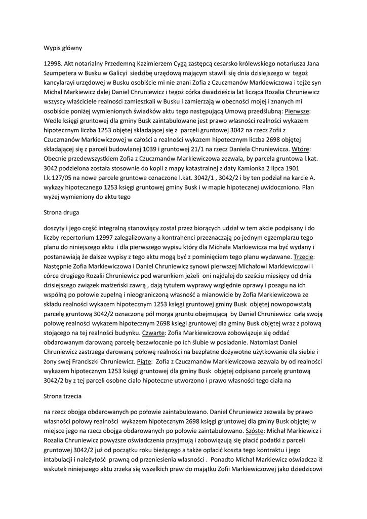 Wypis główny 12998. Akt notarialny Przedemną Kazimierzem Cygą zastępcą cesarsko królewskiego notariusza Jana Szumpetera w Busku w Galicyi siedzibę urzędową mającym stawili się dnia dzisiejszego w tegoż kancylarayi urzędowej w Busku osobiście mi nie znani Zofia z Czuczmanów Markiewiczowa i tejże syn Michał Markiewicz dalej Daniel Chruniewicz i tegoż córka dwadzieścia lat licząca Rozalia Chruniewicz wszyscy właściciele realności zamieszkali w Busku i zamierzają w obecności mojej i znanych mi osobiście poniżej wymienionych świadków aktu tego następującą Umową przedślubną: Pierwsze: Wedle księgi gruntowej dla gminy Busk zaintabulowane jest prawo własności realności wykazem hipotecznym liczba 1253 objętej składającej się z parceli gruntowej 3042 na rzecz Zofii z Czuczmanów Markiewiczowej w całości a realności wykazem hipotecznym liczba 2698 objętej składającej się z parceli budowlanej 1039 i gruntowej 21/1 na rzecz Daniela Chruniewicza. Wtóre: Obecnie przedewszystkiem Zofia z Czuczmanów Markiewiczowa zezwala, by parcela gruntowa l.kat. 3042 podzielona została stosownie do kopii z mapy katastralnej z daty Kamionka 2 lipca 1901 l.k.127/05 na nowe parcele gruntowe oznaczone l.kat. 3042/1 , 3042/2 i by ten podział na karcie A. wykazy hipotecznego 1253 księgi gruntowej gminy Busk i w mapie hipotecznej uwidoczniono. Plan wyżej wymieniony do aktu tego Strona druga doszyty i jego część integralną stanowiący został przez biorących udział w tem akcie podpisany i do liczby repertorium 12997 zalegalizowany a kontrahenci przeznaczają po jednym egzemplarzu tego planu do niniejszego aktu i dla pierwszego wypisu który dla Michała Markiewicza ma być wydany i postanawiają że dalsze wypisy z tego aktu mogą być z pominięciem tego planu wydawane. Trzecie: Następnie Zofia Markiewiczowa i Daniel Chruniewicz synowi pierwszej Michałowi Markiewiczowi i córce drugiego Rozalii Chruniewicz pod warunkiem jeżeli oni najdalej do sześciu miesięcy od dnia dzisiejszego związek małżeński zawrą , dają tytułem wyprawy względnie oprawy i posagu na ich wspólną po połowie zupełną i nieograniczoną własność a mianowicie by Zofia Markiewiczowa ze składu realności wykazem hipotecznym 1253 księgi gruntowej gminy Busk objętej nowopowstałą parcelę gruntową 3042/2 oznaczoną pół morga gruntu obejmującą by Daniel Chruniewicz całą swoją połowę realności wykazem hipotecznym 2698 księgi gruntowej dla gminy Busk objętej wraz z połową stojącego na tej realności budynku. Czwarte: Zofia Markiewiczowa zobowiązuje się oddać obdarowanym darowaną parcelę bezzwłocznie po ich ślubie w posiadanie. Natomiast Daniel Chruniewicz zastrzega darowaną połowę realności na bezpłatne dożywotne użytkowanie dla siebie i żony swej Franciszki Chruniewicz. Piąte: Zofia z Czuczmanów Markiewiczowa zezwala by od realności wykazem hipotecznym 1253 księgi gruntowej dla gminy Busk objętej odpisano parcelę gruntową 3042/2 by z tej parceli osobne ciało hipoteczne utworzono i prawo własności tego ciała na Strona trzecia na rzecz obojga obdarowanych po połowie zaintabulowano. Daniel Chruniewicz zezwala by prawo własności połowy realności wykazem hipotecznym 2698 księgi gruntowej dla gminy Busk objętej w miejsce jego na rzecz obojga obdarowanych po połowie zaintabulowano. Szóste: Michał Markiewicz i Rozalia Chruniewicz powyższe oświadczenia przyjmują i zobowiązują się płacić podatki z parceli gruntowej 3042/2 już od początku roku bieżącego a także opłacić koszta tego kontraktu i jego intabulacji i należytość prawną od przeniesienia własności . Ponadto Michał Markiewicz oświadcza iż wskutek niniejszego aktu zrzeka się wszelkich praw do majątku Zofii Markiewiczowej jako dziedzicowi koniecznemu mu przysługujących. Siódme: Daniel Chruniewicz zastrzega sobie równoczesność wpisu prawa dożywocia połowy realności wykazem hipotecznym 2698 księgi gruntowej dla gminy Busk objętej dla siebie i Franciszki Chruniewicz i oświadcza że jakkolwiek ma więcej jeszcze dzieci to jednak dzieci te wszystkie wyposażył i one do jego majątku żadnych praw rościć sobie nie mogą. Ósme: Wypis z tego aktu Franciszce Chruniewiczowej może być wydany. Na to powyższy akt notaryalny został spisany kontrahentom w przytomności świadków Piotr Glińskiego i Michała Jakubowskiego obu prywatnych z Buska dosłownie odczytany i objaśniony, a gdy kontrahenci oświadczyli że akt zrozumieli i że takowy zgodnie z ich wolą spisany został wówczas go w obecności mojej znakami odręcznymi podpisan, po czem ich imiona i nazwiska obok ich znaków świadek Piotr Gliński podopisywał, i obaj świadkowie własnoręcznie się Strona czwarta podpisali. Busk dnia trzeciego Lipca, roku tysiąc dziewięćsetnego pierwszego +Zofia Markiewicz +Michał Markiewicz +Daniel Chruniewicz +Rozalia Chruniewicz podpisałem Piotr Gliński mp . Świadkowie Piotr Gliński mp. Michał Jakubowski mp. Kazimierz Cyga mp. Dekretem c.k. Sądu kraj we Lwowie z dnia 25 czerwca 1901 L.P. 1796/1 ustanowiony substytut c.k. notaryusza Jana Szumpetera w Busku (LP). -------------------------------------------------------------------------------------------[parafka Cyga] Niniejszy wypis główny dla Michała Markiewicza przeznaczony zgadza się dosłownie z pierwowzorem w aktach c.k. notaryusza Jana Szumpetera w Busku L.rep. 12998 przechowanym, marką na koronę ostemplowanym zarazem dołączam do takowego jeden egzemplarz planu sytuacyjnego z daty Kamionka Strumiłowa 2 lipca 1901 w którym w akcie jest (???) w oryginale a który jako załącznik do tego wypisu przeznaczony został.-------------------------------------------------------------------------------------Busk dnia 3 Lipca tysiąc dziewięćsetnego pierwszego (1901) -------------------------------------------------Należytości pisanie. 1k 60h widym. 1k 60h razem 3k 20h [podpis Kazimierz Cyg