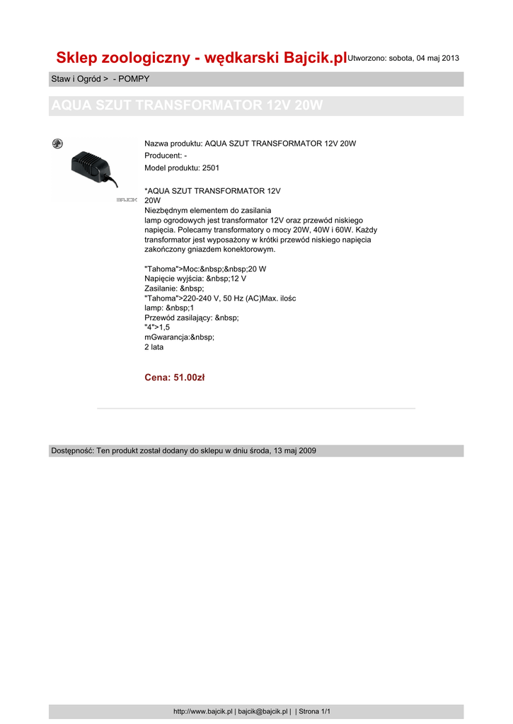 Sklep zoologiczny - wędkarski Bajcik.plUtworzono: sobota, 04 maj 2013 Staw i Ogród > - POMPY AQUA SZUT TRANSFORMATOR 12V 20W Nazwa produktu: AQUA SZUT TRANSFORMATOR 12V 20W Producent: Model produktu: 2501 *AQUA SZUT TRANSFORMATOR 12V 20W Niezbędnym elementem do zasilania lamp ogrodowych jest transformator 12V oraz przewód niskiego napięcia. Polecamy transformatory o mocy 20W, 40W i 60W. Każdy transformator jest wyposażony w krótki przewód niskiego napięcia zakończony gniazdem konektorowym. "Tahoma">Moc: 20 W Napięcie wyjścia: 12 V Zasilanie: "Tahoma">220-240 V, 50 Hz (AC)Max. ilośc lamp: 1 Przewód zasilający: "4">1,5 mGwarancja: 2 lata Cena: 51.00zł Dostępność: Ten produkt został dodany do sklepu w dniu środa, 13 maj 2009 http://www.bajcik.pl | [email protected] | | Strona 1/1