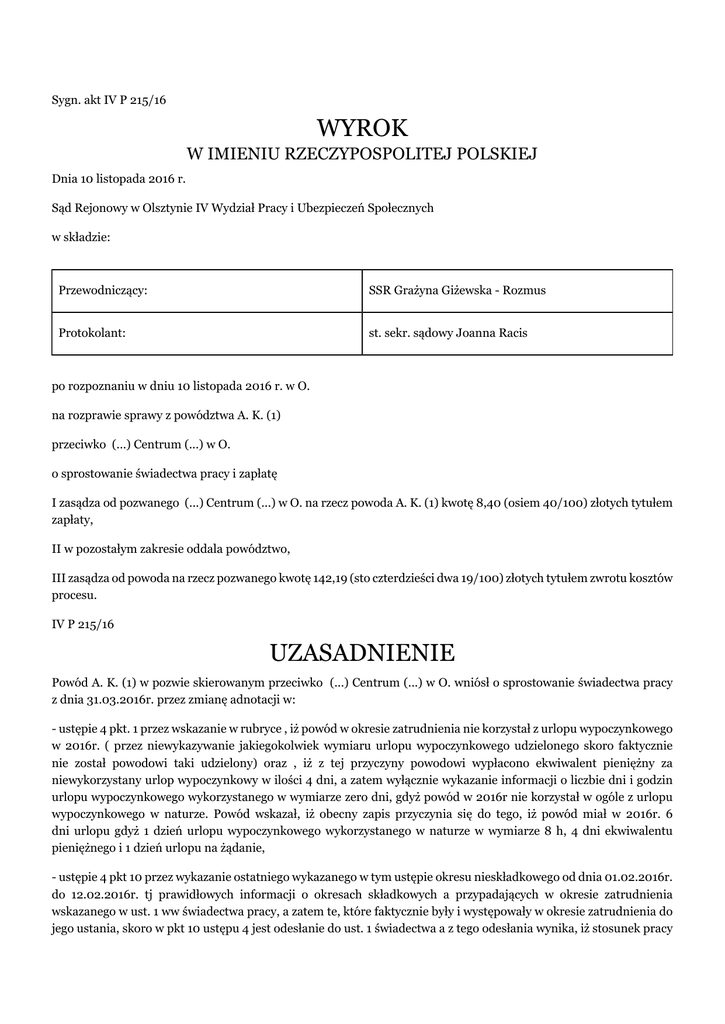 Sygn. akt IV P 215/16 WYROK W IMIENIU RZECZYPOSPOLITEJ POLSKIEJ Dnia 10 listopada 2016 r. Sąd Rejonowy w Olsztynie IV Wydział Pracy i Ubezpieczeń Społecznych w składzie: Przewodniczący: SSR Grażyna Giżewska - Rozmus Protokolant: st. sekr. sądowy Joanna Racis po rozpoznaniu w dniu 10 listopada 2016 r. w O. na rozprawie sprawy z powództwa A. K. (1) przeciwko (...) Centrum (...) w O. o sprostowanie świadectwa pracy i zapłatę I zasądza od pozwanego (...) Centrum (...) w O. na rzecz powoda A. K. (1) kwotę 8,40 (osiem 40/100) złotych tytułem zapłaty, II w pozostałym zakresie oddala powództwo, III zasądza od powoda na rzecz pozwanego kwotę 142,19 (sto czterdzieści dwa 19/100) złotych tytułem zwrotu kosztów procesu. IV P 215/16 UZASADNIENIE Powód A. K. (1) w pozwie skierowanym przeciwko (...) Centrum (...) w O. wniósł o sprostowanie świadectwa pracy z dnia 31.03.2016r. przez zmianę adnotacji w: - ustępie 4 pkt. 1 przez wskazanie w rubryce , iż powód w okresie zatrudnienia nie korzystał z urlopu wypoczynkowego w 2016r. ( przez niewykazywanie jakiegokolwiek wymiaru urlopu wypoczynkowego udzielonego skoro faktycznie nie został powodowi taki udzielony) oraz , iż z tej przyczyny powodowi wypłacono ekwiwalent pieniężny za niewykorzystany urlop wypoczynkowy w ilości 4 dni, a zatem wyłącznie wykazanie informacji o liczbie dni i godzin urlopu wypoczynkowego wykorzystanego w wymiarze zero dni, gdyż powód w 2016r nie korzystał w ogóle z urlopu wypoczynkowego w naturze. Powód wskazał, iż obecny zapis przyczynia się do tego, iż powód miał w 2016r. 6 dni urlopu gdyż 1 dzień urlopu wypoczynkowego wykorzystanego w naturze w wymiarze 8 h, 4 dni ekwiwalentu pieniężnego i 1 dzień urlopu na żądanie, - ustępie 4 pkt 10 przez wykazanie ostatniego wykazanego w tym ustępie okresu nieskładkowego od dnia 01.02.2016r. do 12.02.2016r. tj prawidłowych informacji o okresach składkowych a przypadających w okresie zatrudnienia wskazanego w ust. 1 ww świadectwa pracy, a zatem te, które faktycznie były i występowały w okresie zatrudnienia do jego ustania, skoro w pkt 10 ustępu 4 jest odesłanie do ust. 1 świadectwa a z tego odesłania wynika, iż stosunek pracy powoda ustał z dniem 12.02.2016r. a nie w dniu 14.02.2016r. jest wadliwie wykazuje się w rubryce ustępu 4 pkt 10, wskazuje, iż i ostatni okres nieskładkowy zakończył się z dniem 14.02.2016r. Powód wniósł także o zasądzenie kosztów postępowania sądowego według norm przepisanych i dodatkowo z przedłożonego w trakcie rozprawy spisu poniesionych w sprawie sprostowania od dnia 23.02.2016r. świadectwa pracy kosztów odwołań od świadectwa pracy. Na rozprawie w dniu 10.11.2016r. powód złożył spis kosztów postępowania i dochodzonego roszczenia o zapłatę. W uzasadnieniu powód wskazał, iż domagał się od pozwanego trzykrotnie sprostowania świadectwa pracy . W zakresie sprostowania ustępu 4 pkt 1 powód prezentował stanowisko, iż urlop na żądanie nie jest urlopem wypoczynkowym co w jego ocenie uzasadnia żądanie sprostowania świadectwa. W zakresie ust. 4 pkt 10 powód podniósł, iż w punkcie tym pracodawca winien wykazać jedynie faktyczny okres nieskładkowy w przedziale okresu zatrudnienia pracownika. W odpowiedzi na pozew (...) Centrum (...) w O. wniosło o oddalenie powództwa. Wskazano, iż odnośnie ust.4 pkt 1 pracodawca wskazuje wyłącznie liczbę dni i godzin urlopu wypoczynkowego przysługującego pracownikowi w roku kalendarzowym, w którym ustał stosunek pracy wykorzystany w naturze lub za który przysługuje ekwiwalent pieniężny; odrębnie wskazuje się liczbę dni i godzin urlopu wypoczynkowego wykorzystanego przez pracownika na podstawie art. 167 (2) kp. Stosunek pracy powoda ustał 12.02.2016r. i należny był mu urlop w ilości 5 dni . Powód wykorzystał 1 dzień więc do rozliczenia w ekwiwalencie pozostały 4 dni. Pozwany wskazał na charakter urlopu na żądanie jako urlopu wypoczynkowego . Podniesiono, iż powód bezpodstawnie wywodzi, że urlop na żądanie jest dodatkowym urlopem nie wchodzącym do wymiaru 26 dni urlopu wypoczynkowego. W zakresie ust. 4 pkt 10 wskazano, że jest to omyłka pisarska albowiem zapis ten jest skorelowany z zapisem w ust. 4 pkt 4 świadectwa pracy, w którym pracodawca wykazuje prawidłową liczbę dni , za które pracownik otrzymał wynagrodzenie chorobowe . Pozwany w ust. 4 pkt.4 wykazał 12 dni niezdolności do pracy powoda. Sąd ustalił następujący stan faktyczny: Powód A. K. (1) zatrudniony był w pozwanym (...) Centrum (...) w O. w okresie od 01.03.2012r. do 12.02.2016r. na stanowisku młodszego wychowawcy. W dniu 12.02.2016r. doszło do zakończenia między stronami stosunku pracy. ( bezsporne, potwierdzone dokumentami z akt osobowych) W związku z rozwiązaniem umowy o pracę pracodawca wystawił powodowi świadectwo pracy z dnia 17.02.2016r., w którym wskazano, iż w okresie zatrudnienia pracownik wykorzystał urlop wypoczynkowy w wymiarze 8 godzin- 1 dzień urlopu na żądanie. Nie wskazano okresów nieskładkowych , przypadających w okresie zatrudnienia wskazanym w ust.1, uwzględniane przy ustalaniu prawa do emerytury lub renty. Pismem z dnia 23.02.2016r. ( 25.02.2016r. data wpływu do pracodawcy) powód wniósł o sprostowanie świadectwa w zakresie : - ustępu 3a-przez wykazanie prawdziwej i obowiązującej prawnie podstawy i trybu zwolnienia zgodnie z zaleceniami Kodeksu pracy i rozporządzenia Ministra Pracy i Polityki Socjalnej w sprawie szczegółowej treści świadectwa pracy (…) - ustępu 4 pkt 1- przez wyłączne wykazanie prawidłowych informacji o liczbie dni i godzin urlopu wypoczynkowego w wymiarze 4 dni przysługującego mu proporcjonalnie w roku kalendarzowym, w którym ustał stosunek pracy, - ustępu 4 pkt 4 – przez wykazanie w tej podstawie prawidłowej informacji o okresach niezdolności do pracy a wynikających z Kodeksu pracy oraz rozporządzenia wykonawczego, - ustęp
