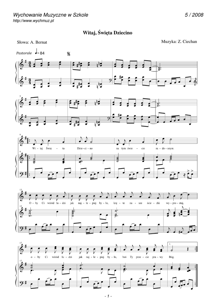Wychowanie Muzyczne w Szkole 5 / 2008 http://www.wychmuz.pl Witaj, Święta Dziecino Muzyka: Z. Ciechan Słowa: A. Bernat 1 Wychowanie Muzyczne w Szkole 5 / 2008 http://www.wychmuz.pl Witaj, Święta Dziecino na tym świecie radosnym. Oby Ci wśród ludzi jak najlepiej było, kręte nasze ścieżki wyprostuj, oby Ci wśród ludzi jak najlepiej było, boś Ty przecie prawy Bóg. Przyszłaś Święta Dziecino do bogatych i biednych, aby wszelki smutek w naszych sercach zginął. Po to przyszłaś na świat w Betlejem, aby wszelki smutek w naszych sercach zginął, z Matki Marii przyszedł Bóg. Nie płacz nigdy Dziecino łezkami jak perełki. Choćby Ciebie ludzkie słowo obraziło, przebacz temu, jak grzech niewielki, choćby Ciebie ludzkie słowo obraziło, przebacz, boś Ty dobry Bóg. 2