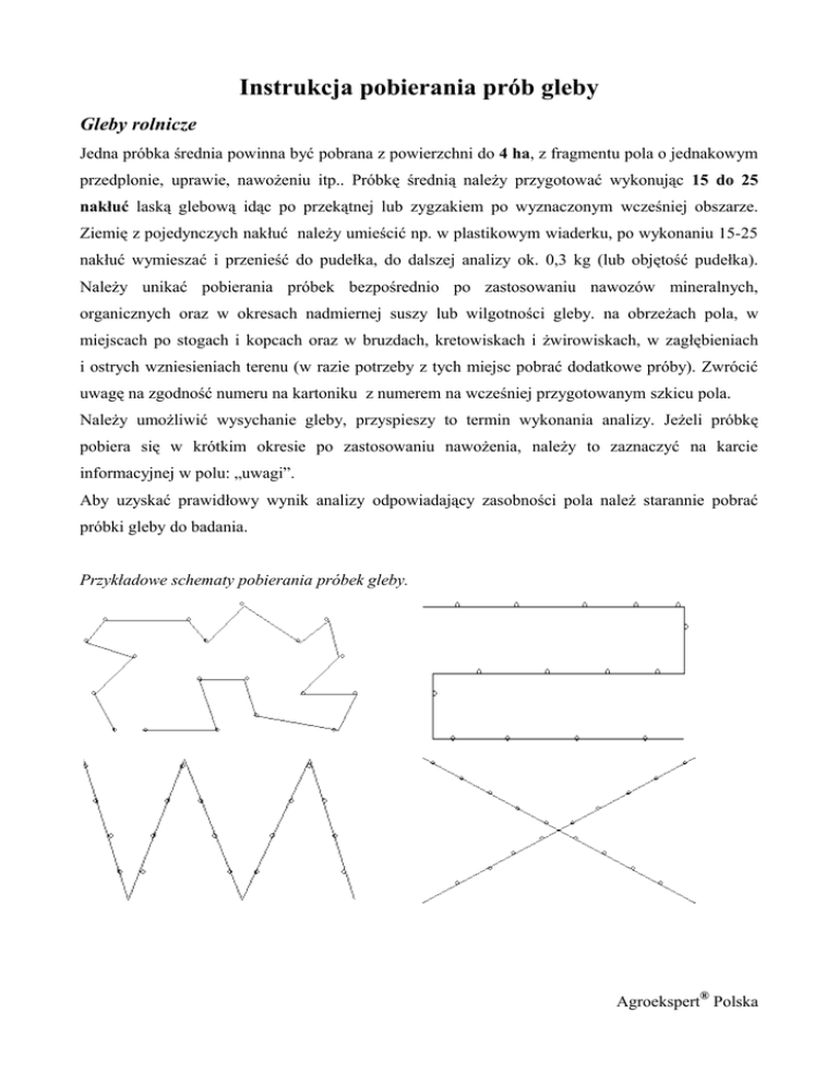 Instrukcja pobierania prób gleby Gleby rolnicze Jedna próbka średnia powinna być pobrana z powierzchni do 4 ha, z fragmentu pola o jednakowym przedplonie, uprawie, nawożeniu itp.. Próbkę średnią należy przygotować wykonując 15 do 25 nakłuć laską glebową idąc po przekątnej lub zygzakiem po wyznaczonym wcześniej obszarze. Ziemię z pojedynczych nakłuć należy umieścić np. w plastikowym wiaderku, po wykonaniu 15-25 nakłuć wymieszać i przenieść do pudełka, do dalszej analizy ok. 0,3 kg (lub objętość pudełka). Należy unikać pobierania próbek bezpośrednio po zastosowaniu nawozów mineralnych, organicznych oraz w okresach nadmiernej suszy lub wilgotności gleby. na obrzeżach pola, w miejscach po stogach i kopcach oraz w bruzdach, kretowiskach i żwirowiskach, w zagłębieniach i ostrych wzniesieniach terenu (w razie potrzeby z tych miejsc pobrać dodatkowe próby). Zwrócić uwagę na zgodność numeru na kartoniku z numerem na wcześniej przygotowanym szkicu pola. Należy umożliwić wysychanie gleby, przyspieszy to termin wykonania analizy. Jeżeli próbkę pobiera się w krótkim okresie po zastosowaniu nawożenia, należy to zaznaczyć na karcie informacyjnej w polu: „uwagi”. Aby uzyskać prawidłowy wynik analizy odpowiadający zasobności pola należ starannie pobrać próbki gleby do badania. Przykładowe schematy pobierania próbek gleby. ® Agroekspert Polska