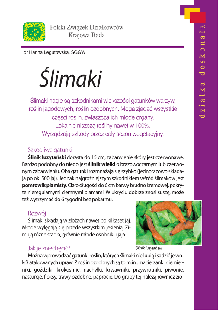 dr Hanna Legutowska, SGGW Ślimaki Âlimaki nagie sà szkodnikami wi´kszoÊci gatunków warzyw, roÊlin jagodowych, roÊlin ozdobnych. Mogà zjadaç wszystkie cz´Êci roÊlin, zwłaszcza ich młode organy. Lokalnie niszczà roÊliny nawet w 100%. Wyrzàdzajà szkody przez cały sezon wegetacyjny. Szkodliwe gatunki Ślinik luzytański dorasta do 15 cm, zabarwienie skóry jest czerwonawe. Bardzo podobny do niego jest ślinik wielki o brązowoczarnym lub czerwonym zabarwieniu. Oba gatunki rozmnażają się szybko (jednorazowo składają po ok. 500 jaj). Jednak najgroźniejszym szkodnikiem wśród ślimaków jest pomrowik plamisty. Ciało długości do 6 cm barwy brudno kremowej, pokryte nieregularnymi ciemnymi plamami. W ukryciu dobrze znosi suszę, może też wytrzymać do 6 tygodni bez pokarmu. Rozwój Ślimaki składają w złożach nawet po kilkaset jaj. Młode wylęgają się przede wszystkim jesienią. Zimują różne stadia, głównie młode osobniki i jaja. Jak je zniechęcić? Âlinik luzytaƒski Można wprowadzać gatunki roślin, których ślimaki nie lubią i sadzić je wokół atakowanych upraw. Z roślin ozdobnych są to m.in.: macierzanki, ciemierniki, goździki, krokosmie, nachyłki, krwawniki, przywrotniki, piwonie, nasturcje, floksy, trawy ozdobne, paprocie. Do grupy tej należą również zio- dzia∏ka doskona∏a Polski Zwiàzek Działkowców Krajowa Rada działka doskonała ła: majeranek, rumianek, cząber, gorczyca, szałwia, hyzop, tymianek, lawenda, wiesiołek, a także warzywa: koper włoski, roszponka, cebula, szpinak. Pomrowik plamisty Naturalni wrogowie W naturalnym środowisku liczebność populacji ślimaków ograniczają m.in. drapieżne i pasożytnicze owady (chrząszcze, muchówki), żaby, ropuchy, jaszczurki, niektóre ptaki, jeże, krety i inne ssaki. Profilaktyka Ślinik wielki m Bardzo ważne jest wykaszanie rowów i zarośli, które są ich siedliskiem. m Należy usuwać przedmioty stanowiące dla nich kryjówki: deski, stosy kamieni. Miejscem chętnie zasiedlanym przez ślimaki jest kompostownik. Dlatego tam trzeba skupić działania w celu ich likwidacji. m Ważne jest sprawdzanie kupowanych roślin. Zdarza się, że pochodzą one z terenów opanowanych przez szkodliwe ślimaki. Zabiegi agrotechniczne m Częste grabienie, motyczenie, odchwaszczanie, pozwala na wyeliminowanie zwłaszcza młodych osobników oraz jaj. Ważne jest też likwidowanie bruzd i szczelin w glebie, które są kryjówką ślimaków. m Ochronę przed ślimakami można połączyć również z nawożeniem, używając wapna niegaszonego lub kainitu (4 kg/100m2), które mają właściwości parzące. Wysiewa się je wieczorem. Ślimaki na skutek kontaktu z tymi substancjami giną w wyniku odwodnienia. Zabieg wykonujemy przy bezdeszczowej pogodzie. Unikamy rozsypywania na roślinach. m Usypywanie barier z popiołu, trocin, plew jęczmienia lub wapna niegaszonego – metoda ta jest skuteczna tylko do czasu wystąpienia opadów. m Pokruszone skorupki jajek wokół roślin tworzą dla ślimaków przeszkodę trudną do przebycia, gdyż ostre, twarde krawędzie skorupek kaleczą ich ciało. 2 a c Rys. A. Pokora b Pułapki do wyłapywania Êlimaków: a – deska z podło˝onymi liÊçmi lub korzeniami warzyw, b – naczynie z piwem, c – naczynie z podło˝onà substancjà wabiàcà Ręcznie Bardzo skuteczną lecz czasochłonną metodą jest bezpośrednie wyłapywanie ślimaków tuż przed wieczorem lub wczesnym rankiem. Czynność tę należy przeprowadzać systematycznie przez kilka dni i w miarę potrzeby powtarzać. Zwalczanie biologiczne Stosowanie preparatu biologicznego Nemaslug zawierającego pasożytnicze nicienie, niszczy zwłaszcza młode osobniki. Warunkiem skuteczności preparatu jest utrzymanie wilgotnej gleby po jego zaaplikowaniu przez 2 tygodnie aby nicienie nie zginęły. 3 dzia∏ka doskona∏a Pułapki m Przydatne w zwalczaniu ślimaków są np. deski położone w zacisznym miejscu, pod które wykładamy np. liście kapusty, sałaty, ziemniaki czy marchew. m Można je także przywabiać piwem nalanym do płaskich, zagłębionych w ziemię naczyń. m Kolejny przykład pułapki to okrągłe naczynie o średnicy 30–40 cm, pod którym ukrywa się substancję wabiącą: np. jeden z dostępnych w handlu preparatów wabiących ślimaki, otręby czy płatki zbożowe. Pod brzegi naczynia należy położyć kawałki patyków, aby ślimaki mogły tam swobodnie wpełzać. Pułapki rozmieszcza się w miejscach silnie opanowanych przez ślimaki, co około 1,5–2 m i przegląda w odstępach 2-dniowych, w celu uzupełnienia brakującej przynęty oraz wybrania zwabionych osobników. dzia∏ka doskona∏a Preparaty roślinne Zahamowanie żerowania ślimaków można uzyskać, stosując opryskiwanie roślin oraz miejsc gdzie najliczniej przebywają (zarośla, kompostownik) takimi preparatami jak: gnojówka z piołunu, wyciąg z niecierpka wielkokwiatowego, z ziela mydlnicy lekarskiej, wierzbownicy kosmatej, rdestu kolankowego, kuklika pospolitego, szałwii lekarskiej. Ocet Opryskiwanie ślimaków wodą z octem (1:1) powoduje ich odwodnienie i hamuje wytwarzanie śluzu, skutkiem czego szybko giną. Zwalczanie chemiczne Do zwalczania ślimaków można wykorzystać preparat Aromol 1,62 RB, Compo Granulat na ślimaki (fosforan żelaza) w formie gotowej przynęty. Środki rozsypuje się równomiernie w międzyrzędziach i wzdłuż brzegów zagonów. Najlepsze efekty uzyskuje się w godzinach popołudniowych lub wieczorem, kiedy ślimaki opuszczają swoje kryjówki. Preparaty są odporne na deszcz, dlatego mogą być stosowane przed i po deszczu oraz przy silnej rosie. Postępować należy zgodnie z zaleceniami zamieszczonymi na etykiecie. Chcesz wiedzieç wi´cej? Czytaj miesi´czniki „dzia∏kowiec” i „Mój Ogródek”, w których zawarta jest rzetelna i aktualna wiedza na temat zagospodarowania i piel´gnacji dzia∏ek. Uwaga, zamawiajàc teraz pakiet prenumerat obydwu czasopism, 