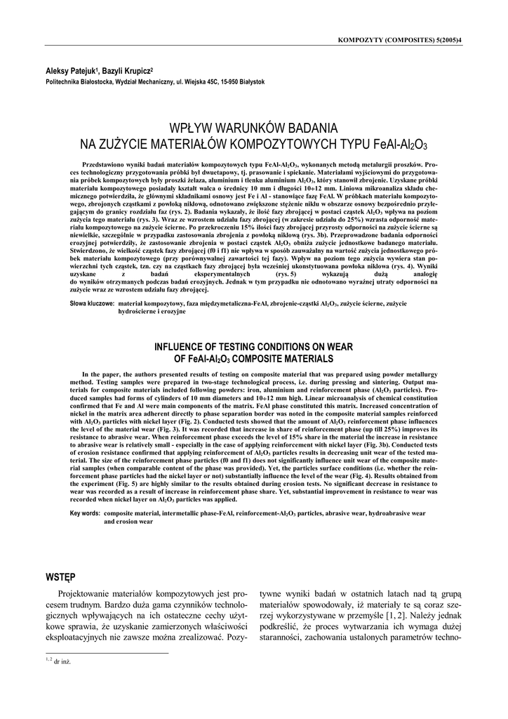 KOMPOZYTY (COMPOSITES) 5(2005)4 Aleksy Patejuk1, Bazyli Krupicz2 Politechnika Białostocka, Wydział Mechaniczny, ul. Wiejska 45C, 15-950 Białystok WPŁYW WARUNKÓW BADANIA NA ZUŻYCIE MATERIAŁÓW KOMPOZYTOWYCH TYPU FeAl-Al2O3 Przedstawiono wyniki badań materiałów kompozytowych typu FeAl-Al2O3, wykonanych metodą metalurgii proszków. Proces technologiczny przygotowania próbki był dwuetapowy, tj. prasowanie i spiekanie. Materiałami wyjściowymi do przygotowania próbek kompozytowych były proszki żelaza, aluminium i tlenku aluminium Al2O3, który stanowił zbrojenie. Uzyskane próbki materiału kompozytowego posiadały kształt walca o średnicy 10 mm i długości 10÷12 mm. Liniowa mikroanaliza składu chemicznego potwierdziła, że głównymi składnikami osnowy jest Fe i Al - stanowiące fazę FeAl. W próbkach materiału kompozytowego, zbrojonych cząstkami z powłoką niklową, odnotowano zwiększone stężenie niklu w obszarze osnowy bezpośrednio przylegającym do granicy rozdziału faz (rys. 2). Badania wykazały, że ilość fazy zbrojącej w postaci cząstek Al2O3 wpływa na poziom zużycia tego materiału (rys. 3). Wraz ze wzrostem udziału fazy zbrojącej (w zakresie udziału do 25%) wzrasta odporność materiału kompozytowego na zużycie ścierne. Po przekroczeniu 15% ilości fazy zbrojącej przyrosty odporności na zużycie ścierne są niewielkie, szczególnie w przypadku zastosowania zbrojenia z powłoką niklową (rys. 3b). Przeprowadzone badania odporności erozyjnej potwierdziły, że zastosowanie zbrojenia w postaci cząstek Al2O3 obniża zużycie jednostkowe badanego materiału. Stwierdzono, że wielkość cząstek fazy zbrojącej (f0 i f1) nie wpływa w sposób zauważalny na wartość zużycia jednostkowego próbek materiału kompozytowego (przy porównywalnej zawartości tej fazy). Wpływ na poziom tego zużycia wywiera stan powierzchni tych cząstek, tzn. czy na cząstkach fazy zbrojącej była wcześniej ukonstytuowana powłoka niklowa (rys. 4). Wyniki uzyskane z badań eksperymentalnych (rys. 5) wykazują dużą analogię do wyników otrzymanych podczas badań erozyjnych. Jednak w tym przypadku nie odnotowano wyraźnej utraty odporności na zużycie wraz ze wzrostem udziału fazy zbrojącej. Słowa kluczowe: materiał kompozytowy, faza międzymetaliczna-FeAl, zbrojenie-cząstki Al2O3, zużycie ścierne, zużycie hydrościerne i erozyjne INFLUENCE OF TESTING CONDITIONS ON WEAR OF FeAl-Al2O3 COMPOSITE MATERIALS In the paper, the authors presented results of testing on composite material that was prepared using powder metallurgy method. Testing samples were prepared in two-stage technological process, i.e. during pressing and sintering. Output materials for composite materials included following powders: iron, aluminium and reinforcement phase (Al2O3 particles). Produced samples had forms of cylinders of 10 mm diameters and 10÷12 mm high. Linear microanalysis of chemical constitution confirmed that Fe and Al were main components of the matrix. FeAl phase constituted this matrix. Increased concentration of nickel in the matrix area adherent directly to phase separation border was noted in the composite material samples reinforced with Al2O3 particles with nickel layer (Fig. 2). Conducted tests showed that the amount of Al2O3 reinforcement phase influences the level of the material wear (Fig. 3). It was recorded that increase in share of reinforcement phase (up till 25%) improves its resistance to abrasive wear. When reinforcement phase exceeds the level of 15% share in the material the increase in resistance to abrasive wear is relatively small - especially in the case of applying reinforcement with nickel layer (Fig. 3b). Conducted tests of erosion resistance confirmed that applying reinforcement of Al2O3 particles results in decreasing unit wear of the tested material. The size of the reinforcement phase particles (f0 and f1) does not significantly influence unit wear of the composite material samples (when comparable content of the phase was provided). Yet, the particles surface conditions (i.e. whether the reinforcement phase particles had the nickel layer or not) substantially influence the level of the wear (Fig. 4). Results obtained from the experiment (Fig. 5) are highly similar to the results obtained during erosion tests. No significant decrease in resistance to wear was recorded as a result of increase in reinforcement phase share. Yet, substantial improvement in resistance to wear was recorded when nickel layer on Al2O3 particles was applied. Key words: composite material, intermetallic phase-FeAl, reinforcement-Al2O3 particles, abrasive wear, hydroabrasive wear and erosion wear WSTĘP Projektowanie materiałów kompozytowych jest procesem trudnym. Bardzo duża gama czynników technologicznych wpływających na ich ostateczne cechy użytkowe sprawia, że uzyskanie zamierzonych właściwości eksploatacyjnych nie zawsze można zrealizować. Pozy1, 2 dr inż. tywne wyniki badań w ostatnich latach nad tą grupą materiałów spowodowały, iż materiały te są coraz szerzej wykorzystywane w przemyśle [1, 2]. Należy jednak podkreślić, że proces wytwarzania ich wymaga dużej staranności, zachowania ustalonych parametrów techno- 89 Wpływ warunków badania na zużycie materiałów kompozytowych typu FeAl-Al2O3 METODYKA I WYNIKI BADAŃ Wcześniejsze badania własne dotyczące pomiarów zużycia ściernego i erozyjnego [11, 13] wykazały, że od- porność na zużycie badanego materiału kompozytowego wzrasta wraz ze spadkiem wielkości cząstek fazy zbrojącej przy takim samym udziale objętościowym tej fazy w kompozycie. Kolejną prawidłowością zaobserwowaną podczas wcześniejszych badań jest to, że w przypadku zastosowania powłoki niklowej na cząstkach fazy zbrojącej odporność na ścieranie znacząco poprawi się - szczególnie, gdy materiał kompozytowy posiadał mniejszą ilość zbrojenia (10%) - rys. 1 (frakcja cząstek zbr