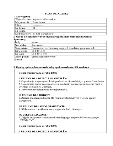 PLAN DZIAŁANIA 1. Adres gminy Województwo Kujawsko-Pomorskie Miejscowość Baruchowo Ulica ----------Nr domu 54 Nr lokalu ----------Kod pocztowy 87-821 Baruchowo 2. Osoba do kontaktów roboczych z Regionalnym Ośrodkiem Polityki Społecznej Imię Aneta Nazwisko Paczyńska Stanowisko Stanowisko ds. funduszy unijnych i środków pomocowych Nr telefonu 054 2845-611 Nr faksu 054 2845-848 Adres poczty [email protected] e-mail 3. Ogólny opis zaplanowanych usług społecznych (ok. 500 znaków) Usługi zrealizowane w roku 2008: I. USŁUGI DLA DZIECI I MŁODZIEŻY: 1. Organizacja wypoczynku letniego dla dzieci i młodzieży z gminy Baruchowo. 2 .Organizacja czasu wolnego dzieci i młodzieży poprzez prowadzenie zajęć w świetlicy wiejskiej w Czarnem. 3. Szkolenie młodzieży uzdolnionej sportowo. II. USŁUGI DLA RODZIN: 1. Zajęcia socjoterapeutyczne dla rodzin dysfunkcyjnych z terenu gminy Baruchowo. III. USŁUGI DLA OSÓB STARSZYCH: 1. Klub seniora – spotkania integracyjne dla ludzi starszych. IV. USŁUGI ŁĄCZONE: 1. Zajęcia muzyczno – taneczne dla istniejącego zespołu folklorystycznego „SWOJACY” . Usługi zrealizowane w roku 2009: I. USŁUGI DLA DZIECI I MŁODZIEŻY: 1. Organizacja czasu wolnego dzieci i młodzieży poprzez prowadzenie zajęć w Świetlicy Wiejskiej w Czarnem. 2. Animacja życia kulturalnego wśród dzieci i młodzieży, organizacja wycieczek. 3. Organizacja obozu szkoleniowego dla młodzieży uzdolnionej sportowo. II. USŁUGI DLA RODZIN: 1. Zajęcia socjoterapeutyczne dla rodzin dysfunkcyjnych z terenu gminy Baruchowo. III. USŁUGI DLA OSÓB STARSZYCH: 1. Klub Seniora- spotkania integracyjne dla osób starszych. IV. USŁUGI ŁĄCZONE: 1. Integracja lokalnego środowiska poprzez organizację festynu rodzinnego. Usługi planowane do realizacji w roku 2010 I. USŁUGI DLA DZIECI I MŁODZIEŻY: 1. Organizacja czasu wolnego dzieci i młodzieży poprzez prowadzenie zajęć w Świetlicy Wiejskiej w Czarnem. II. USŁUGI DLA OSÓB STARSZYCH: 1. Klub Seniora- spotkania integracyjne dla osób starszych. III. USŁUGI ŁĄCZONE 1. Wspólna integracja mieszkańców Gminy Baruchowo z gośćmi z zaprzyjaźnionej gminy francuskiej. IV. USŁUGI SZKOLENIOWE ( wyjazdy studyjne) 4. Czy planowane usługi są zgodne z zapisami w planach strategicznych gminy (w tym w strategii rozwiązywania problemów społecznych, jeśli istnieje)? TAK Proszę zacytować odpowiednie zapisy: Gmina Baruchowo posiada Gminną Strategię Rozwiązywania Problemów Społecznych na lata 208-2015. Strategia została uchwalona dnia 27 grudnia 2008 roku Uchwałą Rady Gminy Baruchowo Nr XXI/152/08. Poniższe cytaty zawarte są w części programowej strategii, w wizji rozwoju społecznego oraz w celach priorytetowych i celach szczegółowych. I. USŁUGI DLA DZIECI I MŁODZIEŻY: 1. Organizacja czasu wolnego dzieci i młodzieży poprzez prowadzenie zajęć w Świetlicy Wiejskiej w Czarnem. Zapisy ze Strategii: Cel priorytetowy: Zwiększenie aspiracji edukacyjnych i możliwości kształcenia się Cele szczegółowe: zapewnienie dodatkowych zajęć dzieciom poprzez np.: -organizowanie wycieczek edukacyjnych, krajoznawczych dla dzieci i młodzieży z gminy, -organizowanie zajęć sportowych. 2. Animacja życia kulturalnego wśród dzieci i młodzieży, organizacja wycieczek. Zapisy ze Strategii: Cel priorytetowy: Wzmocnienie rodziny: oświata i wychowanie dzieci i rodziców Cele szczegółowe: upowszechnienie aktywnych form spędzania czasu wolnego poprzez: - organizację zajęć, imprez rekreacyjno-integracyjnych dla rodzin, -organizowanie zróżnicowanych form turystyki krajoznawczej i kwalifikowanej, między innymi wycieczki rowerowe i przełajowe dla rodzin. Cel priorytetowy: Zwiększenie aspiracji edukacyjnych i możliwości kształcenia się cele szczegółowe: zapewnienie dodatkowych zajęć dzieciom poprzez: -organizowanie wycieczek edukacyjnych, krajoznawczych dla dzieci i młodzieży z gminy, -organizowanie zajęć sportowych. 3. Organizacja obozu szkoleniowego dla młodzieży uzdolnionej sportowo. Zapisy ze Strategii: Cel priorytetowy: Zwiększenie aspiracji edukacyjnych i możliwości kształcenia się Cele szczegółowe: zapewnienie dodatkowych zajęć dzieciom poprzez organizowanie zajęć sportowych. II. USŁUGI DLA RODZIN: 1. Zajęcia socjoterapeutyczne dla rodzin dysfunkcyjnych z terenu gminy Baruchowo. Zapisy ze Strategii: Cel priorytetowy: Wzmocnienie rodziny: oświata i wychowanie dzieci i rodziców Cele szczegółowe: a) zacieśnienie/wzmocnienie więzi w rodzinie poprzez: - organizowanie akcji „Dni Rodziny”, - inicjowanie/tworzenie/wdrażanie programów umożliwiających pogłębianie więzi rodzinnych w oparciu o tradycję, obyczajowość i historię własnej rodziny b) pedagogizacja rodziców: umiejętności wychowawcze i wzorce osobowe., np.: - organizowanie zajęć informacyjno-warsztatowych wspomagających wiedzę rodziców na temat rozwoju dzieci i młodzieży, - budowanie, rozwijanie poradnictwa i edukacji dla rodziców służących rozpoznawaniu zagrożeń i uzależnień dzieci i młodzieży d) przeciwdziałanie uzależnieniom poprzez: - cykliczne szkolenia związane z uzależnieniami dla rodziców III. USŁUGI DLA OSÓB STARSZYCH: 1. Klub Seniora- spotkania integracyjne dla osób starszych. Zapisy ze Strategii: Cel priorytetowy: Łączymy pokolenia: opieka, aktywizacja i integracja seniorów Cele szczegółowe: a) rozszerzenie i urozmaicenie oferty zajęć dla osób starszych, np.: -utworzenie i prowadzenie Klubów Seniora, -organizowanie wycieczek, wspólnych spotkań dla seniorów, b)zwiększenie liczby seniorów uczestniczących w życiu społeczności lokalnej poprzez - organizowanie imprez wielopokoleniowych celem przekazywania młodemu pokoleniu tradycji oraz dawnych obyczajów IV. USŁUGI ŁĄCZONE: 1. Integracja lokalnego środowiska poprzez organizację festynu rodzinnego. Zapisy ze Strategii: Cel priorytetowy: 1.Rozwój turystyki i sportu Cele szczegółowe: promocja 