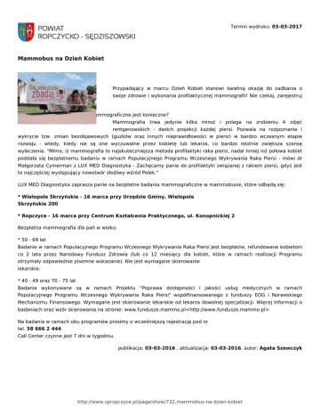 Termin wydruku: 03-03-2017 Mammobus na Dzień Kobiet Mammobus na Dzień Kobiet Przypadający w marcu Dzień Kobiet stanowi świetną okazję do zadbania o swoje zdrowie i wykonania profilaktycznej mammografii! Nie czekaj, zarejestruj się już teraz! Masz wątpliwość, czy badanie mammograficzne jest konieczne? Mammografia trwa jedynie kilka minut i polega na zrobieniu 4 zdjęć rentgenowskich - dwóch projekcji każdej piersi. Pozwala na rozpoznanie i wykrycie tzw. zmian bezobjawowych (guzków oraz innych nieprawidłowości w piersi) w bardzo wczesnym etapie rozwoju - wtedy, kiedy nie są one wyczuwalne przez kobietę lub lekarza, co bardzo istotnie zwiększa szansę wyleczenia. "Mimo, iż mammografia to najskuteczniejsza metoda profilaktyki raka piersi, nadal mniej niż połowa kobiet poddała się bezpłatnemu badaniu w ramach Populacyjnego Programu Wczesnego Wykrywania Raka Piersi - mówi dr Małgorzata Cymerman z LUX MED Diagnostyka - Zachęcamy panie do profilaktyki związanej z rakiem piersi, gdyż jest to najczęściej występujący nowotwór złośliwy wśród Polek." LUX MED Diagnostyka zaprasza panie na bezpłatne badania mammograficzne w mammobusie, które odbędą się: * Wielopole Skrzyńskie - 16 marca przy Urzędzie Gminy, Wielopole Skrzyńskie 200 * Ropczyce - 16 marca przy Centrum Kształcenia Praktycznego, ul. Konopnickiej 2 Bezpłatna mammografia dla pań w wieku: * 50 - 69 lat Badanie w ramach Populacyjnego Programu Wczesnego Wykrywania Raka Piersi jest bezpłatne, refundowane kobietom co 2 lata przez Narodowy Fundusz Zdrowia (lub co 12 miesięcy dla kobiet, które w ramach realizacji Programu otrzymały odpowiednie pisemne wskazanie). Nie jest wymagane skierowanie lekarskie. * 40 - 49 oraz 70 - 75 lat Badania wykonywane są w ramach Projektu "Poprawa dostępności i jakości usług medycznych w ramach Populacyjnego Programu Wczesnego Wykrywania Raka Piersi" współfinansowanego z funduszy EOG i Norweskiego Mechanizmu Finansowego. Wymagane jest skierowanie lekarskie od lekarza dowolnej specjalizacji. Więcej Informacji o badaniach oraz wzór skierowania na stronie: www.fundusze.mammo.pl<http://www.fundusze.mammo.pl> Na badania w ramach obu programów prosimy o wcześniejszą rejestrację pod nr tel. 58 666 2 444 Call Center czynne jest 7 dni w tygodniu. publikacja: 03-03-2016 , aktualizacja: 03-03-2016, autor: Agata Szewczyk http://www.spropczyce.pl/page/show/732,mammobus-na-dzien-kobiet
