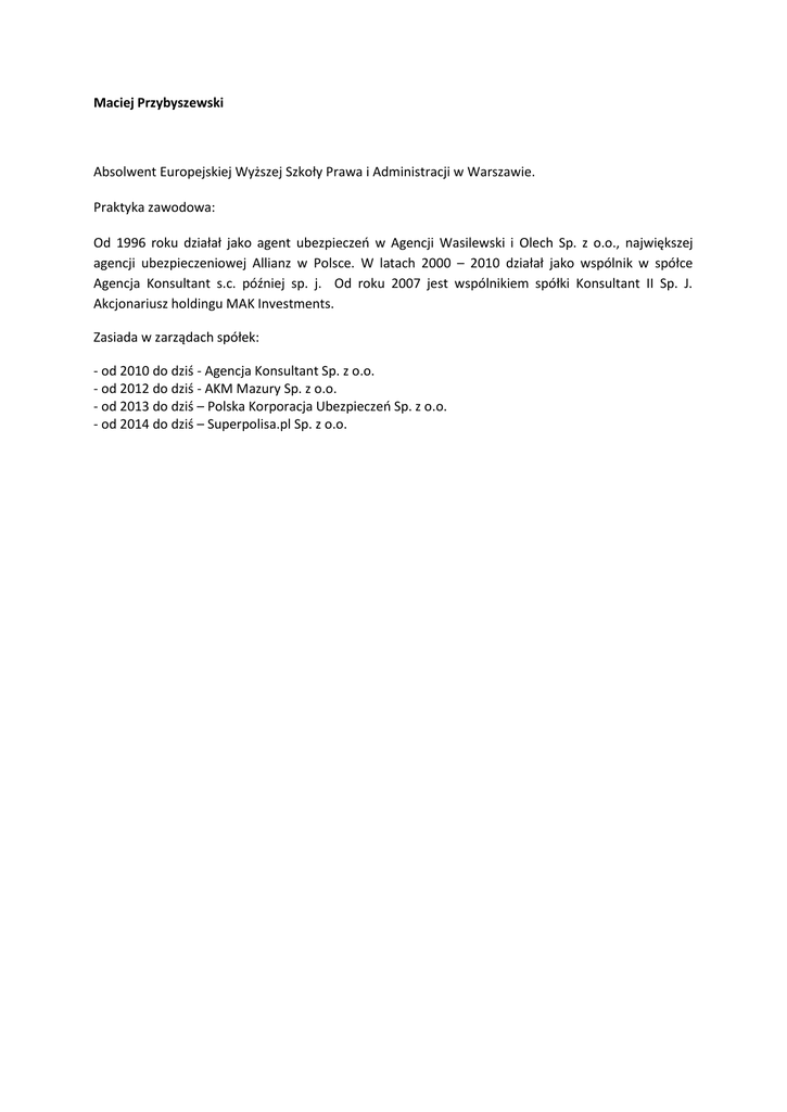 Maciej Przybyszewski Absolwent Europejskiej Wyższej Szkoły Prawa i Administracji w Warszawie. Praktyka zawodowa: Od 1996 roku działał jako agent ubezpieczeń w Agencji Wasilewski i Olech Sp. z o.o., największej agencji ubezpieczeniowej Allianz w Polsce. W latach 2000 – 2010 działał jako wspólnik w spółce Agencja Konsultant s.c. później sp. j. Od roku 2007 jest wspólnikiem spółki Konsultant II Sp. J. Akcjonariusz holdingu MAK Investments. Zasiada w zarządach spółek: - od 2010 do dziś - Agencja Konsultant Sp. z o.o. - od 2012 do dziś - AKM Mazury Sp. z o.o. - od 2013 do dziś – Polska Korporacja Ubezpieczeń Sp. z o.o. - od 2014 do dziś – Superpolisa.pl Sp. z o.o.