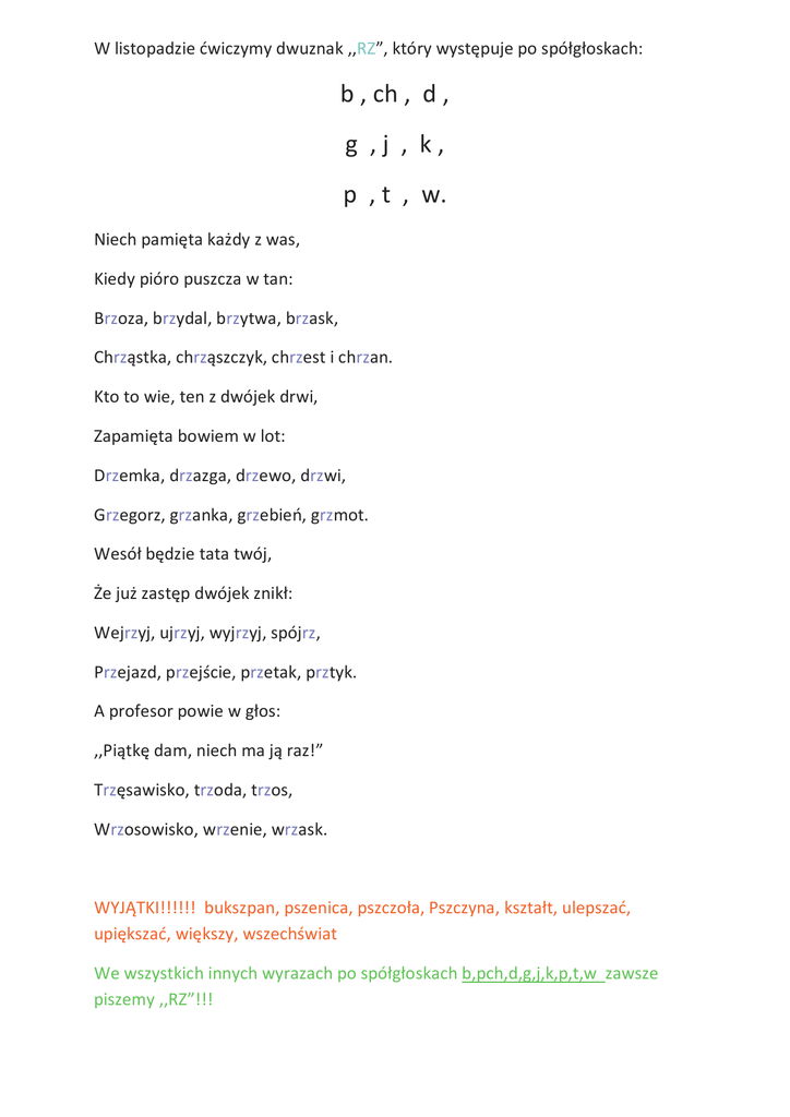 W listopadzie ćwiczymy dwuznak ,,RZ”, który występuje po spółgłoskach: b , ch , d , g ,j , k, p , t , w. Niech pamięta każdy z was, Kiedy pióro puszcza w tan: Brzoza, brzydal, brzytwa, brzask, Chrząstka, chrząszczyk, chrzest i chrzan. Kto to wie, ten z dwójek drwi, Zapamięta bowiem w lot: Drzemka, drzazga, drzewo, drzwi, Grzegorz, grzanka, grzebień, grzmot. Wesół będzie tata twój, Że już zastęp dwójek znikł: Wejrzyj, ujrzyj, wyjrzyj, spójrz, Przejazd, przejście, przetak, prztyk. A profesor powie w głos: ,,Piątkę dam, niech ma ją raz!” Trzęsawisko, trzoda, trzos, Wrzosowisko, wrzenie, wrzask. WYJĄTKI!!!!!! bukszpan, pszenica, pszczoła, Pszczyna, kształt, ulepszać, upiększać, większy, wszechświat We wszystkich innych wyrazach po spółgłoskach b,pch,d,g,j,k,p,t,w zawsze piszemy ,,RZ”!!!