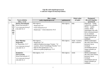 Ulgi dla osób niepełnosprawnych w zakresie wstępu do instytucji kultury Lp. 1 Mu zeu m Okr ęgo we Nazwa obiektu Adres, nr tel. Ratusz Staromiejski Rynek Staromiejski 1 www.muzeum.torun.pl (56) 660 56 12 Bilet wstępu osoby niepełnosprawne opiekunowie Dzień wolny od opłat bilet ulgowy: - ekspozycje 6 zł - wieża ratuszowa 6 zł - ekspozycje + wieża ratuszowa 10 zł bilet ulgowy brak Dom Mikołaja Kopernika ul. Kopernika 15/17 www.muzeum.torun.pl (56) 660 56 13 bilet ulgowy: - ekspozycje 7 zł - makieta średniowiecznego Torunia 7 zł - wystawa „Świat Toruńskiego Piernika” 6 zł - bilet na dwie propozycje 11 zł - biliet na szystkie propozycje 15 zł bilet ulgowy środa - wystawy stałe i czasowe Kamienica Pod Gwiazdą Rynek Staromiejski 35 www.muzeum.torun.pl (56) 660 56 12 bilet ulgowy 4 zł bilet ulgowy środa 2 Dostępność dla osób niepełnosprawnych Ekpozycje – winda, wejście bez schodów, Wieża – wąskie schody, obiekt niedostępny dla osób, które muszą poruszać się na wózkach inwalidzkich lub nie mogą wchodzić po schodach. Obiekt niedostępny dla osób, które muszą poruszać się na wózkach inwalidzkich lub nie mogą wchodzić po schodach. Obiekt niedostępny dla osób, które muszą poruszać się na wózkach inwalidzkich lub nie mogą wchodzić po schodach. Dom Eskenów ul. Łazienna 16 www.muzeum.torun.pl (56) 660 56 12 bilet ulgowy: - ekspozycje 4 zł - „Księga Toruń” 3 D – pokazy makiety historycznej Torunia 6 zł - ekspozycje + Księga Toruń 7 zł bilet ulgowy środa - ekspozycje W obiekcie jest winda, wejście do oddziału – schody, dostępny schodołaz dla osób poruszających się na wózkach inwalidzkich. Muzeum Podróżników im. T. Halika ul. Franciszkańska 9/11 www.muzeum.torun.pl (56) 660 56 12 bilety ulgowe 5 zł bilet ulgowy środa Wejście do oddziału bez schodów, winda umożliwiająca dostęp do całego obiektu za wyjątkiem 1 sali (schody). 2 Centrum Sztuki Współczesnej Znaki Czasu w Toruniu ul. Wały Gen. Władysława Sikorskiego 13 www.csw.torun.pl (56) 610 97 18,(56) 610 97 18 bilet ulgowy 5 zł bezpłatnie czwartek Obiekt całkowicie dostępny dla osób niepełnosprawnych ruchowo. 3 Muzeum Etnograficzne im. Marii Znamierowskiej Prufferowej ul. Wały Generała Władysława Sikorskiego 19 www.etnomuzeum.pl (56) 622 80 91 bilet ulgowy 6 zł bilet ulgowy środa - ekspozycje stałe Obekt dostepny dla osób niepełnosprawnych ruchowo (z wyjątkiem piętra Arsenału, gdzie odbywają się wystawy czasowe). 3 4 Centrum Kultury Zamek Krzyżacki ul. Przedzamcze 3 www.zamek.torun.pl (56) 321 08 89 bilet ulgowy 5 zł brak ulg brak 5 Żywe Muzeum Piernika /prywatne/ ul. Rabiańska 9 www.muzeumpiernika.pl (56) 663 66 17 - dzieci i młodzież niepełnosprawna – bezpłatnie - dorosłe osoby niepełnosprawne 8 zł brak ulg brak Obiekt jest dostępny częściowo – dziedziniec oraz wjazd na scenkę z widokiem na spektakl „Komturia”. Schodołaz 6 Galeria Sztuki Wozownia /Samorząd województwa/ ul. Rabiańska 20 www.wozownia.pl (56) 622 63 39 bilet ulgowy 3 zł brak ulg wtorek -wystawy niedzielawydarzenia Obiekt jest dostępny częściowo – parter. Brak windy. 7 Centrum Kultury „Dwór Artusa” Rynek Staromiejski 6 www.artus.torun.pl (56) 655 49 39 brak ulg dla osób niepełnosprawnych cenabiletu uzalezniona od wydarzenia brak ulg brak Obiekt całkowicie dostępny dla osób niepełnosprawnych ruchowo. /-/ 4