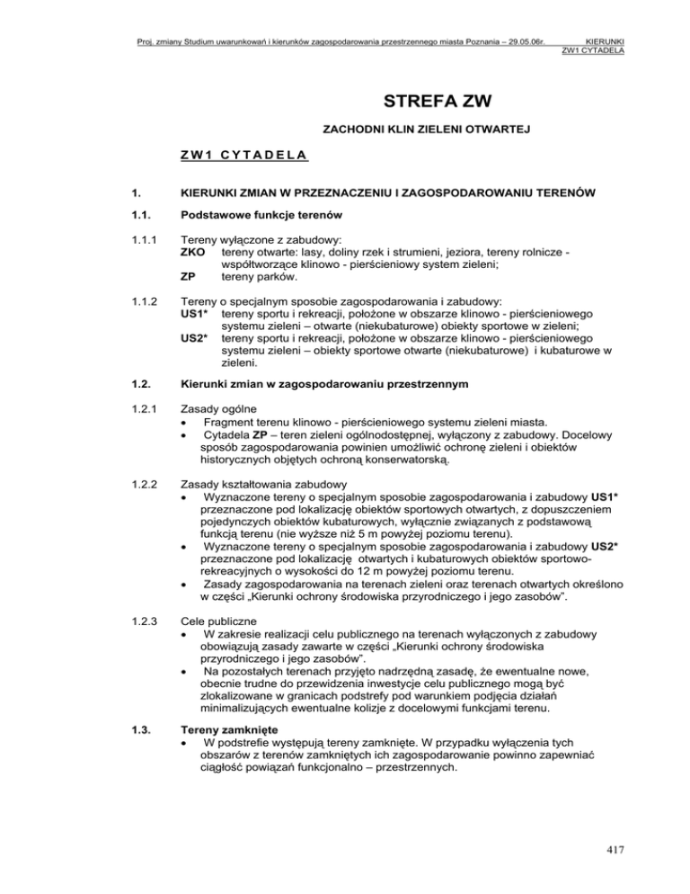 Proj. zmiany Studium uwarunkowań i kierunków zagospodarowania przestrzennego miasta Poznania – 29.05.06r. KIERUNKI ZW1 CYTADELA STREFA ZW ZACHODNI KLIN ZIELENI OTWARTEJ ¶ ZW1 CYTADELA 1. KIERUNKI ZMIAN W PRZEZNACZENIU I ZAGOSPODAROWANIU TERENÓW 1.1. Podstawowe funkcje terenów 1.1.1 Tereny wyłączone z zabudowy: ZKO tereny otwarte: lasy, doliny rzek i strumieni, jeziora, tereny rolnicze współtworzące klinowo - pierścieniowy system zieleni; ZP tereny parków. 1.1.2 Tereny o specjalnym sposobie zagospodarowania i zabudowy: US1* tereny sportu i rekreacji, położone w obszarze klinowo - pierścieniowego systemu zieleni – otwarte (niekubaturowe) obiekty sportowe w zieleni; US2* tereny sportu i rekreacji, położone w obszarze klinowo - pierścieniowego systemu zieleni – obiekty sportowe otwarte (niekubaturowe) i kubaturowe w zieleni. 1.2. Kierunki zmian w zagospodarowaniu przestrzennym 1.2.1 Zasady ogólne • Fragment terenu klinowo - pierścieniowego systemu zieleni miasta. • Cytadela ZP – teren zieleni ogólnodostępnej, wyłączony z zabudowy. Docelowy sposób zagospodarowania powinien umożliwić ochronę zieleni i obiektów historycznych objętych ochroną konserwatorską. 1.2.2 Zasady kształtowania zabudowy • Wyznaczone tereny o specjalnym sposobie zagospodarowania i zabudowy US1* przeznaczone pod lokalizację obiektów sportowych otwartych, z dopuszczeniem pojedynczych obiektów kubaturowych, wyłącznie związanych z podstawową funkcją terenu (nie wyższe niż 5 m powyżej poziomu terenu). • Wyznaczone tereny o specjalnym sposobie zagospodarowania i zabudowy US2* przeznaczone pod lokalizację otwartych i kubaturowych obiektów sportoworekreacyjnych o wysokości do 12 m powyżej poziomu terenu. • Zasady zagospodarowania na terenach zieleni oraz terenach otwartych określono w części „Kierunki ochrony środowiska przyrodniczego i jego zasobów”. 1.2.3 Cele publiczne • W zakresie realizacji celu publicznego na terenach wyłączonych z zabudowy obowiązują zasady zawarte w części „Kierunki ochrony środowiska przyrodniczego i jego zasobów”. • Na pozostałych terenach przyjęto nadrzędną zasadę, że ewentualne nowe, obecnie trudne do przewidzenia inwestycje celu publicznego mogą być zlokalizowane w granicach podstrefy pod warunkiem podjęcia działań minimalizujących ewentualne kolizje z docelowymi funkcjami terenu. 1.3. Tereny zamknięte • W podstrefie występują tereny zamknięte. W przypadku wyłączenia tych obszarów z terenów zamkniętych ich zagospodarowanie powinno zapewniać ciągłość powiązań funkcjonalno – przestrzennych. 417 Proj. zmiany Studium uwarunkowań i kierunków zagospodarowania przestrzennego miasta Poznania – 29.05.06r. 418 KIERUNKI ZW1 CYTADELA 2. KIERUNKI ZMIAN W STRUKTURZE PRZESTRZENNEJ 2.1. Kształtowanie ładu przestrzennego 2.1.1 Zasady ogólne: • Nowe obiekty architektoniczne (dotyczy terenu US1*, US2*) muszą uwzględniać kontekst urbanistyczno-architektoniczny podstref sąsiadujących oraz respektować charakter przyległego, publicznego parku Cytadela. • Należy dążyć do: o kształtowania lokalnego systemu elementów szczególnych identyfikujących przestrzeń; o zachowania ciągłości rozwiązań funkcjonalno-przestrzennych z innymi podstrefami – m.in. stworzenia połączeń pieszych i rowerowych z układem urbanistycznymi Sołacza (ZW2), z osiedlem na Murawie i Stare Winogrady (B1), centrum (A) oraz doliną rzeki Warty (podstrefa ZN2). • Zagospodarowanie podstrefy musi zapewniać ciągłość strukturalną systemu klinów zieleni (tzn. łączyć się funkcjonalnie i przestrzennie z parkami na Sołaczu i z bulwarami w dolinie rzeki Warty). 2.1.2 Obiekty handlowe • W podstrefie zakazuje się lokalizowania obiektów handlowych o powierzchni sprzedaży powyżej 300 m2 . 2.2. Działania zwiększające pozytywne oddziaływanie barier funkcjonalnoprzestrzennych • W celu zniwelowania oddziaływania bariery przestrzennej jakimi są tory kolejowe na południu, oddzielające podstrefę od centrum (strefy A), wymaga się udrożnienia istniejących powiązań pieszych i rowerowych łączących rozdzielone zespoły urbanistyczne. 2.3. Kształtowanie fizjonomii miasta 2.3.1 Miejsca szczególne – „bramy centrum miasta” • Należy zwrócić szczególna uwagę na zagospodarowanie terenów w miejscach szczególnych trasy I ramy tj. jej skrzyżowań z ulicami głównymi: o Garbary – projektowana ulica ringu śródmiejskiego, o alei Niepodległości – Przepadek. • Przeobrażenia w obrębie tych obszarów muszą respektować kulturowe i historyczne wartości miejsca. 2.3.2 Dominanty przestrzenne • Wprowadza się zakaz lokalizowania dominant przestrzennych w obrębie podstrefy, z wyjątkiem pojedynczych lokalnych elementów kompozycyjnych lokalizowanych w parku, krystalizujących przestrzeń Cytadeli oraz bram centrum miasta. • Lokalizowanie budynków niskich i ewentualnie średniowysokich musi być wprowadzone za zgodą konserwatora. • Wprowadza się zakaz lokalizowania jakichkolwiek budynków wysokich i wysokościowych. 2.3.3 Elementy dysharmonizujące krajobraz miejski • W celu poprawienia estetyki miasta postuluje się zlikwidowanie przestarzałych technicznie, wyeksploatowanych, naziemnych i napowietrznych elementów infrastruktury oraz przełożenie ich pod ziemię. Zaleca się lokalizowanie nowej infrastruktury technicznej pod ziemią. • Urządzenia reklamowe o Dopuszczalne w podstrefie urządzenia reklamowe należy lokalizować z uwzględnieniem generalnych zasad lokalizacji określonych w części ogólnej w punkcie „Zasady lokalizowania urządzeń reklamowych i informacyjnych”. o Na terenach ZKO, ZP, US1* zakazuje się lokalizowania urządzeń reklamowych. Proj. zmiany Studium uwarunkowań i kierunków zagospodarowania przestrzennego miasta Poznania – 29.05.06r. KIERUNKI ZW1 CYTADELA Na terenach US2*: - zakazuje się lokalizowania urządzeń reklamowych, z