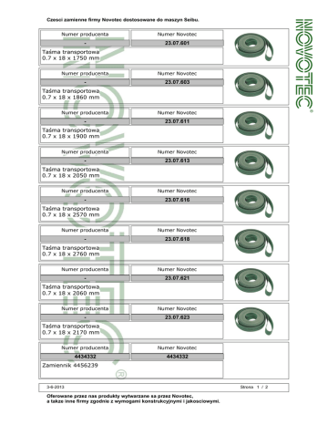 Czesci zamienne firmy Novotec dostosowane do maszyn Seibu. Numer producenta Numer Novotec - 23.07.601 Taśma transportowa 0.7 x 18 x 1750 mm Numer producenta Numer Novotec - 23.07.603 Taśma transportowa 0.7 x 18 x 1860 mm Numer producenta Numer Novotec - 23.07.611 Taśma transportowa 0.7 x 18 x 1900 mm Numer producenta Numer Novotec - 23.07.613 Taśma transportowa 0.7 x 18 x 2050 mm Numer producenta Numer Novotec - 23.07.616 Taśma transportowa 0.7 x 18 x 2570 mm Numer producenta Numer Novotec - 23.07.618 Taśma transportowa 0.7 x 18 x 2760 mm Numer producenta Numer Novotec - 23.07.621 Taśma transportowa 0.7 x 18 x 2060 mm Numer producenta Numer Novotec - 23.07.623 Taśma transportowa 0.7 x 18 x 2170 mm Numer producenta Numer Novotec 4434332 4434332 Zamiennik 4456239 3-6-2013 Oferowane przez nas produkty wytwarzane sa przez Novotec, a takze inne firmy zgodnie z wymogami konstrukcyjnymi i jakosciowymi. Strona 1 / 2 Czesci zamienne firmy Novotec dostosowane do maszyn Seibu. Numer producenta Numer Novotec 4435332 4435332 Zamiennik 4456239 Numer producenta Numer Novotec 4451771 24.11.025 Prowadnik diamentowy Górny/dolny Ø 0.210 mm Numer producenta Numer Novotec 4451771 24.11.035 Prowadnik diamentowy Górny/dolny Ø 0.260 mm Numer producenta Numer Novotec 4456239 23.06.450 Element zasilający Numer producenta Numer Novotec 4469013 23.06.451 Element zasilający Numer producenta Numer Novotec 5428161 24.61.001 Dysza Ø 3 mm 3-6-2013 Oferowane przez nas produkty wytwarzane sa przez Novotec, a takze inne firmy zgodnie z wymogami konstrukcyjnymi i jakosciowymi. Strona 2 / 2