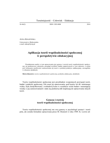 Teraźniejszość – Człowiek – Edukacja Nr 66(2) ISSN 1505-8808 2014 ANNA KRAJEWSKA Uniwersytet w Białymstoku e-mail: [email protected] Aplikacja teorii współzależności społecznej w perspektywie edukacyjnej Przedmiotem analiz w tym opracowaniu jest geneza i rozwój teorii współzależności społecznej, jej podstawowe założenia, przegląd wyników badań empirycznych w tym zakresie, a celem jest wykazanie możliwości zastosowania tej teorii w polskiej praktyce edukacyjnej, szczególnie w obszarze dydaktyki. Słowa kluczowe: teoria współzależności społecznej, praktyka edukacyjna, dydaktyka Teoria współzależności społecznej jest przykładem wzajemnych powiązań teorii, badań i praktyki społecznej. Od czasu jej opracowania, pod koniec lat 40. minionego wieku, była modyfikowana i rozbudowywana w rezultacie wielu badań i narastającej wiedzy o jej zastosowaniach i stała się podstawą lub inspiracją do opracowania innych teorii. Geneza i rozwój teorii współzależności społecznej Teoria współzależności społecznej ma swą genezę w psychologii postaci i teorii pola, ale została formalnie opracowana przez M. Deutsch w roku 1949. K. Lewin od- 56 Anna KRAJEWSKA wołując się do podstaw psychologii postaci i poglądów K. Koffki, wykazał, że istotą grupy jest współzależność między jej członkami, która skutkuje tym, że grupa staje się dynamiczną całością, a więc zmiana stanu jakiegoś członka lub podgrupy zmienia stan każdego innego członka lub podgrupy. Zwrócił uwagę na to, że członkowie grupy są wzajemnie od siebie zależni poprzez wspólnie podzielane cele. Aby zaistniała współzależność, musi być zaangażowana więcej niż jedna osoba lub podmiot i ludzie lub podmioty muszą wpływać na siebie, aby zmiana w stanie jednego powodowała zmianę stanu innych. Ten wpływ następuje w sytuacji natychmiastowej, ponieważ zachowanie każdej osoby jest określone bardziej przez to, jak postrzega tę sytuację niż przez czynniki obiektywne, a więc zachowanie społeczne jest z natury kontekstualne i nie może być zrozumiane poza aktualną przestrzenią życia, do której się odnosi. Ponadto K. Lewin zauważył, że zachowania ludzi w życiu są umotywowane stanami napięcia, które powstają, kiedy postrzegają pożądane cele, a jednocześnie powodują dążenie do ich osiągania. Postrzeganie wspólnych celów w połączeniu z motywacją do ich osiągania jest w ujęciu K. Lewina źródłem współzależności między członkami grupy (za: Johnson, Johnson 2005, s. 287–288). M. Deutsch poszerzył koncepcję K. Lewina poprzez badanie systemów powiązań napięć u różnych ludzi. W roku 1949 przedstawił teorię współzależności społecznej i wykazał, że współzależność może być pozytywna (współdziałanie/współpraca), negatywna (rywalizacja) lub może nie istnieć (wysiłek indywidualny) (Deutsch 1949). Przyjął, że współzależność pozytywna istnieje, gdy występuje pozytywny związek między jednostkami osiągającymi cel, a jednostki spostrzegają, że mogą osiągnąć swoje cele wtedy i tylko wtedy, jeśli inne osoby, z którymi wspólnie działają, osiągną ich cele. Natomiast współzależność negatywna istnieje wówczas, gdy występuje negatywny związek między jednostkami osiągającymi cel, a jednostki spostrzegają, że mogą osiągnąć swoje cele wtedy i tylko wtedy, gdy inne jednostki, z którymi konkurują (rywalizują), zawiodą – nie osiągną swoich celów (tamże, s. 129–140). W ujęciu M. Deutsch współzależność społeczna nie istnieje, kiedy brak jest związków między jednostkami osiągającymi cele, a jednostki spostrzegają, że osiąganie przez nie celów nie łączy się z osiąganiem celów przez innych (tamże, s. 145). W latach 70. i kolejnych minionego wieku wielu badaczy podejmowało analizy teoretyczne i badania empiryczne w zakresie teorii współzależności społecznej, co umożliwiało jej wieloaspektowy rozwój. W latach 80. D.W. Johnson i R.T. Johnson, rozwijając koncepcje K. Lewina i M. Deutsch, przedstawili poszerzoną i uogólnioną postać teorii współzależności społecznej (Johnson, Johnson 1989; 2005; 2009). Przyjęli, że (...) współzależność społeczna istnieje wówczas, gdy na wyniki uzyskiwane przez jednostki wpływają działania innych (...) Są dwa rodzaje współzależności społecznej – pozytywna (współdziałanie/współpraca), kiedy działania jednostek wspierają osiągnięcie wspólnego celu i negatywna (rywalizacja/konkurowanie), kiedy działania jednostek hamują osiągnięcie celów każdej z jednostek (2009, s. 366). Jednocześnie odróżnili współzależność społeczną od zależności społecznej, niezależności i bezrad- Aplikacja teorii współzależności społecznej w perspektywie edukacyjnej 57 ności. Zależność społeczna istnieje, kiedy na osiągnięcie celu przez osobę A wpływa działanie osoby B, ale odwrotność nie jest możliwa. Niezależność społeczna występuje wówczas, kiedy na osiągnięcie celu przez osobę A nie wpływa działanie osoby B i odwrotnie. W rezultacie jest to indywidualny wysiłek. Natomiast bezradność społeczna przejawia się, gdy ani osoba, ani inni nie mogą wpłynąć na osiągnięcie przez nią celu (tamże, s. 367). Podstawowe założenia teorii współzależności społecznej W teorii współzależności społecznej zakłada się, że (...) struktura celów ludzi znajdujących się w określonej sytuacji decyduje o tym, jak jej uczestnicy wzajemnie na siebie oddziałują, a rodzaje wzajemnych relacji wyznaczają rezultaty tej sytuacji (Johnson, Johnson 2005, s. 292). Cel jest pożądanym, przyszłym stanem rzeczy, końcowym rezultatem pewnych czynności. Struktura celu określa rodzaj współzależności między celami jednostek, co z kolei wyznacza, jak jednostki muszą oddziaływać wzajemnie na siebie, aby osiągnąć swoje cele. W interakcji, we wzajemnym