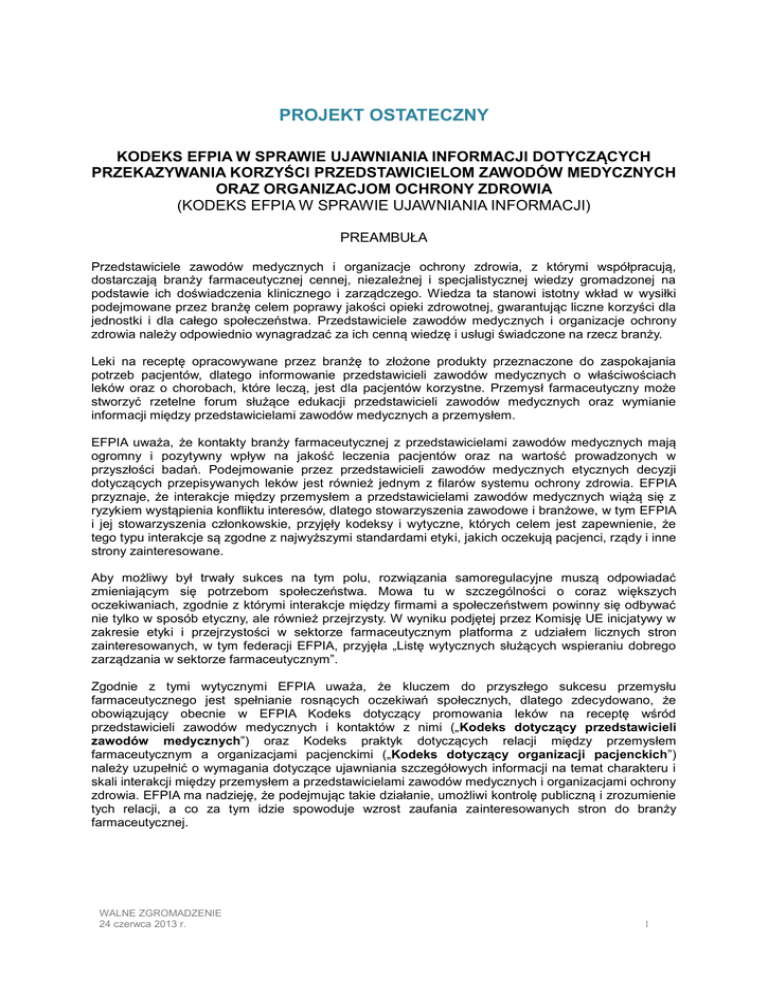 PROJEKT OSTATECZNY KODEKS EFPIA W SPRAWIE UJAWNIANIA INFORMACJI DOTYCZĄCYCH PRZEKAZYWANIA KORZYŚCI PRZEDSTAWICIELOM ZAWODÓW MEDYCZNYCH ORAZ ORGANIZACJOM OCHRONY ZDROWIA (KODEKS EFPIA W SPRAWIE UJAWNIANIA INFORMACJI) PREAMBUŁA Przedstawiciele zawodów medycznych i organizacje ochrony zdrowia, z którymi współpracują, dostarczają branży farmaceutycznej cennej, niezależnej i specjalistycznej wiedzy gromadzonej na podstawie ich doświadczenia klinicznego i zarządczego. Wiedza ta stanowi istotny wkład w wysiłki podejmowane przez branżę celem poprawy jakości opieki zdrowotnej, gwarantując liczne korzyści dla jednostki i dla całego społeczeństwa. Przedstawiciele zawodów medycznych i organizacje ochrony zdrowia należy odpowiednio wynagradzać za ich cenną wiedzę i usługi świadczone na rzecz branży. Leki na receptę opracowywane przez branżę to złożone produkty przeznaczone do zaspokajania potrzeb pacjentów, dlatego informowanie przedstawicieli zawodów medycznych o właściwościach leków oraz o chorobach, które leczą, jest dla pacjentów korzystne. Przemysł farmaceutyczny może stworzyć rzetelne forum służące edukacji przedstawicieli zawodów medycznych oraz wymianie informacji między przedstawicielami zawodów medycznych a przemysłem. EFPIA uważa, że kontakty branży farmaceutycznej z przedstawicielami zawodów medycznych mają ogromny i pozytywny wpływ na jakość leczenia pacjentów oraz na wartość prowadzonych w przyszłości badań. Podejmowanie przez przedstawicieli zawodów medycznych etycznych decyzji dotyczących przepisywanych leków jest również jednym z filarów systemu ochrony zdrowia. EFPIA przyznaje, że interakcje między przemysłem a przedstawicielami zawodów medycznych wiążą się z ryzykiem wystąpienia konfliktu interesów, dlatego stowarzyszenia zawodowe i branżowe, w tym EFPIA i jej stowarzyszenia członkowskie, przyjęły kodeksy i wytyczne, których celem jest zapewnienie, że tego typu interakcje są zgodne z najwyższymi standardami etyki, jakich oczekują pacjenci, rządy i inne strony zainteresowane. Aby możliwy był trwały sukces na tym polu, rozwiązania samoregulacyjne muszą odpowiadać zmieniającym się potrzebom społeczeństwa. Mowa tu w szczególności o coraz większych oczekiwaniach, zgodnie z którymi interakcje między firmami a społeczeństwem powinny się odbywać nie tylko w sposób etyczny, ale również przejrzysty. W wyniku podjętej przez Komisję UE inicjatywy w zakresie etyki i przejrzystości w sektorze farmaceutycznym platforma z udziałem licznych stron zainteresowanych, w tym federacji EFPIA, przyjęła „Listę wytycznych służących wspieraniu dobrego zarządzania w sektorze farmaceutycznym”. Zgodnie z tymi wytycznymi EFPIA uważa, że kluczem do przyszłego sukcesu przemysłu farmaceutycznego jest spełnianie rosnących oczekiwań społecznych, dlatego zdecydowano, że obowiązujący obecnie w EFPIA Kodeks dotyczący promowania leków na receptę wśród przedstawicieli zawodów medycznych i kontaktów z nimi („Kodeks dotyczący przedstawicieli zawodów medycznych”) oraz Kodeks praktyk dotyczących relacji między przemysłem farmaceutycznym a organizacjami pacjenckimi („Kodeks dotyczący organizacji pacjenckich”) należy uzupełnić o wymagania dotyczące ujawniania szczegółowych informacji na temat charakteru i skali interakcji między przemysłem a przedstawicielami zawodów medycznych i organizacjami ochrony zdrowia. EFPIA ma nadzieję, że podejmując takie działanie, umożliwi kontrolę publiczną i zrozumienie tych relacji, a co za tym idzie spowoduje wzrost zaufania zainteresowanych stron do branży farmaceutycznej. WALNE ZGROMADZENIE 24 czerwca 2013 r. 1 EFPIA uważa, że korzyści, jakie gwarantuje pacjentom i innym zainteresowanym stronom przejrzystość tego typu interakcji, są nie do przecenienia. EFPIA przyznaje, że obowiązek ujawniania informacji może wzbudzać obawy związane z ochroną danych, dlatego dąży do współpracy z przedstawicielami zawodów medycznych, aby obawy te wyeliminować. Zdaniem federacji EFPIAprzejrzystość można jednak osiągnąć bez uszczerbku dla prawa przedstawicieli zawodów medycznych do ochrony danych, w związku z czym uważa ona, że przepisy prawne nie powinny wprowadzać nadmiernych ograniczeń w zakresie ujawniania informacji przez przemysł. Niniejszy Kodeks przewiduje ujawnianie informacji dotyczących bezpośredniego i pośredniego przekazywania korzyści przedstawicielom zawodów medycznych. Podejmując decyzję w sprawie sposobu ujawniania tychże informacji, firmy powinny, w miarę możliwości, wskazywać konkretnego przedstawiciela zawodu medycznego (a nie całą organizację ochrony zdrowia) i publikować dotyczące go dane, pod warunkiem, że takie działanie można podjąć z zachowaniem należytej dokładności, spójności i zgodności z obowiązującym prawem. Niniejszy Kodeks nakłada obowiązek ujawniania informacji dotyczących przekazywania korzyści przedstawicielom zawodów medycznych i organizacjom ochrony zdrowia. Zasada ta wejdzie w życie w roku 2016, w którym będzie należało zgłaszać wszelkie przypadki takiego przekazania, jakie miały miejsce w roku 2015. Postanowienia niniejszego Kodeksu zostaną wdrożone przez stowarzyszenia członkowskie EFPIA w sposób zgodny z obowiązującymi przepisami z zakresu prawa konkurencji i ochrony danych oraz z wszelkimi innymi obowiązującymi wymogami prawnymi. ZAKRES OBOWIĄZYWANIA NINIEJSZEGO KODEKSU Niniejszy Kodeks reguluje ujawnianie informacji dotyczących określonych relacji z przedstawicielami zawodów medycznych i organizacjami ochrony zdrowia. Zgodnie z założeniami Kodeks ten będzie stosowany w odniesieniu do relacji z przedstawicielami zawodów medycznych i organizacjami ochrony zdrowia w takim samym stopniu jak istniejące Kodeksy 1 dotyczące przedstawicieli zawodów medycznych i organizacji pacjenckich . Oznacza to, że Kodek