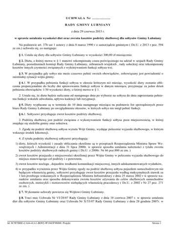 UCH WAŁA Nr …………….. RADY GMINY ŁUB NIANY z dnia 29 czerwca 2015 r. w sprawie ustalenia wysokości diet oraz zwrotu kosztów podróży służbowej dla sołtysów Gminy Łubniany Na podstawie art. 37b ust 1 ustawy z dnia 8 marca 1990 r o samorządzie gminnym ( Dz.U. z 2013 r poz. 594 ze zm.) uchwala się, co następuje: § 1. Ustala się diety dla sołtysów Gminy Łubniany w wysokości 300,00 zł miesięcznie. § 2. Dieta, o której mowa w § 1 stanowi rekompensatę czasu poświęconego na udział w sesjach Rady Gminy Łubniany, posiedzeniach komisji Rady Gminy Łubniany, zebraniach wiejskich , rady sołeckiej oraz rekompensatę kosztów innych czynności związanych z wykonywaniem funkcji sołtysa wsi. § 3. W przypadku gdy sołtys nie może czasowo pełnić swoich obowiązków, zobowiązany jest powiadomić o zaistniałej sytuacji wójta gminy. § 4.1. W przypadku pełnienia funkcji sołtysa w okresie krótszym niż miesiąc, wysokość diety zostanie obliczona proporcjonalnie do liczby dni sprawowania funkcji sołtysa w danym miesiącu, przyjmując za jeden dzień pełnienia obowiązków 1/30 wysokości diety, o której mowa w § 1. 2. Ustala się, że dieta będzie naliczana od następnego dnia po wyborze na sołtysa do dnia zaprzestania pełnienia funkcji wskutek odwołania, upływu kadencji lub rezygnacji. § 5. Diety wypłacane są w terminie do 10 dnia następnego miesiąca na podstawie list sporządzonych przez biuro Rady Gminy Łubniany po uwzględnieniu okresów, w których sołtys nie mógł pełnić funkcji. § 6.1. Sołtysowi przysługuje zwrot kosztów podróży służbowej. 2. Podróżą służbową jest podróż związana z wykonywaniem funkcji sołtysa poza miejscowością, w której znajduje się siedziba gminy oraz sołectwa. 3. Zgodę na podróż służbową sołtysa wyraża Wójt Gminy, wydając polecenie wyjazdu służbowego, w którym wskazuje środek lokomocji. 4. Z tytułu podróży służbowej sołtysowi przysługują: 1) diety, których wysokość i zasady obliczania określone są w przepisach Rozporządzenia Ministra Spraw Wewnętrznych i Administracji z dnia 31 lipca 2000r. w sprawie sposobu ustalania należności z tytułu zwrotu kosztów podróży służbowych radnych gminy ( Dz.U. z 2000r. Nr 66 poz.800 ze zm. ) 2) zwrot kosztów przejazdu z miejscowości określonej przez Wójta Gminy w poleceniu wyjazdu służbowego do miejsca stanowiącego cel podróży i z powrotem, 3) zwrot kosztów noclegu , dojazdów środkami komunikacji miejscowej, innych udokumentowanych wydatków, 4) w przypadku wyrażenia przez Wójta Gminy zgody na podróż służbową sołtysa pojazdem samochodowym nie będącym własnością gminy, sołtysowi przysługuje zwrot kosztów przejazdu według maksymalnych stawek za 1 km przebiegu wskazanych w Rozporządzeniu Ministra Infrastruktury z dnia 25 marca 2002 r w sprawie warunków ustalania oraz sposobu dokonywania zwrotu kosztów używania do celów służbowych samochodów osobowych, motocykli i motorowerów niebędących własnością pracodawcy ( Dz.U. z 2002 r Nr 27 poz. 271 ze zm. ) § 7. Wykonanie uchwały powierza się Wójtowi Gminy Łubniany. § 8. Traci moc Uchwała Nr VI/28/07 Rady Gminy Łubniany z dnia 18 czerwca 2007 r. w sprawie ustalenia diet dla sołtysów Gminy Łubniany oraz Uchwała Nr X/53/07 Rady Gminy Łubniany z dnia 28 grudnia 2007r. w Id: 8C9F5B8E-CA64-41A1-BD92-9F1043F98000. Projekt Strona 1 sprawie zmiany Uchwały Nr VI/28/07 Rady Gminy Łubniany z dnia 18 czerwca 2007 r. w sprawie ustalenia diet dla sołtysów Gminy Łubniany. § 9. Uchwała wchodzi w życie z dniem 1 lipca 2015 r i podlega ogłoszeniu na tablicy ogłoszeń Urzędu Gminy w Łubnianach oraz w Biuletynie Informacji Publicznej. Przewodniczący Rady Gminy Łubniany Albert Wiench Id: 8C9F5B8E-CA64-41A1-BD92-9F1043F98000. Projekt Strona 2