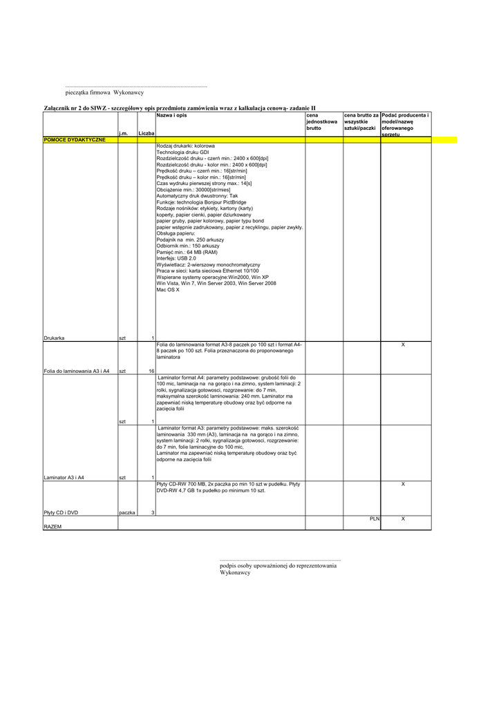 ...................................................................................................... pieczątka firmowa Wykonawcy Załącznik nr 2 do SIWZ - szczegółowy opis przedmiotu zamówienia wraz z kalkulacja cenową- zadanie II Nazwa i opis j.m. cena jednostkowa brutto Liczba cena brutto za Podać producenta i wszystkie model/nazwę sztuki/paczki oferowanego sprzętu POMOCE DYDAKTYCZNE Rodzaj drukarki: kolorowa Technologia druku GDI Rozdzielczość druku - czerń min.: 2400 x 600[dpi] Rozdzielczość druku - kolor min.: 2400 x 600[dpi] Prędkość druku – czerń min.: 16[str/min] Prędkość druku – kolor min.: 16[str/min] Czas wydruku pierwszej strony max.: 14[s] Obciążenie min.: 30000[str/mies] Automatyczny druk dwustronny: Tak Funkcje: technologia Bonjour PictBridge Rodzaje nośników: etykiety, kartony (karty) koperty, papier cienki, papier dziurkowany papier gruby, papier kolorowy, papier typu bond papier wstępnie zadrukowany, papier z recyklingu, papier zwykły. Obsługa papieru: Podajnik na min. 250 arkuszy Odbiornik min.: 150 arkuszy Pamięć min.: 64 MB (RAM) Interfejs: USB 2.0 Wyświetlacz: 2-wierszowy monochromatyczny Praca w sieci: karta sieciowa Ethernet 10/100 Wspierane systemy operacyjne:Win2000, Win XP Win Vista, Win 7, Win Server 2003, Win Server 2008 Mac OS X Drukarka szt 1 Folia do laminowania format A3-8 paczek po 100 szt i format A48 paczek po 100 szt. Folia przeznaczona do proponowanego laminatora Folia do laminowania A3 i A4 szt X 16 Laminator format A4: parametry podstawowe: grubość folii do 100 mic, laminacja na na gorąco i na zimno, system laminacji: 2 rolki, sygnalizacja gotowosci, rozgrzewanie: do 7 min, maksymalna szerokość laminowania: 240 mm. Laminator ma zapewniać niską temperaturę obudowy oraz być odporne na zacięcia folii szt 1 Laminator format A3: parametry podstawowe: maks. szerokość laminowania 330 mm (A3), laminacja na na gorąco i na zimno, system laminacji: 2 rolki, sygnalizacja gotowosci, rozgrzewanie: do 7 min, folie laminacyjne do 100 mic, Laminator ma zapewniać niską temperaturę obudowy oraz być odporne na zacięcia folii Laminator A3 i A4 szt 1 Płyty CD-RW 700 MB, 2x paczka po min 10 szt w pudełku. Płyty DVD-RW 4,7 GB 1x pudełko po minimum 10 szt. Płyty CD i DVD paczka X 3 PLN RAZEM ....................................................................................... podpis osoby upoważnionej do reprezentowania Wykonawcy X