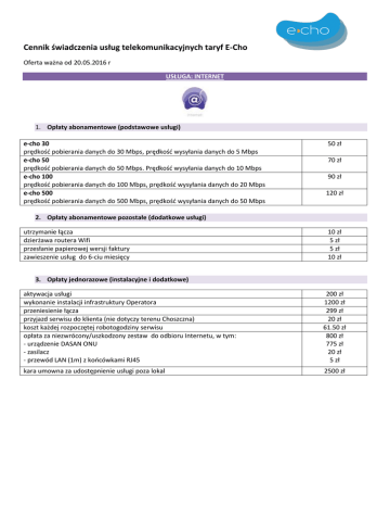 Cennik świadczenia usług telekomunikacyjnych taryf E-Cho Oferta ważna od 20.05.2016 r USŁUGA: INTERNET 1. Opłaty abonamentowe (podstawowe usługi) e-cho 30 prędkość pobierania danych do 30 Mbps, prędkość wysyłania danych do 5 Mbps e-cho 50 prędkość pobierania danych do 50 Mbps. Prędkość wysyłania danych do 10 Mbps e-cho 100 prędkość pobierania danych do 100 Mbps, prędkość wysyłania danych do 20 Mbps e-cho 500 prędkość pobierania danych do 500 Mbps, prędkość wysyłania danych do 50 Mbps 50 zł 70 zł 90 zł 120 zł 2. Opłaty abonamentowe pozostałe (dodatkowe usługi) utrzymanie łącza dzierżawa routera Wifi przesłanie papierowej wersji faktury zawieszenie usług do 6-ciu miesięcy 10 zł 5 zł 5 zł 10 zł 3. Opłaty jednorazowe (instalacyjne i dodatkowe) aktywacja usługi wykonanie instalacji infrastruktury Operatora przeniesienie łącza przyjazd serwisu do klienta (nie dotyczy terenu Choszczna) koszt każdej rozpoczętej robotogodziny serwisu opłata za niezwrócony/uszkodzony zestaw do odbioru Internetu, w tym: - urządzenie DASAN ONU - zasilacz - przewód LAN (1m) z końcówkami RJ45 200 zł 1200 zł 299 zł 20 zł 61.50 zł 800 zł 775 zł 20 zł 5 zł kara umowna za udostępnienie usługi poza lokal 2500 zł USŁUGA: TELEWIZJA 1. Opłaty abonamentowe (podstawowe usługi) pakiet mini HD pakiet mały HD pakiet duży HD pakiet mega HD Pakiet mega+HD 49 zł 85 zł 115 zł 149 zł 209 zł 2. Opłaty abonamentowe pozostałe (dodatkowe usługi) utrzymanie łącza dzierżawa dekodera HD+PVR dzierżawa dekodera multiroom w pakiecie: mini HD w pozostałych pakietach przesłanie papierowej wersji faktury zawieszenie usług do 6-ciu miesięcy - opłata podstawowa/utrzymanie łącza - opłata za dekoder HD + PVR - opłata za multiroom pakiety premium: FilmBox Canal+6 Canal+8 Republika TV zwiększenie czasu nagrywania (50 godzin) zwiększenie czasu przechowywania nagrań (6 miesięcy) 10 zł 10 zł 20 zł 10 zł 5 zł 10 zł 10 zł 10 zł 9.90 zł 44.90 zł 49.90 zł 5 zł 5 zł 5 zł 3. Opłaty jednorazowe (instalacyjne i dodatkowe) aktywacja usługi aktywacja multiroom przy zawarciu nowej umowy: w pakiecie: mini HD, mały HD w pakiecie: duży HD, mega HD, mega + HD aktywacja multiroom w trakcie obowiązującej umowy wykonanie instalacji infrastruktury Operatora przeniesienie łącza przyjazd serwisu do klienta (nie dotyczy terenu Choszczna) koszt każdej rozpoczętej robotogodziny serwisu opłata za niezwrócony/uszkodzony zestaw do odbioru telewizji, w tym: - urządzenie STB (dekoder) - zasilacz - przewód LAN (2m) z końcówkami RJ45 - przewód HDMI - pilot - urządzenie DASAN ONU - zasilacz - przewód LAN (1m) z końcówkami RJ45 kara umowna za udostępnienie usługi poza lokal 200 zł 90 zł 50 zł 150 zł 1200 zł 299 zł 20 zł 61,50 zł 1245 zł 357 zł 20 zł 8 zł 15 zł 45 zł 775 zł 20 zł 5 zł 2500 zł USŁUGA: TELEFON 1. Opłaty abonamentowe (podstawowe usługi) tele-cho 0 bez minut w abonamencie, 0,20 zł/minutę poza abonamentem tele-cho 100 100 minut w abonamencie, 0,15 zł/minutę poza abonamentem tele-cho 300 300 minut w abonamencie, 0,15 zł/minutę poza abonamentem no limit rozmowy bez limitu 20 zł 30 zł 40 zł 70 zł a. Nielimitowane rozmowy wewnątrz sieci b. Pakiet minut do wykorzystania na krajowe numery komórkowe oraz numery stacjonarne w Polsce i w Świecie c. Stawka za każdą rozpoczęta minutę połączenia na telefony stacjonarne do wybranych krajów Europejskich: Austria, Cypr, Czechy, Dania, Estonia, Francja, Grecja, Hiszpania, Islandia, Irlandia, Kanada, Litwa, Łotwa, Luxemburg, Holandia, Niemcy, Norwegia, Portugalia, Rumunia, Rosja, Słowacja, Słowenia, Stany Zjednoczone, Szwecja, Szwajcaria, Włochy, Wielka Brytania. d. Za krajowe połączenia telefoniczne komórkowe i stacjonarne z wyłączeniem numerów specjalnych, do 60 sekund naliczana jest opłata równa stawce minutowej, za każdą kolejną sekundę połączenia naliczana jest opłata w wysokości 1/60 stawki minutowej 2. Opłaty abonamentowe pozostałe (dodatkowe usługi) utrzymanie łącza przesłanie papierowej wersji faktury zawieszenie usług do 6-ciu miesięcy 10 zł 5 zł 10 zł 3. Opłaty jednorazowe (instalacyjne i dodatkowe) aktywacja usługi wykonanie instalacji infrastruktury Operatora przeniesienie łącza przyjazd serwisu do klienta (nie dotyczy terenu Choszczna) koszt każdej rozpoczętej robotogodziny serwisu przeniesienie numeru opłata za niezwrócony/uszkodzony zestaw do korzystania z telefonu - urządzenie DASAN ONU - zasilacz - przewód LAN (1m) z końcówkami RJ45 199 zł 1200 zł 299 zł 20 zł 61.50 zł 0 zł 800 zł 775 zł 20 zł 5 zł