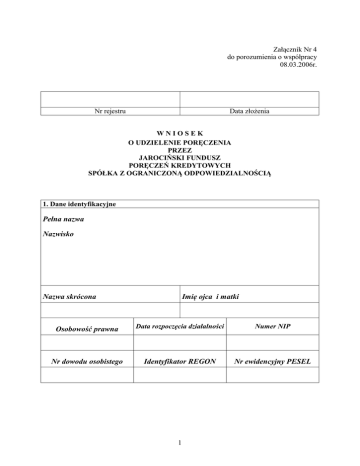 Załącznik Nr 4 do porozumienia o współpracy 08.03.2006r. Nr rejestru Data złożenia WNIOSEK O UDZIELENIE PORĘCZENIA PRZEZ JAROCIŃSKI FUNDUSZ PORĘCZEŃ KREDYTOWYCH SPÓŁKA Z OGRANICZONĄ ODPOWIEDZIALNOŚCIĄ 1. Dane identyfikacyjne Pełna nazwa Nazwisko Nazwa skrócona Imię ojca i matki Osobowość prawna Data rozpoczęcia działalności Numer NIP Nr dowodu osobistego Identyfikator REGON Nr ewidencyjny PESEL 1 2.Adres siedziby Ulica Nr domu Nr lokalu Miejscowość Kod pocztowy Poczta Skrytka pocztowa Telefon Fax 3.Organ rejestrowy Nazwa organu rejestrowego Data rejestracji Nazwa rejestru Numer w rejestrze 4.Proszę o udzielenie poręczenia w wysokości : ................................ zł słownie: ............................................................................................................ co stanowi ............. % kwoty dotacji, trwającego w okresie od .................... r. do ..................... r. Przeznaczenie dotacji: Motywacja wystąpienia o poręczenie: 2 Opis projektowanego przedsięwzięcia: 5.Środki rzeczowe niezbędne do uruchomienia projektowanego przedsięwzięcia. Własne Wyszczególnienie Wymagające zakupu Wymagające dzierżawy RAZEM 6. Przewidywane koszty całkowite uruchomienia przedsięwzięcia wyniosą: Koszty te zostaną pokryte z następujących źródeł Środki własne ogółem: z tego – gotówką inne (wyszczególnić) zł zł zł zł a) zł b) zł c) zł 3 kredyty bankowe i pożyczki ogółem: z tego - kredyty krótkoterminowe kredyty długoterminowe zł zł zł Pożyczki Podać źródła uzyskania kredytów, pożyczek oraz ich wysokość: 1. 2. 3. 4. 5. zł zł zł zł zł Środki te będą wykorzystane na sfinansowanie: 1. 2. 3. 4. 5. zł zł zł zł zł zł Razem Przewidywane wyniki projektowanego przedsięwzięcia wyszczególnienie przychody koszty zysk brutto Pierwszy rok Drugi rok Trzeci rok Czwarty rok Piąty rok Razem 4 zysk netto liczba zatrudnionych Przewidywana struktura zatrudnienia w okresie trwania poręczenia 7. Oświadczam, że wyrażam zgodę na przetwarzanie moich danych osobowych zgodnie z ustawą z dnia 29 sierpnia 1997 r. o ochronie danych osobowych (Dz. U. z 2002r. Nr 101, poz. 926 z póz. zm.) oraz przeprowadzenie wizyt i badań ankietowych przez Jarociński Fundusz Poręczeń Kredytowych lub osobę wskazaną przez JFPK Sp. z o.o. Miejscowość, data Podpis wnioskodawcy Załączniki: 1) umowa przyznająca dotacje lub promesa udzielenia dotacji 2) dokumenty składane w związku z ubieganiem się o dotację 8.Uwagi i dane dodatkowe 5 Załącznik Nr 2 do porozumienia o współpracy 08.03.2006r. ........................................................ ........................................................ ........................................................ ........................................................ (Nazwa i adres Wnioskodawcy) OŚWIADCZENIE Niniejszym wyrażam zgodę na wzajemne przekazywanie przez Urząd Pracy i Jarociński Fundusz Poręczeń Kredytowych Sp. z o.o. informacji o mojej sytuacji prawnej i ekonomiczno – finansowej oraz wszelkiej dokumentacji potrzebnej do uzyskania dotacji z Funduszu Pracy. ............................................. (Wnioskodawca)* * w przypadku osób fizycznych podpis współmałżonka 6