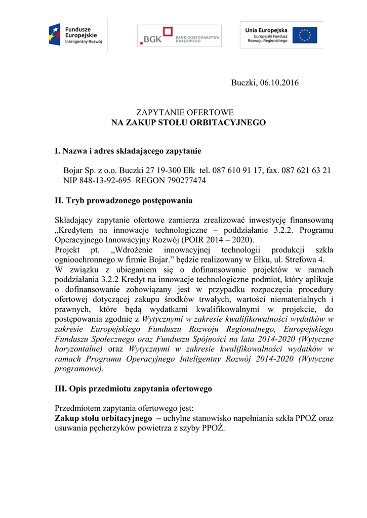 Buczki, 06.10.2016 ZAPYTANIE OFERTOWE NA ZAKUP STOŁU ORBITACYJNEGO I. Nazwa i adres składającego zapytanie Bojar Sp. z o.o. Buczki 27 19-300 Ełk tel. 087 610 91 17, fax. 087 621 63 21 NIP 848-13-92-695 REGON 790277474 II. Tryb prowadzonego postępowania Składający zapytanie ofertowe zamierza zrealizować inwestycję finansowaną „Kredytem na innowacje technologiczne – poddziałanie 3.2.2. Programu Operacyjnego Innowacyjny Rozwój (POIR 2014 – 2020). Projekt pt. „Wdrożenie innowacyjnej technologii produkcji szkła ognioochronnego w firmie Bojar.” będzie realizowany w Ełku, ul. Strefowa 4. W związku z ubieganiem się o dofinansowanie projektów w ramach poddziałania 3.2.2 Kredyt na innowacje technologiczne podmiot, który aplikuje o dofinansowanie zobowiązany jest w przypadku rozpoczęcia procedury ofertowej dotyczącej zakupu środków trwałych, wartości niematerialnych i prawnych, które będą wydatkami kwalifikowalnymi w projekcie, do postępowania zgodnie z Wytycznymi w zakresie kwalifikowalności wydatków w zakresie Europejskiego Funduszu Rozwoju Regionalnego, Europejskiego Funduszu Społecznego oraz Funduszu Spójności na lata 2014-2020 (Wytyczne horyzontalne) oraz Wytycznymi w zakresie kwalifikowalności wydatków w ramach Programu Operacyjnego Inteligentny Rozwój 2014-2020 (Wytyczne programowe). III. Opis przedmiotu zapytania ofertowego Przedmiotem zapytania ofertowego jest: Zakup stołu orbitacyjnego – uchylne stanowisko napełniania szkła PPOŻ oraz usuwania pęcherzyków powietrza z szyby PPOŻ. IV. Specyfikacja przedmiotu zamówienia Urządzenie powinno posiadać następujące parametry: - wymiar blatu roboczego 3200x2200 - blat uchylny, podświetlany do napełniania żelu - kąt pochylenia 0-45 ° - kąp odchylenia w pozycji poprzecznej 0-5 ° do usuwania bąbelków żelu - składany zderzak boczny V. Termin realizacji Termin realizacji przedmiotu niniejszego zapytania ofertowego do dnia 18.11.2016. VI. Opis warunków udziału w postępowaniu O udzielenie zamówienia mogą ubiegać się oferenci, którzy spełniają następujące warunki; - są uprawnieni do wykonywania określonej działalności - posiadają niezbędną wiedzę i doświadczenie w zakresie planowanej inwestycji - dysponują potencjałem technicznym i osobami zdolnymi do wykonania zamówienia - znajdują się w sytuacji ekonomicznej i finansowej gwarantującej prawidłowe i terminowe wykonanie zamówienia Zamawiający odrzuci ofertę w przypadku gdy: - jej treść nie odpowiada treści warunków zapytania, a w szczególności nie spełnia wszystkich wymogów przedmiotu zamówienia - jej złożenie stanowi czyn nieuczciwej konkurencji w rozumieniu przepisów o zwalczaniu nieuczciwej konkurencji - zawiera rażąco niskie ceny w stosunku do przedmiotu zamówienia - zawiera błędy w obliczeniu ceny O udzielenie zamówienia nie mogą ubiegać się oferenci powiązani kapitałowo lub osobowo z Zamawiającym. Przez powiązania kapitałowe lub osobowe rozumie się wzajemne powiązania między Zamawiającym lub osobami upoważnionymi do zaciągania zobowiązań w imieniu Zamawiającego lub osobami wykonującymi w imieniu Zamawiającego czynności związane z przygotowaniem i przeprowadzeniem procedury wyboru wykonawcy a wykonawcą, polegające w szczególności na: - uczestniczeniu w spółce jako wspólnik spółki cywilnej lub spółki osobowej, - posiadaniu co najmniej 10 % udziałów lub akcji, - pełnieniu funkcji członka organu nadzorczego lub zarządzającego, prokurenta, pełnomocnika, - pozostawaniu w związku małżeńskim, w stosunku pokrewieństwa lub powinowactwa w linii prostej, pokrewieństwa drugiego stopnia lub powinowactwa drugiego stopnia w linii bocznej lub w stosunku przysposobienia, opieki lub kurateli. VII. Opis sposobu obliczenia ceny - Oferent poda cenę netto w PLN lub EURO - stawka podatku VAT jest określana zgodnie z przepisami obowiązującymi na dzień złożenia oferty - podana cena musi uwzględniać wszystkie wymagania niniejszego zapytania ofertowego oraz obejmować koszty związane z przygotowaniem i realizacją przedmiotu zamówienia, w tym koszty montażu i przeszkolenia pracowników. - wszelkie koszty związane z przygotowaniem oferty pokrywa oferent VIII. Opis kryteriów wyboru ofert Przy wyborze najkorzystniejszej oferty, składający zapytanie będzie kierować się następującymi kryteriami i ich znaczeniem oraz w następujący sposób będzie oceniać oferty w poszczególnych kategoriach: Lp. 1. 2. 3. Kryterium Cena oferty Okres gwarancji Termin płatności Waga (%) 80 10 10 Max.liczba punktów(pkt.) 80 10 10 1. Kryterium „Cena oferty”- zostanie obliczone wg następującego wzoru: Cena min Wcena = ------------------------- *waga*100pkt. Cena badana gdzie: Wcena - oznacza liczbę punktów uzyskanych w kategorii Cena min – oznacza minimalną kwotę zaoferowaną wśród ofert podlegających ocenie Cena badana – oznacza kwotę zaoferowaną w ofercie podlegającej ocenie Waga- oznacza wagę kryterium wyrażoną w procentach 2. Kryterium „Okres gwarancji”- zostanie obliczone wg następującego wzoru: Okres gwarancji badanej oferty WGwarancja = -------------------------------------------------------- *waga*100pkt. Okres gwarancji max gdzie: Wgwarancja- oznacza liczbę punktów uzyskanych w kategorii Okres gwarancji badanej oferty– oznacza okres gwarancji zaoferowany w ofercie podlegającej ocenie Okres gwarancji max– oznacza maksymalny okres gwarancji zaoferowany wśród ofert podlegających ocenie Waga- oznacza wagę kryterium wyrażoną w procentach 3. Kryterium „ termin płatności”- zostanie obliczone wg następującego wzoru: Termin płatności badanej oferty W termin płatności = -------------------------------------------------------- *waga*100pkt. Termin płatności max gdzie: Wtermin płatności- oznacza liczbę punktów uzyskanych w kategorii Termin płatności badanej oferty– oznacza termin płatności zaoferowany w 