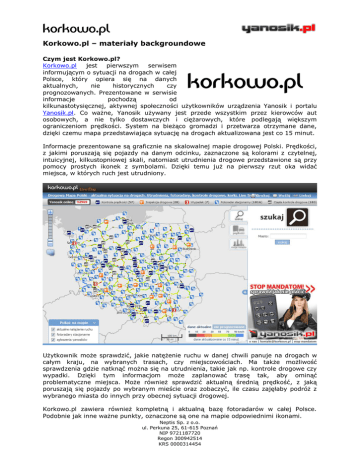 Korkowo.pl – materiały backgroundowe Czym jest Korkowo.pl? Korkowo.pl jest pierwszym serwisem informującym o sytuacji na drogach w całej Polsce, który opiera się na danych aktualnych, nie historycznych czy prognozowanych. Prezentowane w serwisie informacje pochodzą od kilkunastotysięcznej, aktywnej społeczności użytkowników urządzenia Yanosik i portalu Yanosik.pl. Co ważne, Yanosik używany jest przede wszystkim przez kierowców aut osobowych, a nie tylko dostawczych i ciężarowych, które podlegają większym ograniczeniom prędkości. System na bieżąco gromadzi i przetwarza otrzymane dane, dzięki czemu mapa przedstawiająca sytuację na drogach aktualizowana jest co 15 minut. Informacje prezentowane są graficznie na skalowalnej mapie drogowej Polski. Prędkości, z jakimi poruszają się pojazdy na danym odcinku, zaznaczone są kolorami z czytelnej, intuicyjnej, kilkustopniowej skali, natomiast utrudnienia drogowe przedstawione są przy pomocy prostych ikonek z symbolami. Dzięki temu już na pierwszy rzut oka widać miejsca, w których ruch jest utrudniony. Użytkownik może sprawdzić, jakie natężenie ruchu w danej chwili panuje na drogach w całym kraju, na wybranych trasach, czy miejscowościach. Ma także możliwość sprawdzenia gdzie natknąć można się na utrudnienia, takie jak np. kontrole drogowe czy wypadki. Dzięki tym informacjom może zaplanować trasę tak, aby ominąć problematyczne miejsca. Może również sprawdzić aktualną średnią prędkość, z jaką poruszają się pojazdy po wybranym mieście oraz zobaczyć, ile czasu zajęłaby podróż z wybranego miasta do innych przy obecnej sytuacji drogowej. Korkowo.pl zawiera również kompletną i aktualną bazę fotoradarów w całej Polsce. Podobnie jak inne ważne punkty, oznaczone są one na mapie odpowiednimi ikonami. Neptis Sp. z o.o. ul. Perkuna 25, 61-615 Poznań NIP 9721187720 Regon 300942514 KRS 0000314454 Korkowo.pl w wersji mobilnej Serwis Korkowo.pl dostępny jest także w wersji mobilnej na telefony komórkowe i smartfony pod adresem m.korkowo.pl. Po wpisaniu w przeglądarce adresu m.korkowo.pl Użytkownik w zależności od mozliwości technicznych swojego telefonu wybiera z jakiej mapy chce skorzystać: dynamicznej czy statycznej. Po przejściu do aplikacji mapowej może skorzystać z wyszukiwarki - podając miasto (dodatkowo może także ulicę) na ekranie telefonu wyświetli się mapa prezentująca aktualną sytuację w danej lokalizacji. Urządzenie Yanosik, wersje mobilne i portal Yanosik.pl – materiały backgroundowe Czym jest Yanosik? Yanosik to interaktywny komunikator dla kierowców, który łączy w sobie potencjał CB radia i urządzeń GPS (nawigacji, lokalizatorów fotoradarów itp.). Dostępny jest zarówno w wersji standardowej, jako urządzenie montowane w samochodzie, jak i w wersjach mobilnych dla posiadaczy iPhone’ów oraz telefonów z Androidem. Kierowca, który używa Yanosika podczas jazdy nie tylko otrzymuje ostrzeżenia o zbliżaniu się do miejsc, w których zlokalizowany jest np. fotoradar, kontrole prędkości, patrole mobilne, czy wypadki. Yanosik umożliwia także użytkownikowi ostrzeganie o niebezpieczeństwach innych kierowców. Dzięki zgłoszeniom baza jest on-line aktualizowana. Neptis Sp. z o.o. ul. Perkuna 25, 61-615 Poznań NIP 9721187720 Regon 300942514 KRS 0000314454 Yanosik wyróżnia się prostotą instalacji i obsługi, dzięki czemu może z niego korzystać każdy kierowca, a wszelkie aktualizacje odbywają się automatycznie i nie wymagają żadnych działań ze strony użytkownika. Co ważne, korzystanie z Yanosika nie wiąże się z żadnymi zobowiązaniami. Użytkownik nie podpisuje umowy abonamentowej, dzięki czemu nie ma obowiązku płacenia żadnej stałej opłaty. Dzięki urządzeniu Yanosik: Otrzymujemy ostrzeżenia o: - Fotoradarach - Kontrolami prędkości - Patrolami policji - Wypadkami - Kontrolami inspekcji drogowej (ITD) Wpływamy na poprawę bezpieczeństwa na drogach zgłaszając zauważone problemy (np. wypadki drogowe). Wymieniamy się informacjami z innymi kierowcami. Jakie korzyści daje Yanosik? Błyskawicznie dowiadujemy się o sytuacji na drogach. Możemy szybko reagować unikając wielu drogowych problemów. Pomagamy innym uniknąć niebezpieczeństw. Jak to działa? Obsługa urządzenia jest bardzo prosta. Wystarczy podłączyć urządzenie do gniazda zasilania (zapalniczki) i od tej chwili jest gotowe do pracy. Od tego momentu otrzymujemy wszystkie komunikaty o sytuacji na drogach. Widząc zagrożenie drogowe, możemy je zgłosić wybierając 1 z 6 ikon (*) na urządzeniu. Przykładowo: Fotoradar Wypadek Inspekcja System automatycznie zinterpretuje zdarzenie i powiadomi o nim pozostałych kierowców w tym rejonie. Tutaj można sprawdzić jak działa Yanosik. * Przycisk „korek” zmienił swoją funkcję. Aktualnie po jego wciśnięciu użytkownik informowany jest o czasach przejazdu oraz średniej prędkości w mieście. Neptis Sp. z o.o. ul. Perkuna 25, 61-615 Poznań NIP 9721187720 Regon 300942514 KRS 0000314454 Yanosik – wersje mobilne Yanosik dostępny jest również całkowicie za darmo w formie aplikacji mobilnej na iPhone’y oraz telefony z systemem Android. Po uruchomieniu aplikacji użytkownik może zarówno zgłaszać zdarzenia drogowe, klikając w odpowiednią ikonkę, jak i otrzymywać ostrzeżenia zbliżając się do nich. Dodatkowo obie wersje zostały zintegrowane z sersiem Korkowo.pl – pod ikoną mapy kierowca może sprawdzić aktualną sytuację drogową – natężenie ruchu na drogach, aktualne kontrole, korki, wypadki i inne utrudnienia. Android Darmowa wersja na telefony z systemem Android dostępna jest w Android Market. Neptis Sp. z o.o. ul. Perkuna 25, 61-615 Poznań NIP 9721187720 Regon 300942514 KRS 0000314454 iPhone Darmową aplikację działającą na iPhone’ie można pobrać z App Store. Neptis Sp. z o.o. ul. Perkuna 25, 61-615 Poznań NIP 9721187720 Regon 300942514 KR