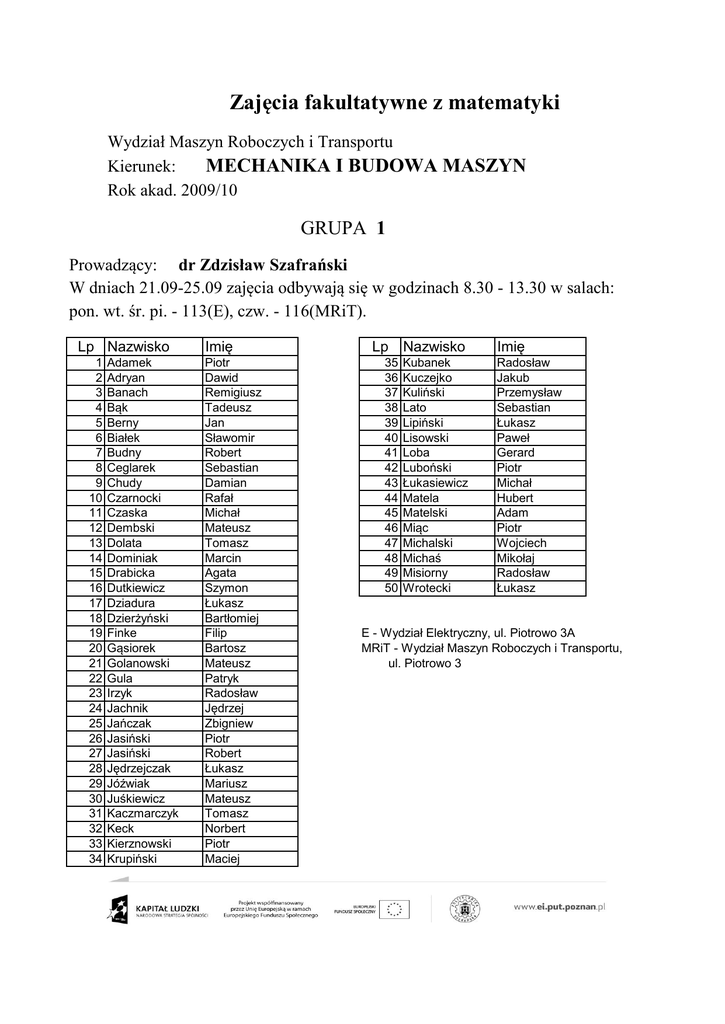 Zajęcia fakultatywne z matematyki Wydział Maszyn Roboczych i Transportu Kierunek: MECHANIKA I BUDOWA MASZYN Rok akad. 2009/10 GRUPA 1 Prowadzący: dr Zdzisław Szafrański W dniach 21.09-25.09 zajęcia odbywają się w godzinach 8.30 - 13.30 w salach: pon. wt. śr. pi. - 113(E), czw. - 116(MRiT). Lp Nazwisko 1 2 3 4 5 6 7 8 9 10 11 12 13 14 15 16 17 18 19 20 21 22 23 24 25 26 27 28 29 30 31 32 33 34 Adamek Adryan Banach Bąk Berny Białek Budny Ceglarek Chudy Czarnocki Czaska Dembski Dolata Dominiak Drabicka Dutkiewicz Dziadura Dzierżyński Finke Gąsiorek Golanowski Gula Irzyk Jachnik Jańczak Jasiński Jasiński Jędrzejczak Jóźwiak Juśkiewicz Kaczmarczyk Keck Kierznowski Krupiński Imię Piotr Dawid Remigiusz Tadeusz Jan Sławomir Robert Sebastian Damian Rafał Michał Mateusz Tomasz Marcin Agata Szymon Łukasz Bartłomiej Filip Bartosz Mateusz Patryk Radosław Jędrzej Zbigniew Piotr Robert Łukasz Mariusz Mateusz Tomasz Norbert Piotr Maciej Lp 35 36 37 38 39 40 41 42 43 44 45 46 47 48 49 50 Nazwisko Imię Kubanek Kuczejko Kuliński Lato Lipiński Lisowski Loba Luboński Łukasiewicz Matela Matelski Miąc Michalski Michaś Misiorny Wrotecki Radosław Jakub Przemysław Sebastian Łukasz Paweł Gerard Piotr Michał Hubert Adam Piotr Wojciech Mikołaj Radosław Łukasz E - Wydział Elektryczny, ul. Piotrowo 3A MRiT - Wydział Maszyn Roboczych i Transportu, ul. Piotrowo 3