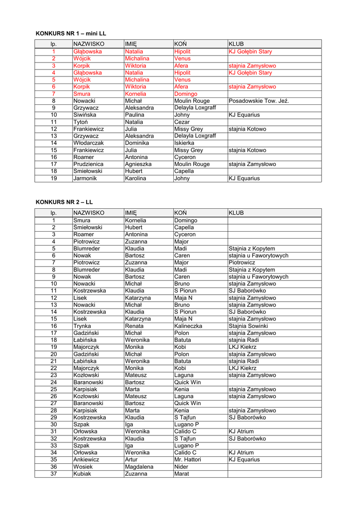 KONKURS NR 1 – mini LL lp. 1 2 3 4 5 6 7 8 9 10 11 12 13 14 15 16 17 18 19 NAZWISKO Głąbowska Wójcik Korpik Głąbowska Wójcik Korpik Smura Nowacki Grzywacz Siwińska Tytoń Frankiewicz Grzywacz Włodarczak Frankiewicz Roamer Prudzienica Śmiełowski Jarmonik IMIĘ Natalia Michalina Wiktoria Natalia Michalina Wiktoria Kornelia Michał Aleksandra Paulina Natalia Julia Aleksandra Dominika Julia Antonina Agnieszka Hubert Karolina KOŃ Hipolit Venus Afera Hipolit Venus Afera Domingo Moulin Rouge Delayla Loxgraff Johny Cezar Missy Grey Delayla Loxgraff Iskierka Missy Grey Cyceron Moulin Rouge Capella Johny KLUB KJ Gołębin Stary IMIĘ Kornelia Hubert Antonina Zuzanna Klaudia Bartosz Zuzanna Klaudia Bartosz Michał Klaudia Katarzyna Michał Klaudia Katarzyna Renata Michał Weronika Monika Michał Weronika Monika Mateusz Bartosz Marta Mateusz Bartosz Marta Klaudia Iga Weronika Klaudia Iga Weronika Artur Magdalena Zuzanna KOŃ Domingo Capella Cyceron Major Madi Caren Major Madi Caren Bruno S Piorun Maja N Bruno S Piorun Maja N Kalineczka Polon Batuta Kobi Polon Batuta Kobi Laguna Quick Win Kenia Laguna Quick Win Kenia S Tajfun Lugano P Calido C S Tajfun Lugano P Calido C Mr. Hattori Nider Marat KLUB stajnia Zamysłowo KJ Gołębin Stary stajnia Zamysłowo Posadowskie Tow. Jeź. KJ Equarius stajnia Kotowo stajnia Kotowo stajnia Zamysłowo KJ Equarius KONKURS NR 2 – LL lp. 1 2 3 4 5 6 7 8 9 10 11 12 13 14 15 16 17 18 19 20 21 22 23 24 25 26 27 28 29 30 31 32 33 34 35 36 37 NAZWISKO Smura Śmiełowski Roamer Piotrowicz Blumreder Nowak Piotrowicz Blumreder Nowak Nowacki Kostrzewska Lisek Nowacki Kostrzewska Lisek Trynka Gadziński Łabińska Majorczyk Gadziński Łabińska Majorczyk Kozłowski Baranowski Karpisiak Kozłowski Baranowski Karpisiak Kostrzewska Szpak Orłowska Kostrzewska Szpak Orłowska Ankiewicz Wosiek Kubiak Stajnia z Kopytem stajnia u Faworytowych Piotrowicz Stajnia z Kopytem stajnia u Faworytowych stajnia Zamysłowo SJ Baborówko stajnia Zamysłowo stajnia Zamysłowo SJ Baborówko stajnia Zamysłowo Stajnia Sowinki stajnia Zamysłowo stajnia Radi LKJ Kiekrz stajnia Zamysłowo stajnia Radi LKJ Kiekrz stajnia Zamysłowo stajnia Zamysłowo stajnia Zamysłowo stajnia Zamysłowo SJ Baborówko KJ Atrium SJ Baborówko KJ Atrium KJ Equarius 38 39 40 41 42 43 44 45 46 47 48 49 50 51 52 53 54 55 56 Ankiewicz Wosiek Kubiak Ziółek Starosta Murakowska Wrzosek Tauchert Chmielewska Jackowiak Tauchert Lebioda Włodarczak Ziółek Górka Sajdak Koziczak Prager Wesoły Artur Magdalena Zuzanna Henryk Ewa Alicja Matylda-Olga Oliwia Agata Olga Oliwia Maciej Dominika Henryk Monika Paweł Justyna Marta Marcin Mr. Hattori Nider Marat Girlfriend Bonanza Dania Wiliana Excalibur Christmas Boy G Formoza Excalibur Gardenia Huragan Artemida Calinka Roger Dżoli Jumper Armia Orchidea KJ Equarius IMIĘ Henryk Ewa Alicja Matylda-Olga Bartosz Katarzyna Oliwia Agata Katarzyna Olga Maciej Dominika Henryk Monika Paweł Justyna Marta Paweł Marcin Katarzyna Natalia Monika Katarzyna Natalia Monika Alicja Łukasz Henryk Maria Łukasz Mirosław Maria Katarzyna Mirosław Nikoletta Marcin Katarzyna Nikoletta Marcin KOŃ Girlfriend Bonanza Dania Wiliana Quick Win Karuso Excalibur Christmas Boy G Karuso Formoza Gardenia Huragan Artemida Calinka Roger Dżoli Jumper Armia Roger Orchidea Mrok Nadir Granat Mrok Nadir Granat Cezar Kreon Dunka Zaretino Kreon Hestia Zaretino Fantasy Hestia Pengo Calvados Fantasy Pengo Calvados KLUB Stajnia Cwał Zakrzewo Stajnia Cwał Zakrzewo KJ Cwał Poznań Stajnia Cwał Zakrzewo KJ Michałówka KJ Michałówka Ludowy KJ Kiekrz Posadowskie Tow. Jeź. KONKURS NR 3 – L lp. 1 2 3 4 5 6 7 8 9 10 11 12 13 14 15 16 17 18 19 20 21 22 23 24 25 26 27 28 29 30 31 32 33 34 35 36 37 38 39 NAZWISKO Ziółek Starosta Murakowska Wrzosek Baranowski DawidowskaTauchert Chmielewska DawidowskaJackowiak Lebioda Włodarczak Ziółek Górka Sajdak Koziczak Prager Sajdak Wesoły Wawrzyniak Haściło Tchorzewska Wawrzyniak Haściło Tchorzewska Murakowska Zasadziński Ziólek Goss Zasadziński Wójcik Goss DawidowskaWójcik Walkowiak Smura DawidowskaWalkowiak Smura KJ Cwał Poznań KS Idmar Krajkowo KS Idmar Krajkowo Stajnia Cwał Zakrzewo KJ Michałówka KJ Michałówka Ludowy KJ Kiekrz KJ Michałówka Posadowskie Tow. Jeź. Stajnia Zamysłowo Stajnia Zamysłowo Kopras sp. z o.o. Stajnia Cwał Zakrzewo Kopras sp. z o.o. Racocki Klub Jeździecki KS Idmar Krajkowo Racocki Klub Jeździecki bpk KS Idmar Krajkowo bpk