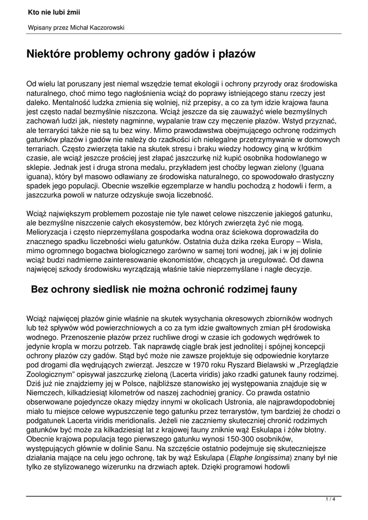 Kto nie lubi żmii Wpisany przez Michał Kaczorowski Niektóre problemy ochrony gadów i płazów Od wielu lat poruszany jest niemal wszędzie temat ekologii i ochrony przyrody oraz środowiska naturalnego, choć mimo tego nagłośnienia wciąż do poprawy istniejącego stanu rzeczy jest daleko. Mentalność ludzka zmienia się wolniej, niż przepisy, a co za tym idzie krajowa fauna jest często nadal bezmyślnie niszczona. Wciąż jeszcze da się zauważyć wiele bezmyślnych zachowań ludzi jak, niestety nagminne, wypalanie traw czy męczenie płazów. Wstyd przyznać, ale terraryści także nie są tu bez winy. Mimo prawodawstwa obejmującego ochronę rodzimych gatunków płazów i gadów nie należy do rzadkości ich nielegalne przetrzymywanie w domowych terrariach. Często zwierzęta takie na skutek stresu i braku wiedzy hodowcy giną w krótkim czasie, ale wciąż jeszcze prościej jest złapać jaszczurkę niż kupić osobnika hodowlanego w sklepie. Jednak jest i druga strona medalu, przykładem jest choćby legwan zielony (Iguana iguana), który był masowo odławiany ze środowiska naturalnego, co spowodowało drastyczny spadek jego populacji. Obecnie wszelkie egzemplarze w handlu pochodzą z hodowli i ferm, a jaszczurka powoli w naturze odzyskuje swoja liczebność. Wciąż największym problemem pozostaje nie tyle nawet celowe niszczenie jakiegoś gatunku, ale bezmyślne niszczenie całych ekosystemów, bez których zwierzęta żyć nie mogą. Melioryzacja i często nieprzemyślana gospodarka wodna oraz ściekowa doprowadziła do znacznego spadku liczebności wielu gatunków. Ostatnia duża dzika rzeka Europy – Wisła, mimo ogromnego bogactwa biologicznego zarówno w samej toni wodnej, jak i w jej dolinie wciąż budzi nadmierne zainteresowanie ekonomistów, chcących ja uregulować. Od dawna najwięcej szkody środowisku wyrządzają właśnie takie nieprzemyślane i nagłe decyzje. Bez ochrony siedlisk nie można ochronić rodzimej fauny Wciąż najwięcej płazów ginie właśnie na skutek wysychania okresowych zbiorników wodnych lub też spływów wód powierzchniowych a co za tym idzie gwałtownych zmian pH środowiska wodnego. Przenoszenie płazów przez ruchliwe drogi w czasie ich godowych wędrówek to jedynie kropla w morzu potrzeb. Tak naprawdę ciągle brak jest jednolitej i spójnej koncepcji ochrony płazów czy gadów. Stąd być może nie zawsze projektuje się odpowiednie korytarze pod drogami dla wędrujących zwierząt. Jeszcze w 1970 roku Ryszard Bielawski w „Przeglądzie Zoologicznym” opisywał jaszczurkę zieloną (Lacerta viridis) jako rzadki gatunek fauny rodzimej. Dziś już nie znajdziemy jej w Polsce, najbliższe stanowisko jej występowania znajduje się w Niemczech, kilkadziesiąt kilometrów od naszej zachodniej granicy. Co prawda ostatnio obserwowane pojedyncze okazy między innymi w okolicach Ustronia, ale najprawdopodobniej miało tu miejsce celowe wypuszczenie tego gatunku przez terrarystów, tym bardziej że chodzi o podgatunek Lacerta viridis meridionalis. Jeżeli nie zaczniemy skuteczniej chronić rodzimych gatunków być może za kilkadziesiąt lat z krajowej fauny zniknie wąż Eskulapa i żółw błotny. Obecnie krajowa populacja tego pierwszego gatunku wynosi 150-300 osobników, występujących głównie w dolinie Sanu. Na szczęście ostatnio podejmuje się skuteczniejsze działania mające na celu jego ochronę, tak by wąż Eskulapa (Elaphe longissima) znany był nie tylko ze stylizowanego wizerunku na drzwiach aptek. Dzięki programowi hodowli 1/4 Kto nie lubi żmii Wpisany przez Michał Kaczorowski realizowanemu między innymi przez Ogród Zoologiczny w Łodzi być może wzrośnie liczebność krajowej populacji gniewosza plamistego ( Coronella austriaca ), gatunku obecnie stosunkowo rzadkiego. Żółw błotny ( Emys orbicularis ) na terenie Polski wciąż rzadki i występujący relatywnie najliczniej na terenie Lubelszczyzny jest poważnie zagrożony przez gatunek obcy faunie rodzimej. Mowa o żółwiu czerwonolicym ( Trachemys (Chrysemys) scripta elegans ), który jeszcze do niedawna był masowo sprowadzany przez sklepy zoologiczne. Młody, ładny, zielony żółw szybko znajdował nabywców, niestety szybkie tempo wzrostu i zmiana koloru sprawiały, że wielu „pseudoterrarystów” pozbywało się pozornie nieatrakcyjnego już gada wyrzucając go po prostu do pobliskiego cieku wodnego. Jako gatunek odporny, niewymagający znalazł on dogodne warunki do życia, wypierając z siedlisk rodzimy gatunek. Ponadto stanowi ogromne zagrożenie dla istniejącej równowagi ekologicznej, zjada wszelkie niewielkie zwierzęta, czym znacznie zubaża ich liczebność. Żółw czerwonolicy stanowi obecnie problem w wielu krajów europejskich właśnie na skutek nieprzemyślanych działań akwarystów i terrarystów (więcej o żółwiu czerwonolicym i zagrożeniach z nim związanych na stronie: www.pst.org.pl). Podobnie dzieje się w przypadku sprowadzania nowych gatunków na masową skalę, tylko po to by rozwiązać istniejące problemy. Najbardziej znanym przykładem jest introdukcja największego gatunku ropuch, osiągającej do 2 kg wagi ropuchy agi (Bufo marinus) w Australii i kilku innych państw celem zmniejszenia liczebności szkodników upraw. Jako gatunek duży, obcy tamtejszej faunie szybko opanowała większą cześć kontynentu i zaczęła wypierać rodzime gatunki. Aga wyżerała mniejsze gatunki, co gorsze jest to gatunek silnie trujący, zarówno osobniki dorosłe, jak i skrzek oraz kijanki są silnie toksyczne. Krajowe zwierzęta nie znające takiego zagrożenia zaczęły masowo wymierać (od ryb przez płazy, gady, na ptactwie i ssakach skończywszy), spożywając trujący skrzek i kijanki. Odnotowano także śmiertelne zatrucia wśród zwierząt domowych, a także ludzi. Gatunek ten bywa hodowany w terrariach i nie można wykluczyć, że jakiś hodowca zechce pozbyć się skrzeku, wyrzucając go, a skutki nie są trud