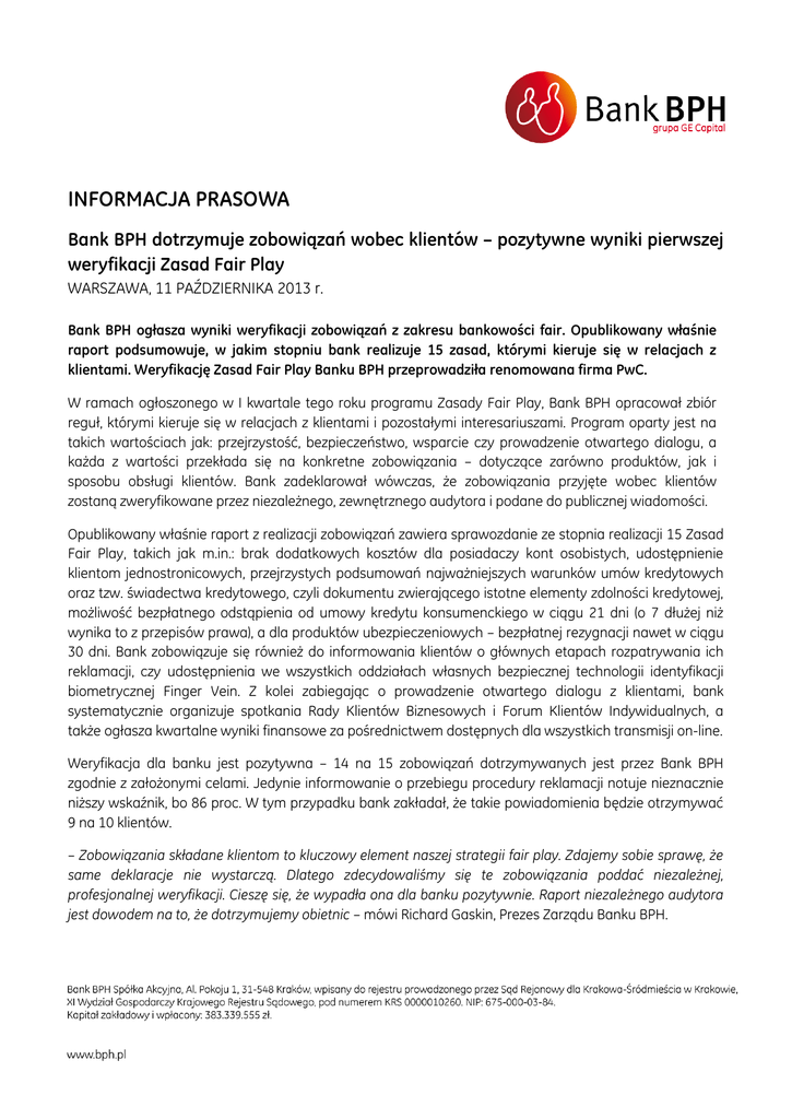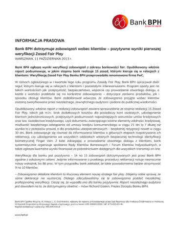 INFORMACJA PRASOWA Bank BPH dotrzymuje zobowiązań wobec klientów – pozytywne wyniki pierwszej weryfikacji Zasad Fair Play WARSZAWA, 11 PAŹDZIERNIKA 2013 r. Bank BPH ogłasza wyniki weryfikacji zobowiązań z zakresu bankowości fair. Opublikowany właśnie raport podsumowuje, w jakim stopniu bank realizuje 15 zasad, którymi kieruje się w relacjach z klientami. Weryfikację Zasad Fair Play Banku BPH przeprowadziła renomowana firma PwC. W ramach ogłoszonego w I kwartale tego roku programu Zasady Fair Play, Bank BPH opracował zbiór reguł, którymi kieruje się w relacjach z klientami i pozostałymi interesariuszami. Program oparty jest na takich wartościach jak: przejrzystość, bezpieczeństwo, wsparcie czy prowadzenie otwartego dialogu, a każda z wartości przekłada się na konkretne zobowiązania – dotyczące zarówno produktów, jak i sposobu obsługi klientów. Bank zadeklarował wówczas, że zobowiązania przyjęte wobec klientów zostaną zweryfikowane przez niezależnego, zewnętrznego audytora i podane do publicznej wiadomości. Opublikowany właśnie raport z realizacji zobowiązań zawiera sprawozdanie ze stopnia realizacji 15 Zasad Fair Play, takich jak m.in.: brak dodatkowych kosztów dla posiadaczy kont osobistych, udostępnienie klientom jednostronicowych, przejrzystych podsumowań najważniejszych warunków umów kredytowych oraz tzw. świadectwa kredytowego, czyli dokumentu zwierającego istotne elementy zdolności kredytowej, możliwość bezpłatnego odstąpienia od umowy kredytu konsumenckiego w ciągu 21 dni (o 7 dłużej niż wynika to z przepisów prawa), a dla produktów ubezpieczeniowych – bezpłatnej rezygnacji nawet w ciągu 30 dni. Bank zobowiązuje się również do informowania klientów o głównych etapach rozpatrywania ich reklamacji, czy udostępnienia we wszystkich oddziałach własnych bezpiecznej technologii identyfikacji biometrycznej Finger Vein. Z kolei zabiegając o prowadzenie otwartego dialogu z klientami, bank systematycznie organizuje spotkania Rady Klientów Biznesowych i Forum Klientów Indywidualnych, a także ogłasza kwartalne wyniki finansowe za pośrednictwem dostępnych dla wszystkich transmisji on-line. Weryfikacja dla banku jest pozytywna – 14 na 15 zobowiązań dotrzymywanych jest przez Bank BPH zgodnie z założonymi celami. Jedynie informowanie o przebiegu procedury reklamacji notuje nieznacznie niższy wskaźnik, bo 86 proc. W tym przypadku bank zakładał, że takie powiadomienia będzie otrzymywać 9 na 10 klientów. – Zobowiązania składane klientom to kluczowy element naszej strategii fair play. Zdajemy sobie sprawę, że same deklaracje nie wystarczą. Dlatego zdecydowaliśmy się te zobowiązania poddać niezależnej, profesjonalnej weryfikacji. Cieszę się, że wypadła ona dla banku pozytywnie. Raport niezależnego audytora jest dowodem na to, że dotrzymujemy obietnic – mówi Richard Gaskin, Prezes Zarządu Banku BPH. Wyniki realizacji założonych przez Bank BPH celów podlegały weryfikacji niezależnej firmy audytorskiej PwC. Weryfikacja została przeprowadzona zgodnie z Międzynarodowym Standardem Przeprowadzania Usług Atestacyjnych 3000, wydanym przez Międzynarodową Radę Standardów Rewizji Finansowej (IAASB) Międzynarodowej Federacji Księgowych (IFAC). – PwC zostało zaangażowane przez Bank BPH do przeprowadzenia weryfikacji poziomu wypełnienia Zasad Fair Play. W tym celu przeprowadziliśmy procedury niezbędne do zweryfikowania deklarowanego przez Bank BPH poziomu wypełnienia zasad, obejmujące między innymi przegląd istotnej dokumentacji, ocenę systemów i procesów oraz uzyskaliśmy wybrane na próbie dokumenty. Wnioski wyciągnięte po przeprowadzeniu procesu weryfikacji zostały umieszczone w raporcie z niezależnej usługi atestacyjnej – tłumaczy Andreas Bröcher, Partner w dziale audytu i doradztwa księgowego PwC. Opublikowany właśnie raport obejmuje wyniki realizacji zobowiązań za pierwsze półrocze bieżącego roku. Lista zobowiązań Banku BPH wobec klientów będzie rozwijana i na bieżąco uzupełniana o kolejne kwestie związane z bankowością fair. Podobnie jak pierwszych 15 zasad – cyklicznie będą one weryfikowane przez niezależnego audytora firmę PwC, a wyniki realizacji zobowiązań regularnie publikowane. Więcej o zobowiązaniach i Zasadach http://www.zasadyfairplay.bph.pl/ Fair Play Banku BPH na stronach internetowych: Raport z realizacji zobowiązań Banku BPH za I połowę 2013 r. wraz z raportem z niezależnej weryfikacji dostępny jest pod adresem: http://www.zasadyfairplay.bph.pl/raport2013/ *** Bank BPH oferuje swoje produkty i usługi Klientom indywidualnym, małym i średnim przedsiębiorstwom oraz Klientom korporacyjnym. Oferta Banku zawiera m.in.: kredyty, w tym gotówkowe i hipoteczne, konta osobiste, rachunki oszczędnościowe i lokaty oraz karty kredytowe. Klienci Banku mogą korzystać z sieci blisko 300 oddziałów własnych, a także placówek partnerskich i agencji uniwersalnych, jak również z bankowości internetowej oraz telefonicznej. Bank BPH jest obecny na polskim rynku od ponad 20 lat. Jest spółką publiczną notowaną na Giełdzie Papierów Wartościowych w Warszawie i wchodzi w skład indeksu Respect. Siedzibą prawną Banku BPH jest Kraków, biuro centrali znajduje się w Warszawie, a główne centra operacyjne w Gdańsku i Krakowie. Bank BPH wchodzi w skład grupy kapitałowej GE, jednej z największych korporacji na świecie.