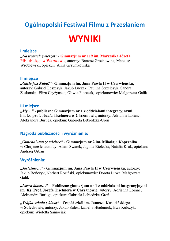 Ogólnopolski Festiwal Filmu z Przesłaniem WYNIKI I miejsce „Na tropach zwierząt” - Gimnazjum nr 119 im. Marszałka Józefa Piłsudskiego w Warszawie, autorzy: Bartosz Grochowina, Mateusz Wróblewski, opiekun: Anna Grzymkowska II miejsce „Gdzie jest Kuba?”- Gimnazjum im. Jana Pawła II w Czerwieńsku, autorzy: Gabriel Leszczyk, Jakub Łuczak, Paulina Strzelczyk, Sandra Zaskórska, Eliza Czyżyńska, Oliwia Florczak, opiekunowie: Małgorzata Galik III miejsce „My…” - publiczne Gimnazjum nr 1 z oddziałami integracyjnymi im. ks. prof. Józefa Tischnera w Chrzanowie, autorzy: Adrianna Loranc, Aleksandra Buruga, opiekun: Gabriela Lebiedzka-Groń Nagroda publiczności i wyróżnienie: „Gimcho2-nasze miejsce” - Gimnazjum nr 2 im. Mikołaja Kopernika w Chojnowie, autorzy: Adam Swatek, Jagoda Bielecka, Natalia Kruk, opiekun: Andrzej Urban Wyróżnienia: „Jesteśmy…” - Gimnazjum im. Jana Pawła II w Czerwieńsku, autorzy: Jakub Bończyk, Norbert Rosiński, opiekunowie: Dorota Litwa, Małgorzata Galik „Nasza klasa…” - Publiczne gimnazjum nr 1 z oddziałami integracyjnymi im. Ks. Prof. Józefa Tischnera w Chrzanowie, autorzy: Adrianna Loranc, Aleksandra Burliga, opiekun: Gabriela Lebiedzka-Groń „Trójka-szkoła z klasą” - Zespół szkół im. Janusza Kusocińskiego w Sulechowie, autorzy: Jakub Sulek, Izabella Hładuniuk, Ewa Kulczyk, opiekun: Wioletta Samociak „Opowieść gimbazjalna” - Gimnazjum im. Jana Pawła II w Czerwieńsku, autorzy: Piotr Conio, Paulina Lebioda, Karolina Rybak, Katarzyna Kaczmarek, Julia Kuśmierska, Sandra Hamera, Joanna Karnafel, opiekunowie: Joanna Stanaszek „Gimnazjum-nasze miejsce, nasz czas…” - Gimnazjum nr 119 im. Marszałka Józefa Piłsudskiego w Warszawie, Autor: Adam Sobieszek, opiekun: Małgorzata Sobieszek „Nakręceni” - Gimnazjum im. Jana Pawła II w Czerwieńsku, autorzy: Gabriel Leszczyk, Dominika Witczak, opiekunowie: Małgorzata Galik, Joanna Stanaszek Konkurs został zorganizowany przez Gimnazjum im. Jana Pawła II w Czerwieńsku - www.gimczer.aplus.pl Wyniki - www.facebook.com/FestiwalFilmuzPrzeslaniem/?fref=nf