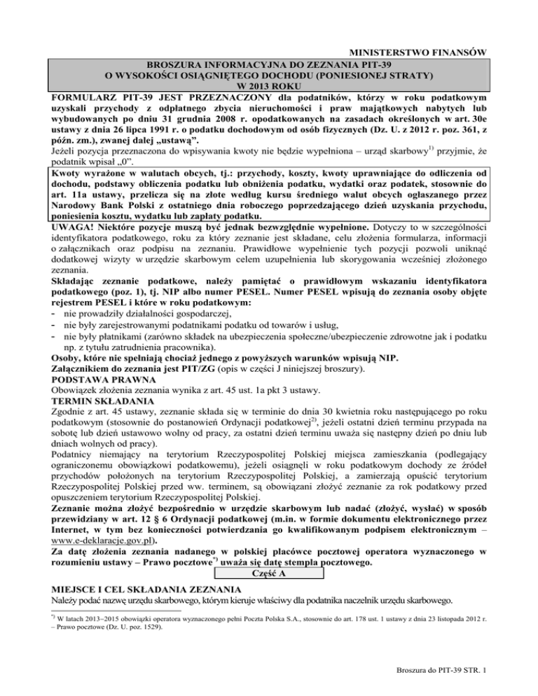 MINISTERSTWO FINANSÓW BROSZURA INFORMACYJNA DO ZEZNANIA PIT-39 O WYSOKOŚCI OSIĄGNIĘTEGO DOCHODU (PONIESIONEJ STRATY) W 2013 ROKU FORMULARZ PIT-39 JEST PRZEZNACZONY dla podatników, którzy w roku podatkowym uzyskali przychody z odpłatnego zbycia nieruchomości i praw majątkowych nabytych lub wybudowanych po dniu 31 grudnia 2008 r. opodatkowanych na zasadach określonych w art. 30e ustawy z dnia 26 lipca 1991 r. o podatku dochodowym od osób fizycznych (Dz. U. z 2012 r. poz. 361, z późn. zm.), zwanej dalej „ustawą”. JeŜeli pozycja przeznaczona do wpisywania kwoty nie będzie wypełniona – urząd skarbowy1) przyjmie, Ŝe podatnik wpisał „0”. Kwoty wyraŜone w walutach obcych, tj.: przychody, koszty, kwoty uprawniające do odliczenia od dochodu, podstawy obliczenia podatku lub obniŜenia podatku, wydatki oraz podatek, stosownie do art. 11a ustawy, przelicza się na złote według kursu średniego walut obcych ogłaszanego przez Narodowy Bank Polski z ostatniego dnia roboczego poprzedzającego dzień uzyskania przychodu, poniesienia kosztu, wydatku lub zapłaty podatku. UWAGA! Niektóre pozycje muszą być jednak bezwzględnie wypełnione. Dotyczy to w szczególności identyfikatora podatkowego, roku za który zeznanie jest składane, celu złoŜenia formularza, informacji o załącznikach oraz podpisu na zeznaniu. Prawidłowe wypełnienie tych pozycji pozwoli uniknąć dodatkowej wizyty w urzędzie skarbowym celem uzupełnienia lub skorygowania wcześniej złoŜonego zeznania. Składając zeznanie podatkowe, naleŜy pamiętać o prawidłowym wskazaniu identyfikatora podatkowego (poz. 1), tj. NIP albo numer PESEL. Numer PESEL wpisują do zeznania osoby objęte rejestrem PESEL i które w roku podatkowym: - nie prowadziły działalności gospodarczej, - nie były zarejestrowanymi podatnikami podatku od towarów i usług, - nie były płatnikami (zarówno składek na ubezpieczenia społeczne/ubezpieczenie zdrowotne jak i podatku np. z tytułu zatrudnienia pracownika). Osoby, które nie spełniają chociaŜ jednego z powyŜszych warunków wpisują NIP. Załącznikiem do zeznania jest PIT/ZG (opis w części J niniejszej broszury). PODSTAWA PRAWNA Obowiązek złoŜenia zeznania wynika z art. 45 ust. 1a pkt 3 ustawy. TERMIN SKŁADANIA Zgodnie z art. 45 ustawy, zeznanie składa się w terminie do dnia 30 kwietnia roku następującego po roku podatkowym (stosownie do postanowień Ordynacji podatkowej2), jeŜeli ostatni dzień terminu przypada na sobotę lub dzień ustawowo wolny od pracy, za ostatni dzień terminu uwaŜa się następny dzień po dniu lub dniach wolnych od pracy). Podatnicy niemający na terytorium Rzeczypospolitej Polskiej miejsca zamieszkania (podlegający ograniczonemu obowiązkowi podatkowemu), jeŜeli osiągnęli w roku podatkowym dochody ze źródeł przychodów połoŜonych na terytorium Rzeczypospolitej Polskiej, a zamierzają opuścić terytorium Rzeczypospolitej Polskiej przed ww. terminem, są obowiązani złoŜyć zeznanie za rok podatkowy przed opuszczeniem terytorium Rzeczypospolitej Polskiej. Zeznanie moŜna złoŜyć bezpośrednio w urzędzie skarbowym lub nadać (złoŜyć, wysłać) w sposób przewidziany w art. 12 § 6 Ordynacji podatkowej (m.in. w formie dokumentu elektronicznego przez Internet, w tym bez konieczności potwierdzania go kwalifikowanym podpisem elektronicznym – www.e-deklaracje.gov.pl). Za datę złoŜenia zeznania nadanego w polskiej placówce pocztowej operatora wyznaczonego w rozumieniu ustawy – Prawo pocztowe*) uwaŜa się datę stempla pocztowego. Część A MIEJSCE I CEL SKŁADANIA ZEZNANIA NaleŜy podać nazwę urzędu skarbowego, którym kieruje właściwy dla podatnika naczelnik urzędu skarbowego. *) W latach 2013−2015 obowiązki operatora wyznaczonego pełni Poczta Polska S.A., stosownie do art. 178 ust. 1 ustawy z dnia 23 listopada 2012 r. – Prawo pocztowe (Dz. U. poz. 1529). Broszura do PIT-39 STR. 1 Podatnicy: 1) mający miejsce zamieszkania na terytorium Rzeczypospolitej Polskiej (podlegający nieograniczonemu obowiązkowi podatkowemu) – składają zeznanie do urzędu skarbowego ustalonego według miejsca zamieszkania podatnika w ostatnim dniu roku podatkowego, a gdy zamieszkanie na terytorium Rzeczypospolitej Polskiej ustało przed tym dniem – według ostatniego miejsca zamieszkania na jej terytorium, 2) niemający miejsca zamieszkania na terytorium Rzeczypospolitej Polskiej (podlegający ograniczonemu obowiązkowi podatkowemu) – składają zeznanie do urzędu skarbowego właściwego w sprawach opodatkowania osób zagranicznych, określonego w rozporządzeniu Ministra Finansów wydanym na podstawie Ordynacji podatkowej. W tej części naleŜy równieŜ podać (zaznaczając właściwy kwadrat) cel złoŜenia formularza, pamiętając jednocześnie, iŜ na podstawie art. 81 Ordynacji podatkowej, podatnik ma prawo do skorygowania danych zawartych w złoŜonym zeznaniu. Zgodnie z art. 81 § 2 Ordynacji podatkowej, skorygowanie deklaracji następuje przez złoŜenie korygującej deklaracji wraz z dołączonym pisemnym uzasadnieniem przyczyn korekty (stosownie do postanowień Ordynacji podatkowej przez deklarację rozumie się równieŜ zeznanie). Uprawnienie do złoŜenia korekty ulega zawieszeniu na czas trwania postępowania podatkowego lub kontroli podatkowej – w zakresie objętym tym postępowaniem lub kontrolą. ZłoŜenie korekty w czasie trwania postępowania podatkowego lub kontroli podatkowej, w zakresie objętym tym postępowaniem lub kontrolą, nie wywołuje skutków prawnych. Przywilej złoŜenia korekty powraca w momencie zakończenia: • prowadzonej kontroli podatkowej, • prowadzonego postępowania podatkowego – w zakresie nieobjętym decyzją określającą wysokość zobowiązania podatkowego. W określonych sytuacjach ustawa nakłada na podatników obowiązek złoŜenia korekty. Zgodnie z art. 30e ust. 7 ustawy w przypadku niewypełnienia warunków określonych w art. 21 ust. 1 pkt