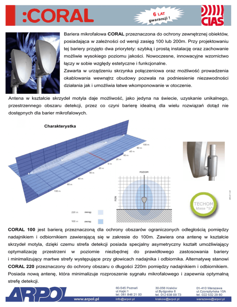 6 LAT Bariera mikrofalowa CORAL przeznaczona do ochrony zewnętrznej obiektów, posiadająca w zależności od wersji zasięg 100 lub 200m. Przy projektowaniu tej bariery przyjęto dwa priorytety: szybką i prostą instalację oraz zachowanie możliwie wysokiego poziomu jakości. Nowoczesne, innowacyjne wzornictwo łączy w sobie względy estetyczne i funkcjonalne. Zawarta w urządzeniu skrzynka połączeniowa oraz możliwość prowadzenia okablowania wewnątrz obudowy pozwala na podniesienie niezawodności działania jak i umożliwia łatwe wkomponowanie w otoczenie. Antena w kształcie skrzydeł motyla daje możliwość, jako jedyna na świecie, uzyskanie unikalnego, przestrzennego obszaru detekcji, przez co czyni barierę idealną dla wielu rozwiązań dotąd nie dostępnych dla barier mikrofalowych. ARPOL KP 11 2007 Charakterystka CORAL 100 jest barierą przeznaczoną dla ochrony obszarów ograniczonych odległością pomiędzy nadajnikiem i odbiornikiem zawierającą się w zakresie do 100m. Zawiera ona antenę w kształcie skrzydeł motyla, dzięki czemu strefa detekcji posiada specjalny asymetryczny kształt umożliwiający optymalizację przestrzeni w poziomie niezbędnej do prawidłowego zastosowania bariery i minimalizujący martwe strefy występujące przy głowicach nadajnika i odbiornika. Alternatywę stanowi CORAL 220 przeznaczony do ochrony obszaru o długości 220m pomiędzy nadajnikiem i odbiornikiem. Posiada nową antenę, która minimalizuje rozproszenie sygnału mikrofalowego i zapewnia optymalną strefę detekcji. Bariera CORAL uwzględnia w swojej budowie doświadczenia zebrane od instalatorów, aby maksymalnie uprościć pracę przy jej montażu. Skrzynka połączeniowa zawarta w urządzeniu ułatwia połączenie kabli. Poprawiono regulację czułości oraz umieszczono na płycie głównej bariery elektroniczny system umożliwiający łatwe ustawienie i regulację urządzenia. Aby wszystkie czynności związane z uruchomieniem urządzenia mogła wykonywać jedna osoba, w odbiorniku umieszczono sygnalizator akustyczny pozwalający wykonać test przejścia. Bariera mikrofalowa CORAL przystosowana jest do montażu na słupkach o średnicy zewnętrznej 60mm. Prowadzone we wnętrzu uchwytu mocującego kable nie są widoczne, przez co podniesiony został stopień ochrony przed ewentualną próbą sabotażu urządzenia. Zasada działania System bistatyczny TX-RX Zasięg 100 / 220m Częstotliwość 9,900 / 10,587GHz Zasilanie 13,8V DC lub 19V AC z akum. 2,3Ah Pobór prądu TX i RX 60mA Ilość kanałów pracy 16 Regulacja parametrów pracy Przy użyciu wbudowanego instrumentu do regulacji parametrów pracy i testu przejścia Sposób montażu na słupku d=60mm Wyjście Alarm, sabotaż i uszkodzenie – bezpotencjałowe Temperatura pracy -35°C do +65°C Stopień zabezpieczenia IP55 Wymiary 39 x 30 x 27cm Waga 6,7kg Obudowa została tak zaprojektowana aby w jej wnętrzu możliwe było umieszczenie (2) akumulatora buforowego oraz (1) transformatora toroidalnego. Dzięki temu rozwiązaniu możliwe urządzenia napięciem 13,8-24VDC lub 230VAC. jest zasilanie 19-24VAC, ARPOL KP 11 2007 Dane techniczne