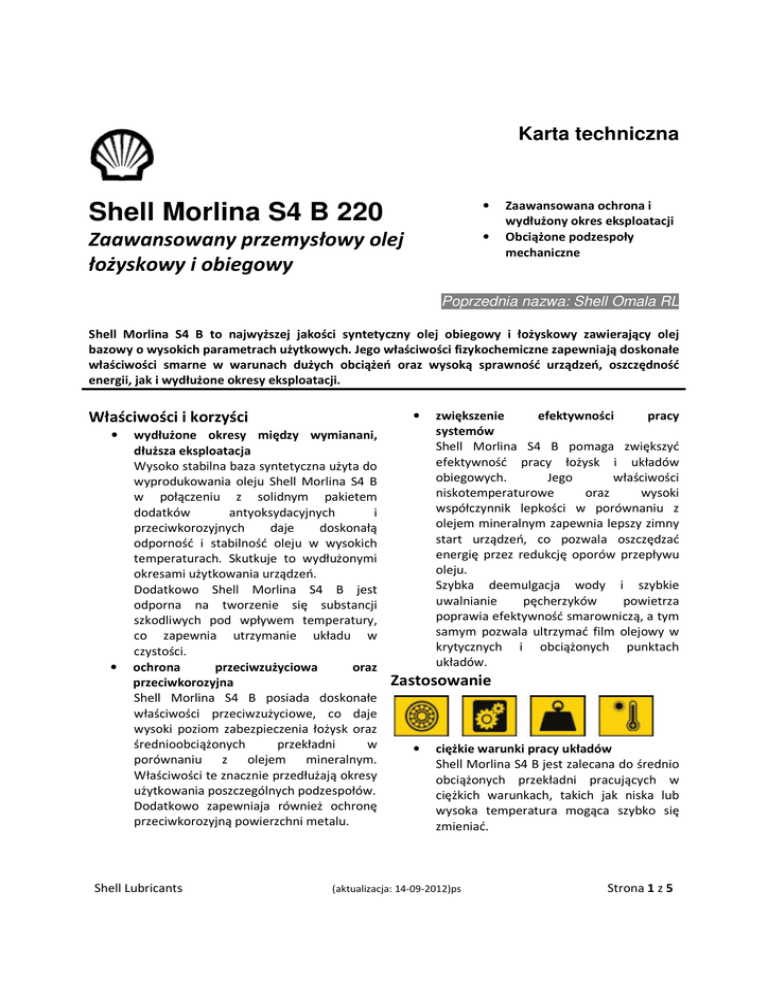 Karta techniczna Shell Morlina S4 B 220 • Zaawansowany przemysłowy olej łożyskowy i obiegowy • Zaawansowana ochrona i wydłużony okres eksploatacji Obciążone podzespoły mechaniczne Poprzednia nazwa: Shell Omala RL Shell Morlina S4 B to najwyższej jakości syntetyczny olej obiegowy i łożyskowy zawierający olej bazowy o wysokich parametrach użytkowych. Jego właściwości fizykochemiczne zapewniają doskonałe właściwości smarne w warunach dużych obciążeń oraz wysoką sprawność urządzeń, oszczędność energii, jak i wydłużone okresy eksploatacji. Właściwości i korzyści • • • wydłużone okresy między wymianani, dłuższa eksploatacja Wysoko stabilna baza syntetyczna użyta do wyprodukowania oleju Shell Morlina S4 B w połączeniu z solidnym pakietem dodatków antyoksydacyjnych i przeciwkorozyjnych daje doskonałą odporność i stabilność oleju w wysokich temperaturach. Skutkuje to wydłużonymi okresami użytkowania urządzeń. Dodatkowo Shell Morlina S4 B jest odporna na tworzenie się substancji szkodliwych pod wpływem temperatury, co zapewnia utrzymanie układu w czystości. ochrona przeciwzużyciowa oraz przeciwkorozyjna Shell Morlina S4 B posiada doskonałe właściwości przeciwzużyciowe, co daje wysoki poziom zabezpieczenia łożysk oraz średnioobciążonych przekładni w porównaniu z olejem mineralnym. Właściwości te znacznie przedłużają okresy użytkowania poszczególnych podzespołów. Dodatkowo zapewniaja również ochronę przeciwkorozyjną powierzchni metalu. Shell Lubricants zwiększenie efektywności pracy systemów Shell Morlina S4 B pomaga zwiększyć efektywność pracy łożysk i układów obiegowych. Jego właściwości niskotemperaturowe oraz wysoki współczynnik lepkości w porównaniu z olejem mineralnym zapewnia lepszy zimny start urządzeń, co pozwala oszczędzać energię przez redukcję oporów przepływu oleju. Szybka deemulgacja wody i szybkie uwalnianie pęcherzyków powietrza poprawia efektywność smarowniczą, a tym samym pozwala ultrzymać film olejowy w krytycznych i obciążonych punktach układów. Zastosowanie • ciężkie warunki pracy układów Shell Morlina S4 B jest zalecana do średnio obciążonych przekładni pracujących w ciężkich warunkach, takich jak niska lub wysoka temperatura mogąca szybko się zmieniać. (aktualizacja: 14-09-2012)ps Strona 1 z 5 • • • jedno zalanie na cały okres eksploatacji urządzenia systemy smarowania łożysk i obiegowe Odpowiednie do smarowania większości łożysk tocznych i ślizgowych, włączając warunki dużych obciążeń (przemysł cementowy, kamieniarski). systemy smarowania łożysk i obiegowe Odpowiednie do smarowania większości łożysk tocznych i ślizgowych, włączając warunki dużych obciążeń (przemysł cementowy, kamieniarski). Specyfikacje i dopuszczenia • • • • • • • • • • Procedura wymiany • Olej Shell Morlina S4 B jest kompatybilny z olejami mineralnymi i nie jest wymagana specjalna procedura wymiany. Jednakże, by uzyskać pełny dostęp do korzyści płynących z zastosowania produktu Shell Morlina S4 B nie należy go mieszać z innymi olejami. Ważną rzeczą jest również sprawdzenie przed wymianą czy podzespół jest wolny od zanieczyszczeń, co pozwoli maksymalnie wydłużyć okres jego użytkowania. Alfa Laval group D (układy przekładniowe) Aerzen Maschinenfabrik (dmuchawy) Baltimore Aircoil (układy przekładniowe) Cincinnati Machine Various P David Brown (aplikacje tabela H) Emerson Power Transmissions GEA Westfalia Separators GmbH Renold Gears (różne aplikacje) Sharpe (reduktory przekładni ślimakowych seria E) Winsmith (Peerless-Winsmith Inc) (przekładnie ślimakowe) ISO 12925-1 Typ CKS Bezpieczeństwo pracy Informacje dotyczące Bezpieczeństwa i Higieny użytkowania znajdują się w Karcie Charakterystyki. Ochrona środowiska Nie wylewać zużytego oleju do ścieków, zbiorników wodnych, na ziemię. Usuwać zużyty olej z pomocą jednostek recyklingu. Kompatybilność z uszczelnieniami i Porada Aby uzyskać więcej informacji prosimy farbami Shell Morlina S4 B jest kompatybilny z farbami i skontaktować się z przedstawicielem Shell. uszczelnieniami przewidzianymi do użycia z olejem mineralnym. Shell Lubricants (aktualizacja: 14-09-2012)ps Strona 2 z 5 Typowe Właściwości Fizyczne Shell Morlina S4 B Klasa lepkości ISO 3448 Lepkość kinematyczna @ 40 [0C] [cSt] 100 [0C] [cSt] (ISO 3104) Gęstość przy 15 [0C] ISO 12185 Współczynnik lepkości ISO 2909 Temperatura zapłonu, COC [0C] ISO 2592 Temperatura płynięcia [0C] ISO 3016 Test tworzenia emulsji, (minuty) ASTM D1401 Test FZG DIN 51354-2 (obciążenie graniczne) (A/8.3/90) Test na pienienie, Sekw. II ml piany w 0/10 min. 220 220 25.9 848 149 240 -48 15 >12 0/0 Powyższa charakterystyka jest typowa dla obecnej produkcji. Przyszłe partie produkcyjne będą spełniać specyfikacje produktowe Shell, niemniej mogą wystąpić pewne odchylenia od w/w wartości średnich. Shell Lubricants (aktualizacja: 14-09-2012)ps Strona 3 z 5 Shell Lubricants (aktualizacja: 14-09-2012)ps Strona 4 z 5 Shell Lubricants (aktualizacja: 14-09-2012)ps Strona 5 z 5