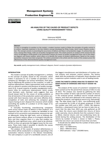 Management Systems in Production Engineering 2014, No 4 (16), pp 162‐167 DOI 10.12914/MSPE‐04‐04‐2014 AN ANALYSIS OF THE CAUSES OF PRODUCT DEFECTS USING QUALITY MANAGEMENT TOOLS Katarzyna MIDOR Silesian University of Technology Abstract: To stay or strengthen its posi on on the market, a modern business needs to follow the principles of quality control in its ac ons. Especially important is the Zero Defects concept developed by Philip Crosby, which means flawless produc‐ on. The concept consists in preven ng the occurrence of defects and flaws in all produc on stages. To achieve that, we must, among other things, make use of quality management tools. This ar cle presents an analysis of the reasons for the return of damaged or faulty goods in the automo ve industry by means of quality management tools such as the Ishika‐ wa diagram and Pareto analysis, which allow us to iden fy the causes of product defec veness. Based on the results, preven ve measures have been proposed. The ac ons presented in this ar cle and the results of the analysis prove the effec veness of the aforemen oned quality management tools. Key words: quality management tools, Ishikawa’s diagram, Pareto’s analysis of product defec veness INTRODUCTION The modern concept of quality management is, similarly to the concept of quality, based on the consumer, which makes it necessary to run a number of opera ons in the company [1]. Managers use various techniques, from plan‐ ning to delivering the product to the customer, in order to improve effec veness. Many improvement tools and meth‐ ods are u lised in prac ce and literature of quality manage‐ ment [2,3]. A great majority of quality management instru‐ ments relies on con nuous improvement, which results from Deming’s cycle. Deming’s cycle suggests that one should always look for the causes of arising problems so that all elements of the produc on system and ac ons con‐ nected with them become more and more effec ve [4,5]. Comple on of tasks and achieving the company’s goals require having at one’s disposal the resources which enable controlling the quality of a product in all the stages of its existence [6,7]. In everyday func oning, manufacturing companies come across various types of defects in their products. It is important that the cause of a defect be iden fied at the moment of its occurrence and preven ve measures be tak‐ en a erwards. Using the right tools, such as Ishikawa dia‐ gram and Pareto analysis allows us to properly iden fy de‐ fects and then organize them in a way that enables iso‐ la ng the most significant ones, which need to be eliminat‐ ed first as they can generate the biggest losses for the com‐ pany. These tools make it possible to iden fy the causes and significance of a defect [2,8]. The analysis of the causes of product defec veness in this ar cle will be conducted in a company opera ng in the automo ve industry located in the Silesian Voivodeship. The said company is a part of a worldwide concern, one of the biggest manufacturers and distributors of trac on con‐ trol systems and emission control systems. The factory deals with the produc on of hydraulic shock absorbers and suspension system modules used in cars of leading brands. USING THE PARETO‐LORENZ ANALYSIS TO IDENTIFY THE MAIN CAUSES OF DAMAGED AND FAULTY GOODS’ RE‐ TURN The analysis of the causes of customers’ complaints has been carried out for the period from January of 2011 to July of 2013. The analysis was started by gathering the data about the number of items sold and the number of returns in the analysed period. Unofficial returns include internal returns, ones that were detected in the company when e.g. sor ng the products, and logis cal returns (e.g. bad packag‐ ing). The data shows that in 2011, non‐conforming prod‐ ucts accounted for 0.19% of all goods produced; in 2012 the number was 0.6% and in 2013 – 0.05%. We observe, therefore, a downward trend, but we have to take into ac‐ count that the data from 2013 was only gathered up ll July. Next, the returns were divided into: returns of items under warranty, returns directly from the customer’s facto‐ ry (0km), internal returns and non‐conforming items de‐ tected during the sor ng process. The distribu on of the returns by number of items is shown in Table 1. Please, note that one return can consist of more than one item. It should also be added that the number of items sold in respec ve years was: 2011 – 3177844 items, 2012 – 4091531 items, 2013 (January – July) – 2531905 items. Management Systems in Produc on Engineering 4(16)/2014 163 K. MIDOR ‐ An analysis of the causes of product defects using quality management tools Table 1 Number of returned items in the studied period Returns No. of items Year Under warranty 0km A er sor ng Internal returns Official returns Unofficial returns 292 12 8 4592 2303 1196 351 8 ‐ 917 11 ‐ 36 39 27 6176 2295 1177 2011 2012 2013 January‐July Source: [own study based on 9] Table 2 The number of returned items in the studied period Number of returns/year Type of return 2011 2012 2013 Noise 35 36 16 Oil leakage 26 25 6 Badly installed component 4 3 1 Damaged component 3 4 1 Invalid component 6 3 4 Lack of a component 3 4 2 NOK parameters 6 5 3 NOK diameters 8 8 3 Illegible s cker 2 2 3 Lack of a s cker 5 2 3 Logis cal returns 6 7 2 Other 4 5 2 108 104 46 Sum of all returns Source: [own study based on 9] In the next stage the returns were analysed in terms of number and type of their causes. Such a compila on is shown in Table 2. The analysis of the data included in Table 2 indicates that there were 108 returns in 2011, 104 in 2012 and 46 such returns were reported in the first half of 2013. The largest number of returns in the analysed period concerned noise and oil leakage issues. The fewest returns, on the other hand, were related to a badly installed compo‐ nent and an illegible s cker or lack thereof. L