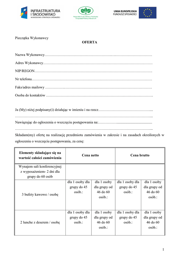 Pieczątka Wykonawcy OFERTA Nazwa Wykonawcy……………………………………………….….………………………… Adres Wykonawcy……………………………………………………………………………… NIP/REGON……………………………………………………………………………………. Nr telefonu……………………………………………………………………………………… Faks/adres mailowy …………….……………………………………………………………… Osoba do kontaktów ……………………………………………………………………………. Ja (My) niŜej podpisany(i) działając w imieniu i na rzecz…………………………………….... …………………………………………………………………………………………………... Nawiązując do ogłoszenia o wszczęciu postępowania na:……………....................................... …………………………………………………………………………………………………... Składam(my) ofertę na realizację przedmiotu zamówienia w zakresie i na zasadach określonych w ogłoszeniu o wszczęciu postępowania, za cenę: Elementy składające się na wartość całości zamówienia Cena netto Cena brutto Wynajem sali konferencyjnej z wyposaŜeniem- 2 dni dla grupy do 60 osób 3 bufety kawowe / osobę 2 lunche z deserem / osobę dla 1 osoby dla grupy do 45 osób.: dla 1 osoby dla grupy od 46 do 60 osób.: dla 1 osoby dla grupy do 45 osób.: dla 1 osoby dla grupy od 46 do 60 osób.: dla 1 osoby dla grupy do 45 osób.: dla 1 osoby dla grupy od 46 do 60 osób.: dla 1 osoby dla grupy do 45 osób.: dla 1 osoby dla grupy od 46 do 60 osób.: 1 Cena noclegu w pokoju 1-osobowym / 2-osobowym pokój 1-os.: pokój 2-os.: pokój 1-os.: pokój 2-os.: a) opis bufetu: ……………………………………………………………………………………. , b) opis lunchu z deserem 22.05.2014 r.: ………………………………………………………… …………………………………………………………………………………………………… , c) opis lunchu z deserem 23.05.2014 r.: ………………………………………………………… …………………………………………………………………………………………………… . Łączne wartości z tabeli: Łączny koszt organizacji spotkania (wynajem sali i wyŜywienie dla grupy 45 osób oraz nocleg dla 17 osób) wynosi: Słownie (netto) zł……………………………………………………………………………….. Słownie (brutto) zł……………………………………………………………………………… Łączny koszt organizacji spotkania (wynajem sali i wyŜywienie dla grupy 60 osób oraz nocleg dla 17 osób) wynosi: Słownie (netto) zł……………………………………………………………………………….. Słownie (brutto) zł……………………………………………………………………………… Termin realizacji………………………………………………………………………………... Miejsce realizacji zadania………………………………………………………………………. Oświadczamy, Ŝe: − zapoznaliśmy się z warunkami udzielenia zamówienia w szczególności zawartych w ogłoszeniu o wszczęciu postępowania, przyjmujemy je i nie wnosimy do nich zastrzeŜeń, − pozyskaliśmy wszystkie informacje pozwalające na sporządzenie oferty oraz wykonanie zamówienia, − zobowiązujemy się do wykonania zamówienia w terminie i na warunkach określonych w ogłoszeniu o wszczęciu postępowania i w niniejszej ofercie. Wraz z ofertą składam*: a) odpis z właściwego rejestru lub centralnej ewidencji i informacji x tak x nie 2 o działalności gospodarczej, b) pełnomocnictwo do zawarcia umowy, tak x nie x c) opis hotelu (min. pokoje + sala konferencyjna)szczególnie w zakresie spełnienia wymogów dotyczących wyposaŜenia pokoi i sali konferencyjnej, d) ……………………………………………………………………………………… …………………………………………... (data i podpis Wykonawcy) 3