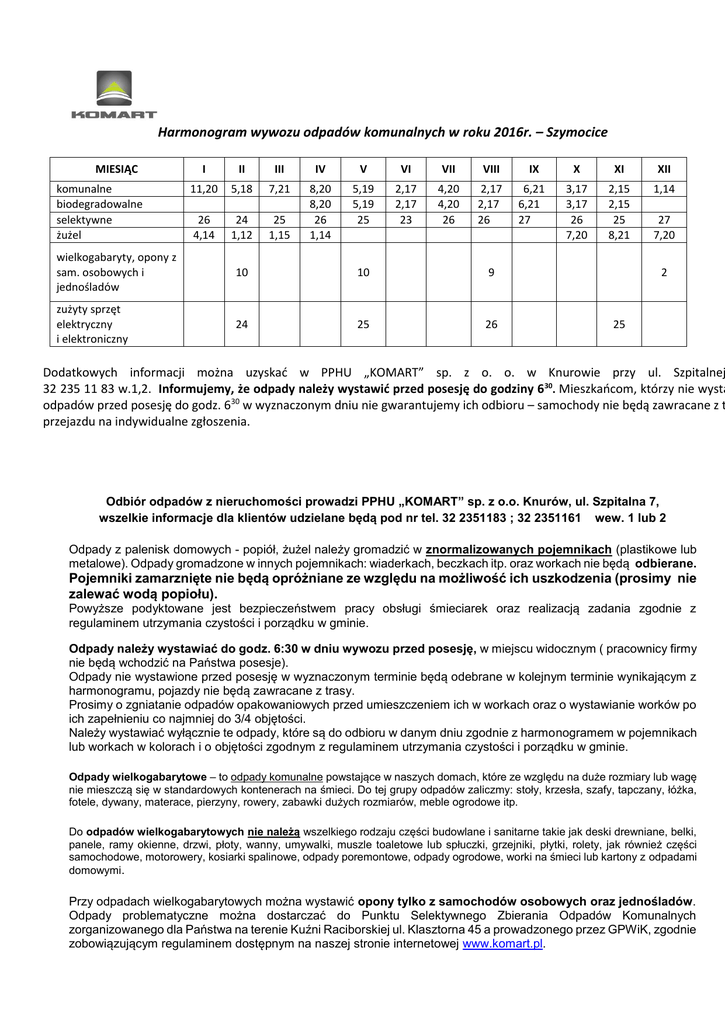 Harmonogram wywozu odpadów komunalnych w roku 2016r. – Szymocice MIESIĄC komunalne biodegradowalne selektywne żużel I II III IV V VI VII VIII IX X XI XII 11,20 5,18 7,21 24 1,12 25 1,15 5,19 5,19 25 2,17 2,17 23 4,20 4,20 26 2,17 2,17 26 6,21 6,21 27 3,17 3,17 26 7,20 2,15 2,15 25 8,21 1,14 26 4,14 8,20 8,20 26 1,14 wielkogabaryty, opony z sam. osobowych i jednośladów 10 10 9 zużyty sprzęt elektryczny i elektroniczny 24 25 26 27 7,20 2 25 Dodatkowych informacji można uzyskać w PPHU „KOMART” sp. z o. o. w Knurowie przy ul. Szpitalnej 32 235 11 83 w.1,2. Informujemy, że odpady należy wystawić przed posesję do godziny 6 30. Mieszkańcom, którzy nie wysta odpadów przed posesję do godz. 630 w wyznaczonym dniu nie gwarantujemy ich odbioru – samochody nie będą zawracane z t przejazdu na indywidualne zgłoszenia. Odbiór odpadów z nieruchomości prowadzi PPHU „KOMART” sp. z o.o. Knurów, ul. Szpitalna 7, wszelkie informacje dla klientów udzielane będą pod nr tel. 32 2351183 ; 32 2351161 wew. 1 lub 2 Odpady z palenisk domowych - popiół, żużel należy gromadzić w znormalizowanych pojemnikach (plastikowe lub metalowe). Odpady gromadzone w innych pojemnikach: wiaderkach, beczkach itp. oraz workach nie będą odbierane. Pojemniki zamarznięte nie będą opróżniane ze względu na możliwość ich uszkodzenia (prosimy nie zalewać wodą popiołu). Powyższe podyktowane jest bezpieczeństwem pracy obsługi śmieciarek oraz realizacją zadania zgodnie z regulaminem utrzymania czystości i porządku w gminie. Odpady należy wystawiać do godz. 6:30 w dniu wywozu przed posesję, w miejscu widocznym ( pracownicy firmy nie będą wchodzić na Państwa posesje). Odpady nie wystawione przed posesję w wyznaczonym terminie będą odebrane w kolejnym terminie wynikającym z harmonogramu, pojazdy nie będą zawracane z trasy. Prosimy o zgniatanie odpadów opakowaniowych przed umieszczeniem ich w workach oraz o wystawianie worków po ich zapełnieniu co najmniej do 3/4 objętości. Należy wystawiać wyłącznie te odpady, które są do odbioru w danym dniu zgodnie z harmonogramem w pojemnikach lub workach w kolorach i o objętości zgodnym z regulaminem utrzymania czystości i porządku w gminie. Odpady wielkogabarytowe – to odpady komunalne powstające w naszych domach, które ze względu na duże rozmiary lub wagę nie mieszczą się w standardowych kontenerach na śmieci. Do tej grupy odpadów zaliczmy: stoły, krzesła, szafy, tapczany, łóżka, fotele, dywany, materace, pierzyny, rowery, zabawki dużych rozmiarów, meble ogrodowe itp. Do odpadów wielkogabarytowych nie należą wszelkiego rodzaju części budowlane i sanitarne takie jak deski drewniane, belki, panele, ramy okienne, drzwi, płoty, wanny, umywalki, muszle toaletowe lub spłuczki, grzejniki, płytki, rolety, jak również części samochodowe, motorowery, kosiarki spalinowe, odpady poremontowe, odpady ogrodowe, worki na śmieci lub kartony z odpadami domowymi. Przy odpadach wielkogabarytowych można wystawić opony tylko z samochodów osobowych oraz jednośladów. Odpady problematyczne można dostarczać do Punktu Selektywnego Zbierania Odpadów Komunalnych zorganizowanego dla Państwa na terenie Kuźni Raciborskiej ul. Klasztorna 45 a prowadzonego przez GPWiK, zgodnie zobowiązującym regulaminem dostępnym na naszej stronie internetowej www.komart.pl.