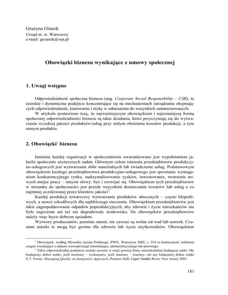 Grażyna Ożarek Urząd m. st. Warszawy e-mail: [email protected] Obowiązki biznesu wynikające z umowy społecznej 1. Uwagi wstępne Odpowiedzialność społeczna biznesu (ang. Corporate Social Responsibility – CSR), to szerokie i dynamiczne podejście koncentrujące się na mechanizmach zarządzania obejmujących odpowiedzialność, kierowanie i etykę w odniesieniu do wszystkich zainteresowanych. W artykule postawiono tezę, że najważniejszym obowiązkiem i najcenniejszą formą społecznej odpowiedzialności biznesu są takie działania, które przyczyniają się do wytwarzania wysokiej jakości produktów/usług przy stałym obniżaniu kosztów produkcji, a tym samym produktu. 2. Obowiązki1 biznesu Istnienie każdej organizacji w społeczeństwie uwarunkowane jest wypełnianiem jakichś społecznie użytecznych zadań. Głównym celem istnienia przedsiębiorstw produkcyjno-usługowych jest wytwarzanie dóbr materialnych lub świadczenie usług. Podstawowym obowiązkiem każdego przedsiębiorstwa produkcyjno-usługowego jest sprostanie wymaganiom konkurencyjnego rynku, maksymalizowanie zysków, inwestowanie, tworzenie nowych miejsc pracy – innymi słowy: być i rozwijać się. Obowiązkiem tych przedsiębiorstw w stosunku do społeczności jest przede wszystkim dostarczanie towarów lub usług o co najmniej oczekiwanej przez klientów jakości 2. Każdej produkcji towarzyszy wytwarzanie produktów ubocznych – często kłopotliwych, a nawet szkodliwych dla najbliższego otoczenia. Obowiązkiem przedsiębiorców jest takie zagospodarowanie odpadów poprodukcyjnych, aby zdrowie i życie mieszkańców nie było zagrożone ani też nie degradowały środowiska. Do obowiązków przedsiębiorców należy więc bycie dobrym sąsiadem. Wytwory producentów, pomimo starań, nie zawsze są wolne od wad lub usterek. Czasami usterki te mogą być groźne dla zdrowia lub życia użytkowników. Obowiązkiem 1 Obowiązek, według Słownika Języka Polskiego, PWN, Warszawa 2002, s. 554 to konieczność zrobienia czegoś wynikająca z nakazu wewnętrznego (moralnego), administracyjnego lub prawnego. 2 Takie odpowiedzialne podejście zostało zawarte w misji pewnej firmy amerykańskiej budującej statki: My budujemy dobre statki, jeśli możemy – zyskujemy; jeśli musimy – tracimy; ale my budujemy dobre statki S.T. Foster, Managing Quality an Integrative Approach, Prentice Hall, Upper Saddle River, New Jersey 2001. 181 przedsiębiorców w takiej sytuacji jest przyznanie się do błędu i zapewnienie zadośćuczynienia wszystkim poszkodowanym3. Kolejną powinnością przedsiębiorców jest uczciwość wobec pracowników, akcjonariuszy4 oraz innych interesariuszy, przestrzeganie obowiązujących przepisów prawa ustanowionych na danym terytorium, w tym wywiązywanie się ze zobowiązań podatnika (przedstawianie wyników finansowych zgodnie z faktami), a także respektowanie funkcjonujących norm społecznych. Gdy obowiązki te są w sposób naturalny wypełniane, wtedy rodzi się zaufanie, którym darzą się nawzajem członkowie danej społeczności. Jak wynika z licznych przykładów, zaufanie przyczynia się do obniżania kosztów transakcyjnych, ogranicza niepewność, jaka występuje w działalności gospodarczej i społecznej, wpływa na ekonomiczny sukces. Niestety, obok wypełniających obowiązki przedsiębiorstw, funkcjonują także i takie, które uchylają się od ich; nie wywiązują się z elementarnych powinności pracodawcy5, przyczyniają się do degradacji środowiska naturalnego 6, produkują niskiej jakości produkty (najczęściej podróbki). Odkryte, mniejsze lub większe, afery i skandale z reguły wywołują wzmożoną debatę nad powinnościami i odpowiedzialnością przedsiębiorców. Naturalną reakcją są wtedy zmiany prawne, organizacyjne, kontrolne. Każda afera czy skandal jest rysą na wizerunku całego środowiska, dlatego wtedy częściej niż kiedykolwiek podkreśla się rolę i znaczenie odpowiedzialnej przedsiębiorczości, promuje się dobre przykłady, zachęca do podejmowania odpowiedzialnych praktyk. Jedną z nich jest idea CSR, która podkreślając znaczenie biznesu przypomina mu o odpowiedzialności wobec społeczności. 3. Idea społecznie odpowiedzialnego biznesu lub odpowiedzialnej przedsiębiorczości Idea CSR zwykle jest definiowana jako najlepsze wypełnianie ogólnie oczekiwanych funkcji firmy (wytwarzanie dobrego, bezpiecznego produktu, przestrzeganie praw pracowniczych, ochrony środowiska, standardów technologicznych i etycznych) lub podejmowanie działań wybiegających poza zwykłe minimum egzekwowane prawem lub dobrymi obyczajami. Przyjmuje się, że zaawansowane CSR występuje w tych firmach, które podejmują takie działania w miejscu pracy i środowisku lokalnym, które wykraczają poza zwykłe minimum np. wspierają lokalne przedsięwzięcia. Działania te mają na celu poprawę zarówno własnych wyników, jak i zwiększenie pozytywnego oddziaływania na jakość życia spo3 Znamiennym przykładem takiego podejścia jest przypadek, który zdarzył się szwedzkiej sieci sklepów IKEA w Polsce. Po stwierdzeniu, że sprzedane łóżeczka dla niemowląt nie spełniają europejskich norm bezpieczeństwa, firma natychmiast zareagowała. Zamieszczono stosowny komunikat w mediach i rozpoczęto wymianę wadliwego elementu mebla. Ikea ostrzega przed groźnymi łóżeczkami, „Życie Warszawy”, 29 marca 2006. 4 Seria skandali w USA, którą rozpoczął w 2001 r. koncern energetyczny Enron, a następnie towarzystwo ubezpieczeniowe Conesco, operator telekomunikacyjny Globar Crosing, sieć telewizji kablowej Adelphia Comunications, usługodawca telekomunikacyjny WorldCom. W WorldCom’ie ukrywano straty i dokonano manipulacji finansowych na sumę 11 mld dol. Umożliwiało to spółce wykazanie się znakomitymi wynikami przed akcjonariuszami. Tymczasem firma przynosiła straty. Szefowi firmy postawiono zarzuty malwersacji, spisku na szko