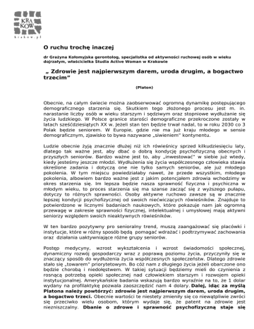 O ruchu trochę inaczej dr Grażyna Kołomyjska gerontolog, specjalistka od aktywności ruchowej osób w wieku dojrzałym, właścicielka Studia Active Woman w Krakowie „ Zdrowie jest najpierwszym darem, uroda drugim, a bogactwo trzecim” (Platon) Obecnie, na całym świecie można zaobserwować ogromną dynamikę postępującego demograficznego starzenia się. Skutkiem tego złożonego procesu jest m. in. narastanie liczby osób w wieku starszym i sędziwym oraz stopniowe wydłużanie się życia ludzkiego. W Polsce granice starości demograficzne przekroczone zostały w latach sześćdziesiątych XX w. Jeżeli stan ten będzie trwał nadal, to w roku 2030 co 3 Polak będzie seniorem. W Europie, gdzie nie ma już kraju młodego w sensie demograficznym, zjawisko to bywa nazywane „siwieniem” kontynentu. Ludzie obecnie żyją znacznie dłużej niż ich rówieśnicy sprzed kilkudziesięciu laty, dlatego tak ważne jest, aby dbać o dobrą kondycję psychofizyczną obecnych i przyszłych seniorów. Bardzo ważne jest to, aby „inwestować” w siebie już wtedy, kiedy jesteśmy jeszcze młodzi. Wydłużenia się życia współczesnego człowieka stawia określone zadania i dotyczą one nie tylko samych seniorów, ale już młodego pokolenia. W tym miejscu powiedziałaby nawet, że przede wszystkim, młodego pokolenia, albowiem bardzo ważne jest z jakim potencjałem zdrowia wchodzimy w okres starzenia się. Im lepsza będzie nasza sprawność fizyczna i psychiczna w młodym wieku, to proces starzenia się ma szanse zacząć się z wyższego pułapu, dotyczy to różnych sprawności. Osoby aktywne ruchowo zawsze są w znacznie lepszej kondycji psychofizycznej od swoich niećwiczących rówieśników. Znajduje to potwierdzone w licznymi badaniach naukowych, które pokazuje nam jak ogromną przewagę w zakresie sprawności fizycznej, intelektualnej i umysłowej mają aktywni seniorzy względem swoich nieaktywnych rówieśników. W ten bardzo pozytywny pro senioralny trend, muszą zaangażować się placówki i instytucje, które w różny sposób będą pomagać wdrażać i podtrzymywać zachowania oraz działania uaktywniające różne grupy seniorów. Postęp medycyny, wzrost wykształcenia i wzrost świadomości społecznej, dynamiczny rozwój gospodarczy wraz z poprawą poziomu życia, przyczyniły się w znaczący sposób do wydłużenia życia współczesnych społeczeństw. Dlatego zdrowie stało się „towarem” priorytetowym. Bo cóż nam z długiego życia jeżeli obarczone ono będzie chorobą i niedołęstwem. W takiej sytuacji będziemy mieli do czynienia z rosnącą potrzebą opieki społecznej nad człowiekiem starszym i rozwojem opieki instytucjonalnej. Amerykańskie badania wskazują bardzo wyraźnie na to, że 1 dolar wydany na profilaktykę pozwala zaoszczędzić nam 4 dolary. Dalej, idąc za myślą Platona należy powtórzyć: zdrowie jest najpierwszym darem, uroda drugim, a bogactwo trzeci. Obecnie wartości te niestety zmieniły się co niewątpliwie zwróci się przeciwko wielu osobom, którym wydaje się, że patent na zdrowie jest niezniszczalny. Dbanie o zdrowe i sprawność psychofizyczną staje się priorytetem w obliczu starzejących się społeczeństw i odnosi się do każdego z nas bez względu na wiek. W tym miejscu powołam się na opinię wielu gerontologów, że przedłużanie życia ludzkiego bez poprawy jego jakości, byłoby katastrofą. Świetnie to też ujmuje jedno z przysłów ludowych, które mówi:” na to, aby być zdrowym trzeba nauczyć się mądrze żyć”. Myślę, że edukacja prozdrowotna jest niezwykle istotna z punktu widzenia poruszanych kwestii. W związku z powyższym nasuwa się wniosek , który skłania do podejmowanie systematycznych działań zmierzających w kierunku kształtowania zachowań prozdrowotnych, mających na celu preferowanie i kreowanie postaw służących zdrowiu i pomoc w kształtowaniu pozytywnych zasad postępowania pielęgnujących zdrowie, wtedy kiedy jesteśmy młodzi. Tu również pozwolę sobie przytoczyć przysłowie ludowe, ” …o zdrowiu i o pieniądzach najczęściej myślimy wtedy kiedy się kończą”. Alexis Carrel twierdzi że”….. życie długie ma sens tylko, jeżeli przedłuży się okres młodości, a nie starości. Przedłużenie wieku sędziwego byłoby katastrofą….” To zdanie znakomicie oddaje sens długiego życia, bo ono wówczas będzie „radością” kiedy człowiek jest zdrowy, w pełni sił, może wytyczać sobie cele i je realizować. Wiele znakomitych przykładów takich ludzi znajdujemy obecnie, chociażby królowa Elżbiet II mająca 86 ciągle pełni funkcje reprezentacyjne i przyjmuje wielu dostojników państwowych. Zdrowie jest stanem naturalnym i możemy cieszyć się nim do końca życia pod warunkiem, że o nie dbamy. Zdrowie to nie tylko brak choroby czy kalectwa, ale zdrowie jest przede wszystkim stanem, który charakteryzuje się dużą energią życiową, optymizmem i chęcią do działania. Przejawia się ono także w sile fizycznej oraz w doznawaniu przyjemności w tym co robimy. Gdybyśmy zdołali uchronić się od różnych przypadkowych uszkodzeń, moglibyśmy osiągnąć w zdrowiu genetycznie zaprogramowaną granicę, to jest 120 a nawet 150 lat!!!! Potrzeba zachowania zdrowia psychofizycznego jest jedną z podstawowych i naturalnych potrzeb. Hipokrates, ojciec medycyny, mawiał „kto nie ma czasu dla swojego zdrowia, będzie musiał mieć czas dla swojej choroby”, z kolei inne powiedzenie Hipokratesa „.. nie czekaj na ból i chorobę, zrób sobie przyjemność”, znakomicie odzwierciedlają to jak ważna jest troska o zdrowie w obliczu perspektywy długiego życia. Pamiętajmy, że z działań poświęconych zdrowiu możemy czerpać przyjemność i doświadczyć satysfakcji, a przede wszystkim powinniśmy hołdować zasadzie, że należy dodawać życia do lat, a nie lat do życia . Wprawdzie jak jesteśmy bardzo młodzi lubimy dodawać s