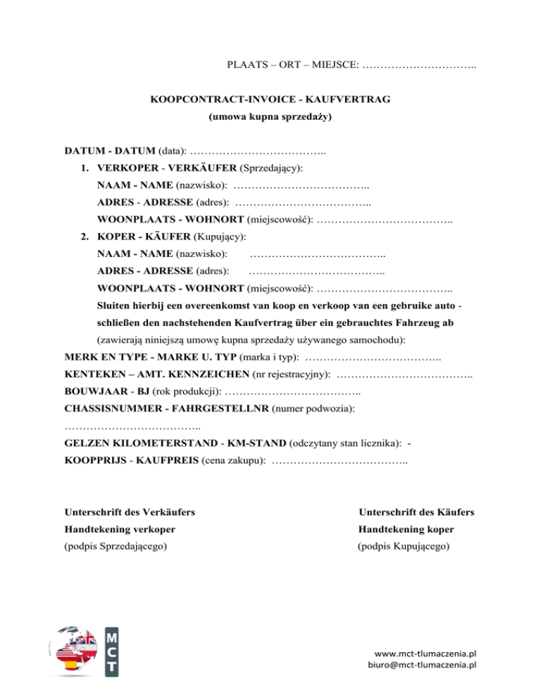 PLAATS – ORT – MIEJSCE: ………………………….. KOOPCONTRACT-INVOICE - KAUFVERTRAG (umowa kupna sprzedaży) DATUM - DATUM (data): ……………………………….. 1. VERKOPER - VERKÄUFER (Sprzedający): NAAM - NAME (nazwisko): ……………………………….. ADRES - ADRESSE (adres): ……………………………….. WOONPLAATS - WOHNORT (miejscowość): ……………………………….. 2. KOPER - KÄUFER (Kupujący): NAAM - NAME (nazwisko): ……………………………….. ADRES - ADRESSE (adres): ……………………………….. WOONPLAATS - WOHNORT (miejscowość): ……………………………….. Sluiten hierbij een overeenkomst van koop en verkoop van een gebruike auto schließen den nachstehenden Kaufvertrag über ein gebrauchtes Fahrzeug ab (zawierają niniejszą umowę kupna sprzedaży używanego samochodu): MERK EN TYPE - MARKE U. TYP (marka i typ): ……………………………….. KENTEKEN – AMT. KENNZEICHEN (nr rejestracyjny): ……………………………….. BOUWJAAR - BJ (rok produkcji): ……………………………….. CHASSISNUMMER - FAHRGESTELLNR (numer podwozia): ……………………………….. GELZEN KILOMETERSTAND - KM-STAND (odczytany stan licznika): KOOPPRIJS - KAUFPREIS (cena zakupu): ……………………………….. Unterschrift des Verkäufers Unterschrift des Käufers Handtekening verkoper Handtekening koper (podpis Sprzedającego) (podpis Kupującego) www.mct-tlumaczenia.pl [email protected]