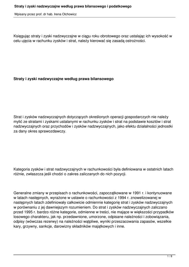 Straty i zyski nadzwyczajne według prawa bilansowego i podatkowego Wpisany przez prof. dr hab. Irena Olchowicz Księgując straty i zyski nadzwyczajne w ciągu roku obrotowego oraz ustalając ich wysokość w celu ujęcia w rachunku zysków i strat, należy kierować się zasadą ostrożności. Straty i zyski nadzwyczajne według prawa bilansowego Strat i zysków nadzwyczajnych dotyczących określonych operacji gospodarczych nie należy mylić ze stratami i zyskami ustalanymi w rachunku zysków i strat na podstawie kosztów i strat nadzwyczajnych oraz przychodów i zysków nadzwyczajnych, jako efektu działalności jednostki za dany okres sprawozdawczy. Kategoria zysków i strat nadzwyczajnych w rachunkowości była definiowana w ostatnich latach różnie, zwłaszcza jeśli chodzi o zakres zaliczanych do nich pozycji. Generalne zmiany w przepisach o rachunkowości, zapoczątkowane w 1991 r. i kontynuowane w latach następnych, wyrażone w ustawie o rachunkowości z 1994 r. znowelizowanej w następnych latach zdefiniowały całkowicie odmiennie kategorię strat i zysków nadzwyczajnych w porównaniu z jej dawniejszym rozumieniem. Do strat i zysków nadzwyczajnych zaliczano przed 1995 r. bardzo różne kategorie, odmienne w treści, nie mające w większości przypadków losowego charakteru, jak np. przedawnione, umorzone, odpisane należności i zobowiązania, odpisy (wówczas rezerwy) na należności wątpliwe, wyniki przeszacowania zapasów, wszelkie kary, grzywny, sankcje, darowizny składników majątkowych i inne. 1/8 Straty i zyski nadzwyczajne według prawa bilansowego i podatkowego Wpisany przez prof. dr hab. Irena Olchowicz Taki konglomerat zdarzeń gospodarczych różnego typu nie był zgodny z nadaną tej kategorii nazwą - straty i zyski nadzwyczajne. Uniemożliwiało to przedstawianie jasnego i prawdziwego obrazu efektywności jednostki oraz osiąganych wyników w podziale na poszczególne obszary działalności, a mianowicie działalność podstawową operacyjną, pozostałą operacyjną, finansową i nadzwyczajną. Dlatego w ustawie o rachunkowości z 1994 r., kierując się ogólnymi założeniami prawa bilansowego zawartymi w Dyrektywach Unii Europejskiej i w Międzynarodowych Standardach Rachunkowości przyjęto, iż przez straty i zyski nadzwyczajne rozumie się skutki finansowe zdarzeń powstających niepowtarzalnie, poza zwykłą działalności jednostki, a w szczególności spowodowanych zdarzeniami losowymi, zaniechaniem lub zawieszeniem pewnego rodzaju działalności (w tym również istotną zmianą metod produkcji) lub sprzedażą zorganizowanej części jednostki oraz postępowaniem układowym lub naprawczym. W IV Dyrektywie UE dotyczącej sprawozdań finansowych postuluje się wyodrębnienie w rachunku zysków i strat nadzwyczajnych kosztów i przychodów powstałych poza zwykłą działalnością operacyjną jednostki. Jeżeli pozycje te są istotne dla oceny wyników, to w informacji dodatkowej należy zamieścić wyjaśnienia dotyczące ich kwot i charakteru. W komentarzu do tego zapisu podano, iż w nowoczesnej rachunkowości jest widoczna tendencja do zmniejszania liczby pozycji uznawanych za nadzwyczajne. Mają być do nich zaliczane przychody i koszty tylko w rzadkich przypadkach. Przy klasyfikacji tych pozycji należy brać pod uwagę różne czynniki, takie jak wielkość jednostki i rodzaj prowadzonej działalności gospodarczej. Im działalność ta jest szersza, tym częściej następują pewne zdarzenia i w 2/8 Straty i zyski nadzwyczajne według prawa bilansowego i podatkowego Wpisany przez prof. dr hab. Irena Olchowicz konsekwencji bardziej poprawne jest zaliczanie ich do pozycji zwyczajnych. W MSR 1 Prezentacja sprawozdań finansowych w § 85 stwierdza się, iż jednostka nie może prezentować żadnych pozycji przychodów lub kosztów jako pozycji nadzwyczajnych w rachunku zysków i strat, ani w informacji dodatkowej. Od 1.01.2002 r. w uor ograniczono straty i zyski nadzwyczajne do zdarzeń losowych; wyeliminowano zdarzenia związane z zaniechaniem lub zawieszeniem pewnych rodzajów działalności oraz wyniki postępowania układowego lub naprawczego. Dlatego zapisano, iż przez straty i zyski nadzwyczajne rozumie się straty i zyski powstające na skutek zdarzeń trudnych do przewidzenia, poza działalnością operacyjną jednostki i niezwiązane z ogólnym ryzykiem jej prowadzenia (art. 3 ust. 1 pkt 33 uor). Zyski nadzwyczajne obejmują odszkodowania za straty będące skutkiem zdarzeń losowych, to znaczy niezależnych od działalności jednostki oraz odzyskane składniki majątkowe po rozliczeniu skutków zdarzeń losowych. Straty nadzwyczajne obejmują wartość utraconych składników majątkowych na skutek zdarzeń losowych oraz koszty usuwania skutków tych zdarzeń. Wszelkie operacje nie mające takiego charakteru, a zaliczane uprzednio do strat i zysków nadzwyczajnych, stają się kategoriami pozostałych kosztów i przychodów operacyjnych. I ta kategoria z kolei stała się zbiorem różnorodnych operacji związanych pośrednio z działalnością operacyjną jednostki. Zalicza się do nich w szczególności koszty i przychody spowodowane: sprzedażą, likwidacją środków trwałych i wartości niematerialnych i prawnych, odpisaniem należności i zobowiązań przedawnionych, umorzonych i nieściągalnych, utworzeniem i rozwiązaniem rezerw, z wyjątkiem dotyczących operacji finansowych, odpisami aktualizującymi wartość aktywów i ich korektami z wyjątkiem dotyczących działalności finansowej, zapłatą lub otrzymaniem odszkodowań, kar i grzywien, otrzymaniem lub przekazaniem darowizn oraz otrzymaniem dotacji, subwencji i dopłat na inne cele niż nabycie lub wytworzenie środków trwałych, środków trwałych w budowie lub wartości niematerialnych i prawnych. 3/8 Straty i zyski nadzwyczajne według prawa bilansowego i podatkowego Wpisany przez prof. dr hab. Irena Olchowicz Wyodrębnioną wyraźnie grupą operacji stał