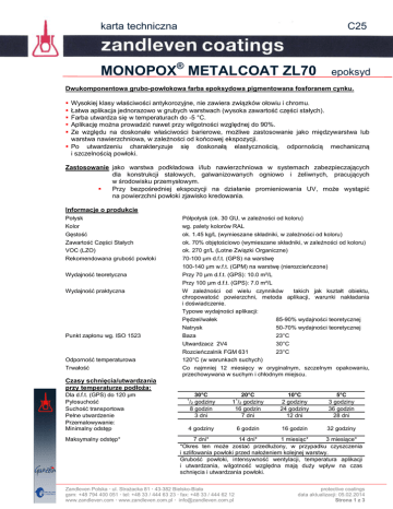 karta techniczna C25 MONOPOX® METALCOAT ZL70 epoksyd Dwukomponentowa grubo-powłokowa farba epoksydowa pigmentowana fosforanem cynku. Wysokiej klasy właściwości antykorozyjne, nie zawiera związków ołowiu i chromu. Łatwa aplikacja jednorazowo w grubych warstwach (wysoka zawartość części stałych). Farba utwardza się w temperaturach do -5 °C. Aplikację można prowadzić nawet przy wilgotności względnej do 90%. Ze względu na doskonałe właściwości barierowe, możliwe zastosowanie jako międzywarstwa lub warstwa nawierzchniowa, w zależności od końcowej ekspozycji. Po utwardzeniu charakteryzuje się doskonałą elastycznością, odpornością mechaniczną i szczelnością powłoki. Zastosowanie jako warstwa podkładowa i/lub nawierzchniowa w systemach zabezpieczających dla konstrukcji stalowych, galwanizowanych ogniowo i żeliwnych, pracujących w środowisku przemysłowym. Przy bezpośredniej ekspozycji na działanie promieniowania UV, może wystąpić na powierzchni powłoki zjawisko kredowania. Informacje o produkcie Połysk Kolor Gęstość Zawartość Części Stałych VOC (LZO) Rekomendowana grubość powłoki Wydajność teoretyczna Wydajność praktyczna Punkt zapłonu wg. ISO 1523 Odporność temperaturowa Trwałość Półpołysk (ok. 30 GU, w zależności od koloru) wg. palety kolorów RAL ok. 1.45 kg/L (wymieszane składniki, w zależności od koloru) ok. 70% objętościowo (wymieszane składniki, w zależności od koloru) ok. 270 gr/L (Lotne Związki Organiczne) 70-100 µm d.f.t. (GPS) na warstwę 100-140 µm w.f.t. (GPM) na warstwę (nierozcieńczone) Przy 70 µm d.f.t. (GPS): 10.0 m²/L Przy 100 µm d.f.t. (GPS): 7.0 m²/L W zależności od wielu czynników takich jak kształt obiektu, chropowatość powierzchni, metoda aplikacji, warunki nakładania i doświadczenie. Typowe wydajności aplikacji: Pędzel/wałek 85-90% wydajności teoretycznej Natrysk 50-70% wydajności teoretycznej Baza 23°C Utwardzacz 2V4 30°C Rozcieńczalnik FGM 631 23°C 120°C (w warunkach suchych) Co najmniej 12 miesięcy w oryginalnym, szczelnym opakowaniu, przechowywana w suchym i chłodnym miejscu. Czasy schnięcia/utwardzania przy temperaturze podłoża: Dla d.f.t. (GPS) do 120 µm Pyłosuchość Suchość transportowa Pełne utwardzenie Przemalowywanie: Minimalny odstęp Maksymalny odstęp* 30°C /2 godziny 8 godzin 3 dni 20°C 1 1 /2 godziny 16 godzin 7 dni 10°C 2 godziny 24 godziny 12 dni 5°C 3 godziny 36 godzin 28 dni 4 godziny 6 godzin 16 godzin 32 godziny 1 7 dni* 14 dni* 1 miesiąc* 3 miesiące* *Okres ten może zostać przedłużony, w przypadku czyszczenia i szlifowania powłoki przed nałożeniem kolejnej warstwy. Grubość powłoki, intensywność wentylacji, temperatura aplikacji i utwardzania, wilgotność względna mają duży wpływ na czas schnięcia i utwardzania powłoki. Zandleven Polska · ul. Strażacka 81 · 43-382 Bielsko-Biała gsm: +48 794 400 051 · tel: +48 33 / 444 63 23 · fax: +48 33 / 444 62 12 www.zandleven.com · www.zandleven.com.pl · [email protected] protective coatings data aktualizacji: 05.02.2014 Strona 1 z 3 Wskazówki dotyczące stosowania Proporcje mieszania Instrukcja mieszania składników Czas indukcji Żywotność mieszaniny Objętościowo: Baza – utwardzacz 2V4 81:19 Wagowo: Baza – utwardzacz 2V4 87,5:12,5 Baza i utwardzacz powinny być mieszane i aplikowane w temperaturze powyżej 10°C. W niższych temperaturach może być konieczne dodanie rozcieńczalnika w celu poprawienia właściwości aplikacyjnych, obniża to jednak odporność farby na ugięcia oraz może wydłużyć czas utwardzania. Składniki powinny być wymieszane jednorodnie z użyciem mieszadła mechanicznego. Zwróć uwagę na boki i dno puszki. Przy 20°C - nie jest wymagany Przy 10°C - co najmniej 10 minut 20 litrowe opakowanie: ok. 16 godzin przy 10°C ok. 8 godzin przy 20°C ok. 5 godzin przy 30°C Optymalne warunki aplikacji Temperatura : 15-25°C Wilgotność : 40-75% Techniczne i estetyczne właściwości powłoki mogą ulec zmianie kiedy produkt będzie aplikowany w innych warunkach. Natrysk Natrysk Pędzel/wałek Zalecenia do aplikacji hydrodynamiczny powietrzny Typ rozcieńczalnika FGM 631 FGM 631 FGM 631 Zalecana ilość rozcieńczalnika 5 – 15 obj. % 5 – 20 obj. % 0 – 5 obj. % (zależnie od aplikacji i wyposażenia) Rozmiar dyszy Ciśnienie Typowe osiągalne d.f.t. (GPS) Czyszczenie narzędzi 0.41 – 0.46 mm 2.0 – 2.5 mm 0.016 – 0.018 inch 150 – 180 bar 3 – 5 bar 80 – 120 µm 70 – 100 µm Rozcieńczalnik FGM 631, Zmywacz MF 60 – 80 µm Przygotowanie powierzchni Stal Konstrukcje nowe: Czyszczenie strumieniowo-ścierne zgodnie ze standardami ISO 8501-1:1988 do stopnia czystości Sa2½. Chropowatość podłoża Ra 10-12 µm Rz 50-60 µm. Powierzchnia musi być sucha i wolna od wszelkich zanieczyszczeń. Naprawy i renowacja: Oczyścić podłoże odpowiednią metodą dobraną do warunków i rodzaju zanieczyszczenia lub za pomocą gorącej pary. Usunąć sole i inne rozpuszczalne w wodzie zanieczyszczenia poprzez spłukanie czystą wodą pod wysokim ciśnieniem. Ogniska korozji, rdzę nalotową, zgorzel itp. usunąć przez czyszczenie wodą pod wysokim ciśnieniem lub strumieniowo-ściernie do stopnia Sa2½ lub mechanicznie do stopnia St. 2-3. Nałożyć zaprojektowany odpowiedni system na czyste podłoże. Czyszczenie metodami mechanicznymi lub ręcznymi daje niższą jakość przygotowania podłoża niż czyszczenie wodą pod wysokim ciśnieniem lub czyszczenie strumieniowo-ścierne co może wpłynąć na ostateczną jakość aplikowanego systemu zabezpieczającego. Stal galwanizowana ogniowo Przygotować powierzchnię przez lekkie omiecenie niemetalicznym ścierniwem do uzyskania jednolitej powierzchni o zbliżonej chropowatości odpowiedniej dla aplikacji farby lub oczyścić powierzchnię galwanizowaną odpowiednimi środkami czyszczącymi, w celu usunięcia soli cynku, oleju, tłuszczu oraz innych zanieczyszczeń, nastę
