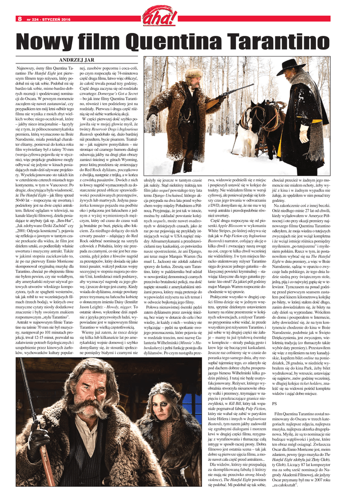 8 nr 224 - STYCZEŃ 2016 Nowy film Quentina Tarantino ANDRZEJ JAR Najnowszy, ósmy film Quentina Tarantino The Hateful Eight jest pierwszym filmem tego reżysera, który podobał mi się tak sobie. Podobał mi się bardzo tak sobie, mimo bardzo dobrych recenzji i spodziewanej nominacji do Oscara. W pewnym momencie zacząłem się nawet zastanawiać, czy przypadkiem ten mój letni odbiór tego filmu nie wynika z moich zbyt wielkich wobec niego oczekiwań, które – jakby nieco irracjonalnie – łączyły się z tym, że północnoamerykańska premiera, którą wyznaczono na Boże Narodzenie, miała poniekąd charakter elitarny, ponieważ do końca roku film wyświetlany był z taśmy 70 mm (wersja cyfrowa pojawiła się w styczniu), więc projekcje grudniowe mogły odbywać się jedynie w kinach posiadających mało dziś używane projektory. Wyselekcjonowano sto takich kin w czterdziestu czterech miastach tego kontynentu, w tym w Vancouver. Po drugie, ekscytująca była wiadomość, że The Hateful Eight – jak filmy sprzed 50-60 lat – rozpoczyna się uwerturą i podzielony jest na dwie części antraktem. Ilekroć oglądam w telewizji, na kanale klasyki filmowej, dzieła posiadające te atrybuty (jak np. „Ben-Hur”, „Jak zdobywano Dziki Zachód” czy „2001: Odyseja kosmiczna”), pojawia się refleksja o jawnym w tamtym czasie przekazie dla widza, że film jest dziełem sztuki, co podkreślały właśnie uwertura i muzyczny antrakt. Także w jakimś stopniu zaciekawiało to, że po raz pierwszy Ennio Morricone skomponował oryginalną muzykę dla Tarantino, chociaż po obejrzeniu filmu nie byłem pewien, czy nie wolałbym, aby amerykański reżyser używał gotowych utworów włoskiego kompozytora, tych ze spaghetti westernów, tak jak robił to we wcześniejszych filmach (trzech bodaj), w których owe muzyczne cytaty niosły dodatkowe znaczenie i były swoistym znakiem rozpoznawczym „stylu Tarantino”. Antrakt w najnowszym filmie Tarantino na taśmie 70 mm nie był muzyczny, następował po 101 minutach projekcji, trwał 12-15 minut, pozwalał na załatwienie potrzeb fizjologicznych i uzupełnienie przez kinowych żarłoków, wychowanków kultury popular- nej, zasobów popcornu i coca-coli, po czym rozpoczęła się 74-minutowa część druga filmu, łatwo więc obliczyć, że całość trwała ponad trzy godziny. Część druga zaczyna się od rozdziału czwartego: Domergue’s Got a Secret – bo jak inne filmy Quentina Tarantino, również i ten podzielony jest na rozdziały. Pierwsza i druga część różnią się od siebie wartkością akcji. W części pierwszej dość szybko pojawiła się w mojej głowie myśl, że twórcy Reservoir Dogs i Inglourious Basterds spodobało się, dużo bardziej niż przedtem, bycie pisarzem. Teatralne – jak najpierw pomyślałem – nie stroniące od czarnego humoru dialogi odsuwają jakby na drugi plan obrazy zamieci śnieżnej w górach Wyoming, przez którą przedziera się zmierzający do Red Rock dyliżans, początkowo z dwójką, następnie z trójką, a w końcu z czwórką pasażerów. Dwóch z nich to łowcy nagród wyznaczonych za dostarczenie przed oblicze sprawiedliwości poszukiwanych przestępców, żywych lub martwych. Jedyna pasażerka konnego pojazdu ma podbite oko i połączona jest łańcuchem z jednym z wyżej wymienionych mężczyzn, który od czasu do czasu wali ją brutalnie po buzi, pięścią albo łokciem. Za niedługo dołączy do nich czwarty pasażer – zdążający do Red Rock odebrać nominację na szeryfa człowiek z Południa, który nie przepada za czarnymi, co nie jest bez znaczenia, gdyż jeden z łówców nagród za przestępców, który dosiada się jako trzeci pasażer, walczył podczas wojny secesyjnej w stopniu majora po stronie Unii, konfederaci mieli podstawy, aby wyznaczyć nagrodę za jego głowę, i jeszcze do tego jest czarny. Kiedy wsiada do dyliżansu, zostaje powitany przez trzymaną na łańcuchu kobietę o słonecznym imieniu Daisy (Jennifer Jason Leight): - Howdy, nigger. To ostatnie słowo, wykreślone dziś zupełnie z języka przyzwoitych ludzi, wypowiadane jest w najnowszym filmie Tarantino w wielką częstotliwością. Wiemy już zatem, że rzecz dzieje się kilka lub kilkanaście lat po amerykańskiej wojnie domowej i szybko domyślamy się, że stosunki społeczne pomiędzy białymi i czarnymi nie ułożyły się jeszcze w tamtym czasie jak należy. Stąd niektórzy traktują ten film jako sequel powstałego trzy lata temu Django Unchained, którego akcja przypada na dwa lata przed wybuchem wojny między Południem a Północą. Przyjmując, że jest tak w istocie, można by zakładać powstanie kolejnych sequels, może nawet osadzonych w dzisiejszych czasach, jako że raz po raz pojawiają się przykłady istniejących wciąż w USA napięć między Afroamerykanami a przedstawicielami rasy kaukaskiej, co potwierdza nasze spostrzeżenie, że ani Django, ani teraz major Marquis Warren (Sa muel L. Jackson) nie zdołali załatwić sprawy do końca. Zresztą sam Tarantino, który w październiku brał udział w nowojorskiej demonstracji czarnych przeciwko brutalności policji, ma dość napięte stosunki z amerykańskimi stróżami prawa, którzy mają pretensje do wypowiedzi reżysera na ich temat i w odwecie bojkotują jego filmy. Połowa nienawistnej ósemki pędzi zatem dyliżansem przez zawieję śnieżną, bez wiary w dotarcie do celu i bez wiedzy, że każdy z nich – woźnicy nie wyłączając – pędzi na spotkanie swojego przeznaczenia, które pojawia się w rozdziale trzecim, nosi nazwę Galanteria Wilhelminki (Minnie’s Haberdashery) i pełni funkcję postoju dla dyliżansów. Po czym nastąpiła prze- rwa, widzowie podnieśli się z miejsc i pospieszyli ustawić się w kolejce do toalety. Nie widziałem filmu w wersji cyfrowej, ale ponieważ podaje się krótszy czas jego trwania w odtwarzaniu z DVD, domyślam się, że nie ma w tej wersji antraktu i prawdo