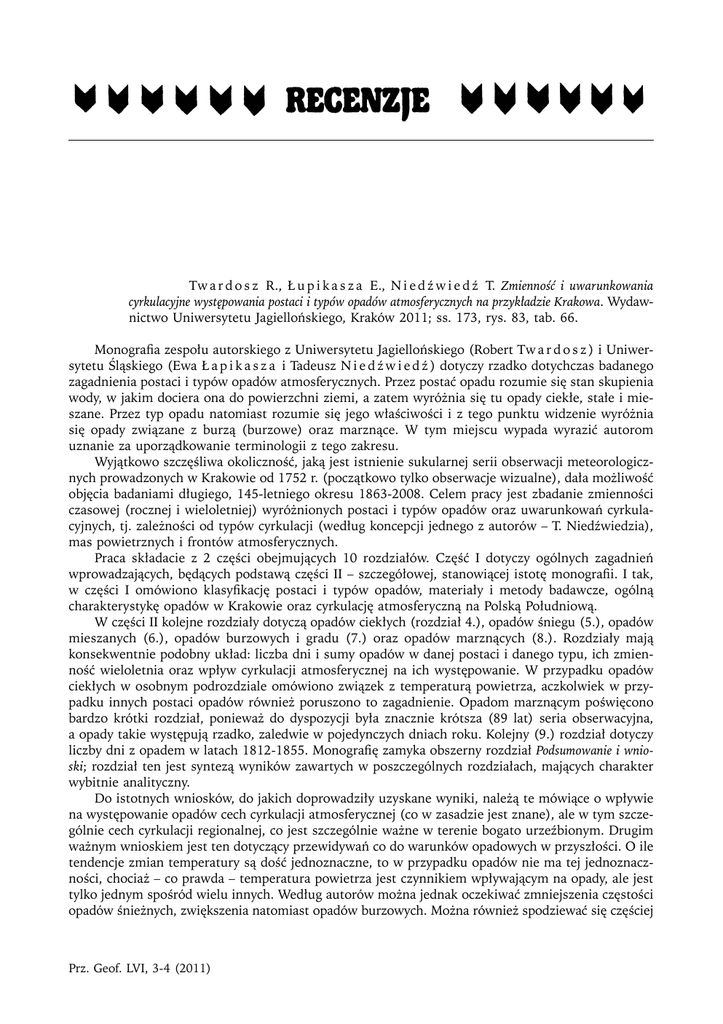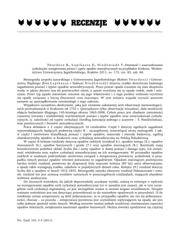 Tw a r d o s z R., Ł u p i k a s z a E., N i e d ź w i e d ź T. Zmienność i uwarunkowania cyrkulacyjne występowania postaci i typów opadów atmosferycznych na przykładzie Krakowa. Wydawnictwo Uniwersytetu Jagiellońskiego, Kraków 2011; ss. 173, rys. 83, tab. 66. Monografia zespołu autorskiego z Uniwersytetu Jagiellońskiego (Robert Tw a r d o s z ) i Uniwersytetu Śląskiego (Ewa Ł a p i k a s z a i Tadeusz N i e d ź w i e d ź ) dotyczy rzadko dotychczas badanego zagadnienia postaci i typów opadów atmosferycznych. Przez postać opadu rozumie się stan skupienia wody, w jakim dociera ona do powierzchni ziemi, a zatem wyróżnia się tu opady ciekłe, stałe i mieszane. Przez typ opadu natomiast rozumie się jego właściwości i z tego punktu widzenie wyróżnia się opady związane z burzą (burzowe) oraz marznące. W tym miejscu wypada wyrazić autorom uznanie za uporządkowanie terminologii z tego zakresu. Wyjątkowo szczęśliwa okoliczność, jaką jest istnienie sukularnej serii obserwacji meteorologicznych prowadzonych w Krakowie od 1752 r. (początkowo tylko obserwacje wizualne), dała możliwość objęcia badaniami długiego, 145-letniego okresu 1863-2008. Celem pracy jest zbadanie zmienności czasowej (rocznej i wieloletniej) wyróżnionych postaci i typów opadów oraz uwarunkowań cyrkulacyjnych, tj. zależności od typów cyrkulacji (według koncepcji jednego z autorów – T. Niedźwiedzia), mas powietrznych i frontów atmosferycznych. Praca składacie z 2 części obejmujących 10 rozdziałów. Część I dotyczy ogólnych zagadnień wprowadzających, będących podstawą części II – szczegółowej, stanowiącej istotę monografii. I tak, w części I omówiono klasyfikację postaci i typów opadów, materiały i metody badawcze, ogólną charakterystykę opadów w Krakowie oraz cyrkulację atmosferyczną na Polską Południową. W części II kolejne rozdziały dotyczą opadów ciekłych (rozdział 4.), opadów śniegu (5.), opadów mieszanych (6.), opadów burzowych i gradu (7.) oraz opadów marznących (8.). Rozdziały mają konsekwentnie podobny układ: liczba dni i sumy opadów w danej postaci i danego typu, ich zmienność wieloletnia oraz wpływ cyrkulacji atmosferycznej na ich występowanie. W przypadku opadów ciekłych w osobnym podrozdziale omówiono związek z temperaturą powietrza, aczkolwiek w przypadku innych postaci opadów również poruszono to zagadnienie. Opadom marznącym poświęcono bardzo krótki rozdział, ponieważ do dyspozycji była znacznie krótsza (89 lat) seria obserwacyjna, a opady takie występują rzadko, zaledwie w pojedynczych dniach roku. Kolejny (9.) rozdział dotyczy liczby dni z opadem w latach 1812-1855. Monografię zamyka obszerny rozdział Podsumowanie i wnioski; rozdział ten jest syntezą wyników zawartych w poszczególnych rozdziałach, mających charakter wybitnie analityczny. Do istotnych wniosków, do jakich doprowadziły uzyskane wyniki, należą te mówiące o wpływie na występowanie opadów cech cyrkulacji atmosferycznej (co w zasadzie jest znane), ale w tym szczególnie cech cyrkulacji regionalnej, co jest szczególnie ważne w terenie bogato urzeźbionym. Drugim ważnym wnioskiem jest ten dotyczący przewidywań co do warunków opadowych w przyszłości. O ile tendencje zmian temperatury są dość jednoznaczne, to w przypadku opadów nie ma tej jednoznaczności, chociaż – co prawda – temperatura powietrza jest czynnikiem wpływającym na opady, ale jest tylko jednym spośród wielu innych. Według autorów można jednak oczekiwać zmniejszenia częstości opadów śnieżnych, zwiększenia natomiast opadów burzowych. Można również spodziewać się częściej Prz. Geof. LVI, 3-4 (2011) 318 Recenzje sytuacji skrajnych, tzn. zarówno niedostatku opadów i w konsekwencji susz, jak i nadmiaru – i w wyniku powodzi; próbkę tego otrzymaliśmy już w bieżącym wieku. Monografia jest bardzo interesująca, jest bowiem pierwszym w Polsce opracowaniem na ten temat i to opartym na długiej, prawie półtorawiekowej serii pomiarowej, wykonanym szczegółowo i wnikliwie. I należy dodać – napisanym dobrą, poprawną polszczyzną, co jest prawdziwym ewenementem we współczesnej polskiej literaturze klimatologicznej (i nie tylko...). Urszula Kossowska-Cezak Häckel H. Pogoda i klimat. MULTICO Oficyna Wydawnicza, Warszawa 2009; ss. 336, rys. fot. W ciągu ostatniego ćwierćwiecza polski czytelnik otrzymuje do rąk trzecią publikację po tym samym tytułem Pogoda i klimat, opracowaną przez różnych autorów. Najstarsza z nich, autorstwa Zofii K a c z o r o w s k i e j (1986, Wydawnictwa Szkolni i Pedagogiczne), była książką pomocniczą dla nauczycieli, a jej wysoki poziom sprawiał, że przez wiele lat była ona powszechnie używana przez studentów mających w programie meteorologię i klimatologię jako pełnowartościowy podręcznik. W roku 2000 Świat Książki opublikował pod takim samym tytułem książkę popularnonaukową Güntera D. R o t h a , która w oryginale nosi tytuł Wetterkude für alle, a więc Meteorologia dla wszystkich. To odejście od tytułu oryginału nie ma tu jednak uzasadnienia. Książka dotyczy wyłącznie meteorologii, a zamieszczone na końcu dwie schematyczne mapki (a właściwie prymitywne obrazki) dotyczące warunków opadowych i termicznych na Ziemi, stanowiące ukłon w stronę klimatologii, w żaden sposób nie uzasadniają wprowadzenia pojęcia „klimat” do tytułu książki, czyniąc go w ten sposób nierzetelnym. I wreszcie w 2009 r. Oficyna Wydawnicza MULTICO wydała książkę znanego meteorologa niemieckiego Hansa H ä c k e l a , która w oryginale jest zatytułowana Wetter und Klimaphänomene, a zatem Pogoda i zjawiska klimatyczne. Tytuł tłumaczenia można by zatem uznać za bliższy oryginałowi, gdyby nie fakt, że w polskiej terminologii nie istnieje zdefiniowane pojęcie zjawiska klimatycznego. Prześledźmy zatem treść książki H. 